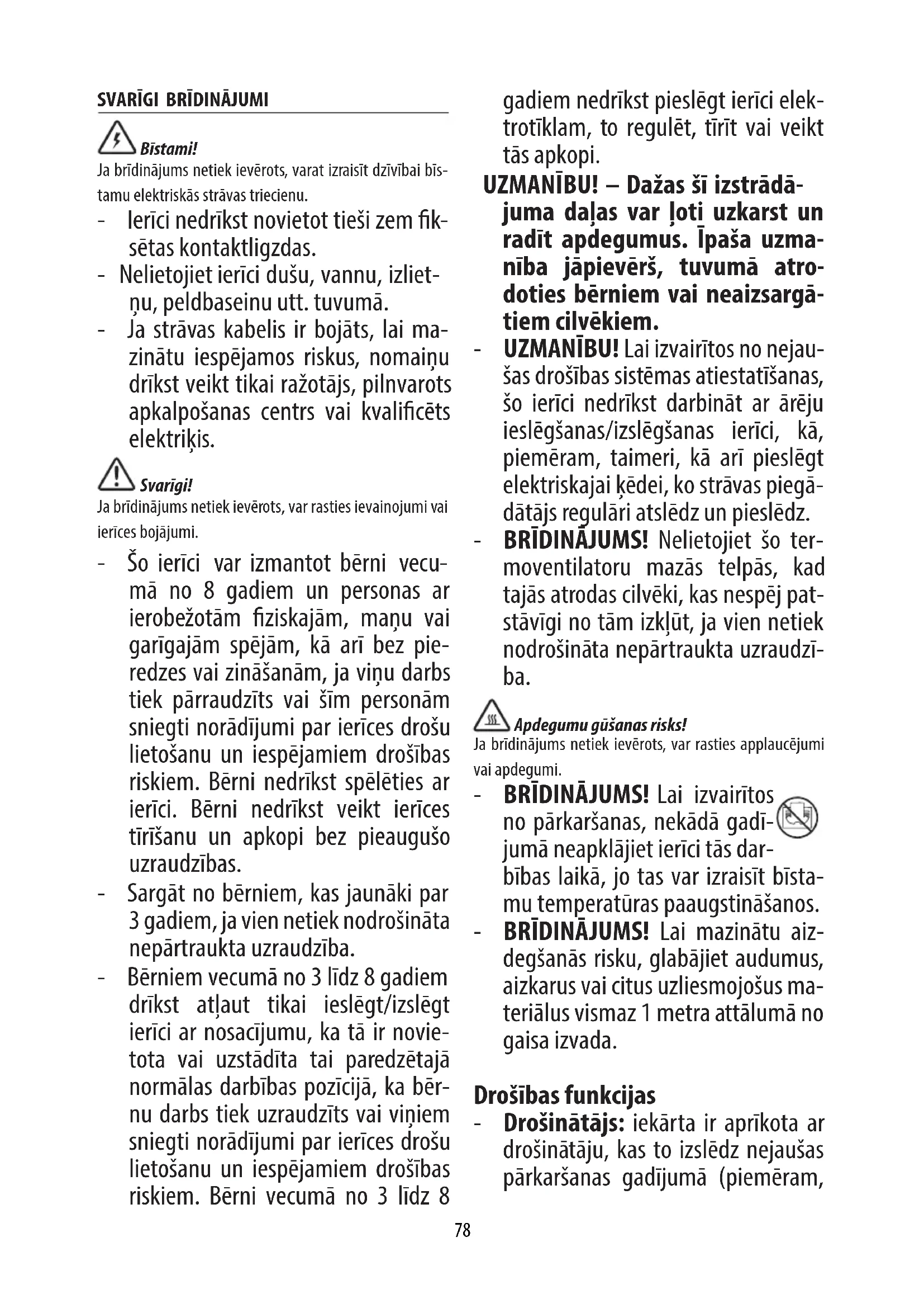 - Pirms ierīces atstāšanas pārliecinie- ties, ka tā ir pilnībā izslēgta un at- vienota no elektrotīkla. Neglabājiet putekļainā vidē. - Nenovietojiet neko uz ierīces. - Ierīci nedrīkst pakārt. - Daži modeļi ir aprīkoti ar ierīci, kas dažas sekundes aizkavē ventilatora izslēgšanos. - Nelietojiet ierīce veļas žāvēšanai. Nenosprostojiet gaisa ievades un izvades zonu (pārkaršanas risks). - Tikai veļas žāvētājiem: šī ierīce ir paredzēta tikai ūdenī mazgātu tek- stilizstrādājumu žāvēšanai. Svarīgi! - Brīdinājums. Uzglabājiet baterijas bērniem nepieejamā vietā. - Bateriju norīšanas gadījumā tikai 2 stundu laikā ķī misko apdegumu vai iespējamas barības vada pār- duršanas dēļ var rasties nopietni vai nāvējoši ievainojumi. - Pārbaudiet ierīces un pārliecinieties, ka bateriju nodalījums ir pareizi aiz- vērts. Neizmantojiet, ja nodalījums nav aizvērts. - No izlietotajām pogveida baterijām jāatbrīvojas nekavējoties un drošā veidā. Tukšas baterijas joprojām var būt bīstamas. Svarīgi drošības brīdinājumi Cienījamais klient, ierīces kontaktdakša lietošanas laikā uzkarst. Tas ir pilnībā normāli. Šī LIELJAUDAS SILDIERĪCE atbilst mūsu ierasti augstajiem standartiem. Tomēr, lai izvairītos no nejaušas pārkaršanas, jums vajadzētu pārliecināties, ka jūsu kontaktligzda ir labā stāvoklī un ka ierīces kontaktdakša ir iesprausta kontaktligzdā pareizi. Ja ierīce tiek izmantota ilgākus laika periodus, mēs iesakām pārbaudīt kontaktdakšu un80 elektrotīkla kontaktligzdu regulāri. Šaubu gadījumā sazinieties ar elektriķi. Attiecas tikai uz valstīm, kuras nav Eiro- pas Savienībā. Šo ierīci nevar izmantot personas (to- starp bērni) ar ierobežotām ziskajām, maņu vai garīgajām spējām, kā arī bez pieredzes vai zināšanām, ja vien šīm personām nav nodrošināta uzraudzība vai sniegtas instrukcijas par ierīces lie- tošanu. Bērni ir jāuzrauga, lai tie nespē- lētos ar ierīci. Atbrīvošanās no ierīces No ierīces nedrīkst atbrīvoties kopā ar mājsaimniecības atkri- tumiem, tā jānogādā pilnvarotā atkritumu šķirošanas un otrreizējās pārstrādes centrā.81