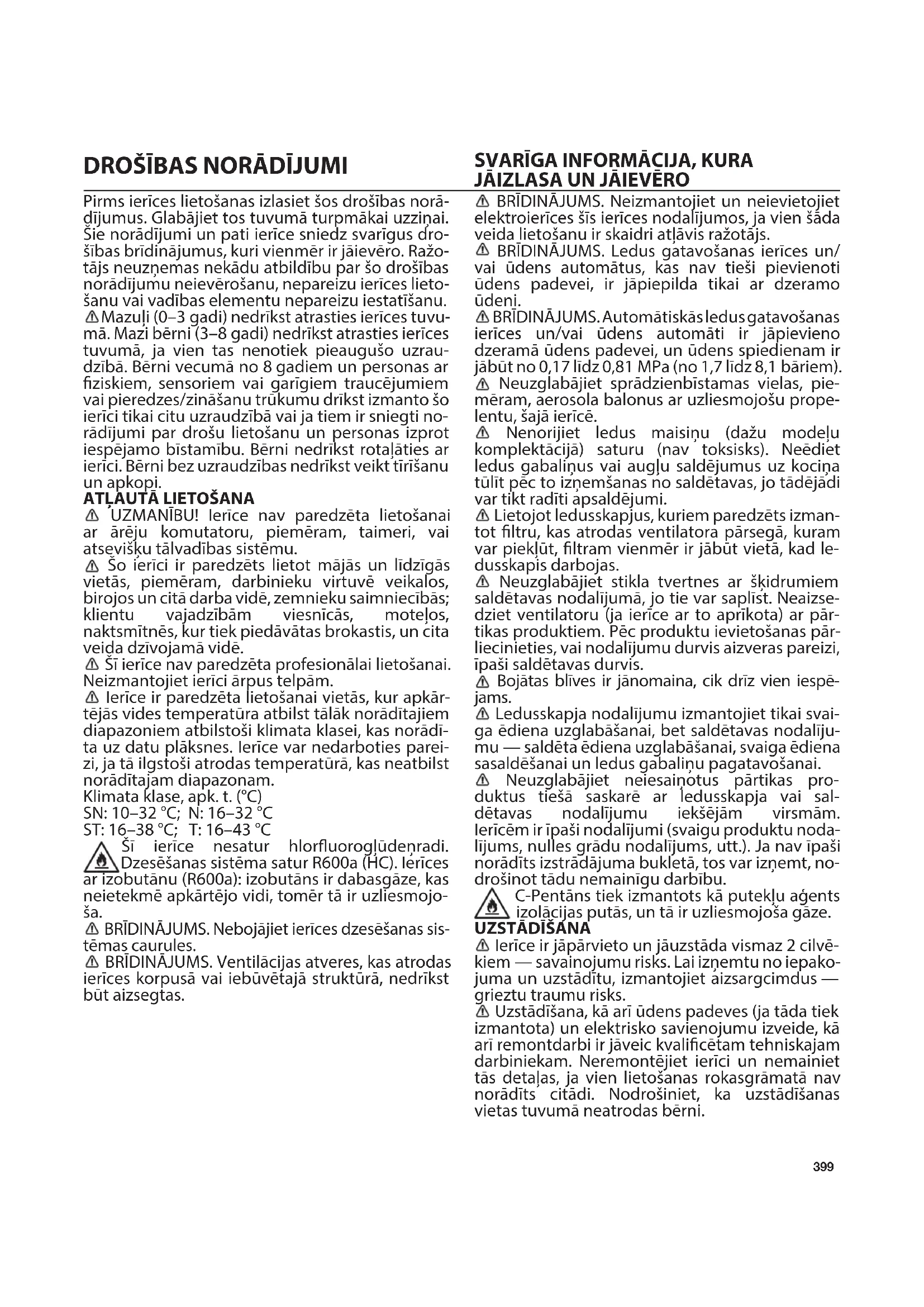 BRĪDINĀJUMS. Neizmantojiet un neievietojiet elektroierīces šīs ierīces nodalījumos, ja vien šāda veida lietošanu ir skaidri atļāvis ražotājs. BRĪDINĀJUMS. Ledus gatavošanas ierīces un/ vai ūdens automātus, kas nav tieši pievienoti ūdens padevei, ir jāpiepilda tikai ar dzeramo ūdeni. BRĪDINĀJUMS. Automātiskās ledus gatavošanas ierīces un/vai ūdens automāti ir jāpievieno dzeramā ūdens padevei, un ūdens spiedienam ir jābūt no 0,17 līdz 0,81MPa (no 1,7 līdz 8,1bāriem). Neuzglabājiet sprādzienbīstamas vielas, pie- mēram, aerosola balonus ar uzliesmojošu prope- lentu, šajā ierīcē. Nenorijiet ledus maisiņu (dažu modeļu komplektācijā) saturu (nav toksisks). Neēdiet ledus gabaliņus vai augļu saldējumus uz kociņa tūlīt pēc to izņemšanas no saldētavas, jo tādējādi var tikt radīti apsaldējumi. Lietojot ledusskapjus, kuriem paredzēts izman- tot ltru, kas atrodas ventilatora pārsegā, kuram var piekļūt, ltram vienmēr ir jābūt vietā, kad le- dusskapis darbojas. Neuzglabājiet stikla tvertnes ar šķidrumiem saldētavas nodalījumā, jo tie var saplīst. Neaizse- dziet ventilatoru (ja ierīce ar to aprīkota) ar pār- tikas produktiem. Pēc produktu ievietošanas pār- liecinieties, vai nodalījumu durvis aizveras pareizi, īpaši saldētavas durvis. Bojātas blīves ir jānomaina, cik drīz vien iespē- jams. Ledusskapja nodalījumu izmantojiet tikai svai- ga ēdiena uzglabāšanai, bet saldētavas nodalīju- mu— saldēta ēdiena uzglabāšanai, svaiga ēdiena sasaldēšanai un ledus gabaliņu pagatavošanai. Neuzglabājiet neiesaiņotus pārtikas pro- duktus tiešā saskarē ar ledusskapja vai sal- dētavas nodalījumu iekšējām virsmām. Ierīcēm ir īpaši nodalījumi (svaigu produktu noda- lījums, nulles grādu nodalījums, utt.). Ja nav īpaši norādīts izstrādājuma bukletā, tos var izņemt, no- drošinot tādu nemainīgu darbību. C-Pentāns tiek izmantots kā putekļu aģents izolācijas putās, un tā ir uzliesmojoša gāze.