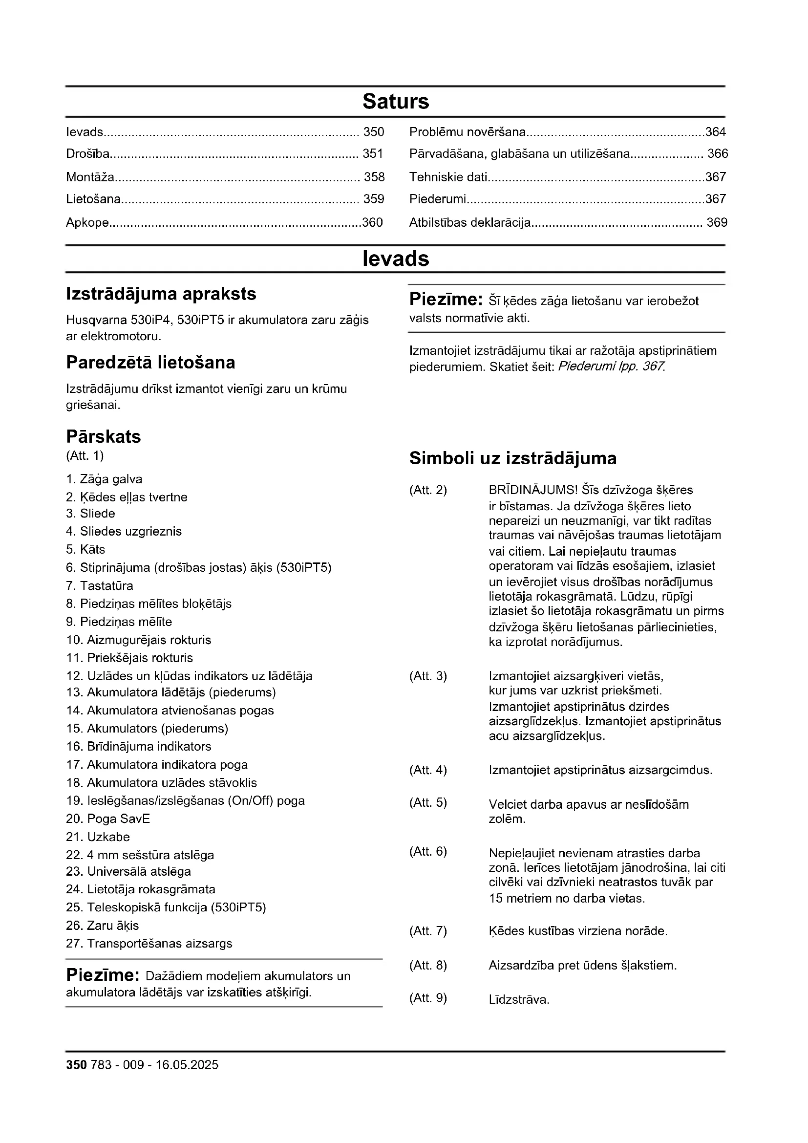 Piezīme: Dažādiem modeļiem akumulators un akumulatora lādētājs var izskatīties atšķirīgi. Simboli uz izstrādājuma (Att. 2) BRĪDINĀJUMS! Šīs dzīvžoga šķēres ir bīstamas. Ja dzīvžoga šķēres lieto nepareizi un neuzmanīgi, var tikt radītas traumas vai nāvējošas traumas lietotājam vai citiem. Lai nepieļautu traumas operatoram vai līdzās esošajiem, izlasiet un ievērojiet visus drošības norādījumus lietotāja rokasgrāmatā. Lūdzu, rūpīgi izlasiet šo lietotāja rokasgrāmatu un pirms dzīvžoga šķēru lietošanas pārliecinieties, ka izprotat norādījumus. (Att. 3) Izmantojiet aizsargķiveri vietās, kur jums var uzkrist priekšmeti. Izmantojiet apstiprinātus dzirdes aizsarglīdzekļus. Izmantojiet apstiprinātus acu aizsarglīdzekļus. (Att. 4) Izmantojiet apstiprinātus aizsargcimdus. (Att. 5) Velciet darba apavus ar neslīdošām zolēm. (Att. 6) Nepieļaujiet nevienam atrasties darba zonā. Ierīces lietotājam jānodrošina, lai citi cilvēki vai dzīvnieki neatrastos tuvāk par 15 metriem no darba vietas. (Att. 7) Ķēdes kustības virziena norāde. (Att. 8) Aizsardzība pret ūdens šļakstiem. (Att. 9) Līdzstrāva. 350 783 - 009 - 16.05.2025(Att. 10) Raugieties, lai ķermeņa daļas neatrastos karstu virsmu tuvumā. (Att. 11) Ķēdes eļļas uzpilde un eļļas plūsmas regulēšana (Att. 12) Pļaušanas bloka darbības cikls, darbības laiks/dīkstāve. (Att. 13) Izstrādājumu vai iepakojumu nedrīkst izmest sadzīves atkritumos. Izstrādājums un tā iepakojums ir jānosūta uz atbilstošo elektrisko un elektronisko ierīču pārstrādes vietu. (Attiecas vienīgi uz Eiropu) (Att. 14) Pirms tehniskās apkopes atvienojiet akumulatoru. (Att. 19) Šī ierīce nav elektriski izolēta. Ja izstrādājums saskaras ar augstsprieguma elektropārvades līnijām vai nonāk to tuvumā, tas var radīt smagas vai nāvējošas traumas. Elektrība no viena punkta uz otru var tikt pārvadīta ar elektrisko loku. Jo lielāks spriegums, jo tālāk elektriskā strāva var tikt pārvadīta. Elektrību var pārvadīt arī zari un citi priekšmeti, it īpaši, ja tie ir mitri. Nekad netuviniet ierīci tuvāk par 10 m no augstsprieguma līnijām un/vai priekšmetiem, kas tām pieskaras. Ja nepieciešams strādāt drošības zonā, pirms darba vienmēr sazinieties ar atbildīgo elektroapgādes uzņēmumu un pārliecinieties, ka barošana ir atslēgta. yyyywwxxxx Datu plāksnītē ir norādīts sērijas nu- murs. yyyy ir ražošanas gads, ww ir ražošanas nedēļa, xxxx ir kārtas nu- murs. (Att. 15) Izstrādājums atbilst spēkā esošo EK direktīvu prasībām. Piezīme: Pārējie uz izstrādājuma norādītie simboli/ norādes atbilst atsevišķu reģionu sertifikācijas prasībām. Simboli uz akumulatora un/vai akumulatora lādētāja (Att. 20) Utilizējiet šo izstrādājumu elek- trisko un elektronisko ierīču pārstrādes uzņēmumā. (Attie- cas vienīgi uz Eiropu) (Att. 16) Bezatteices transformators. (Att. 17) Lietojiet un uzglabājiet akumulatoru lādētāju tikai iekštelpās. (Att. 18) Dubultā izolācija. Drošība Drošības definīcijas Brīdinājumi, norādes “Uzmanību!” un piezīmes tiek izmantotas, lai izceltu īpaši svarīgas lietotāja rokasgrāmatas daļas. BRĪDINĀJUMS: Tiek izmantota tad, ja rokasgrāmatā sniegto instrukciju neievērošanas dēļ operatoram vai blakus esošajām personām draud traumu vai nāves risks. IEVĒROJIET: Tiek izmantota tad, ja rokasgrāmatā sniegto instrukciju neievērošanas dēļ rodas izstrādājuma, citu materiālu vai blakus esošās teritorijas bojājuma risks. Piezīme: Tiek izmantota, lai sniegtu plašāku informāciju, kas nepieciešama attiecīgajā situācijā. Vispārīgie drošības norādījumi elektroinstrumentiem BRĪDINĀJUMS: Izlasiet visus drošības brīdinājumus, norādījumus, apskatiet ilustrācijas un tehniskos datus, kas iekļauti šī trimera komplektā. Turpmāk norādīto brīdinājumu un norādījumu neievērošana var radīt strāvas