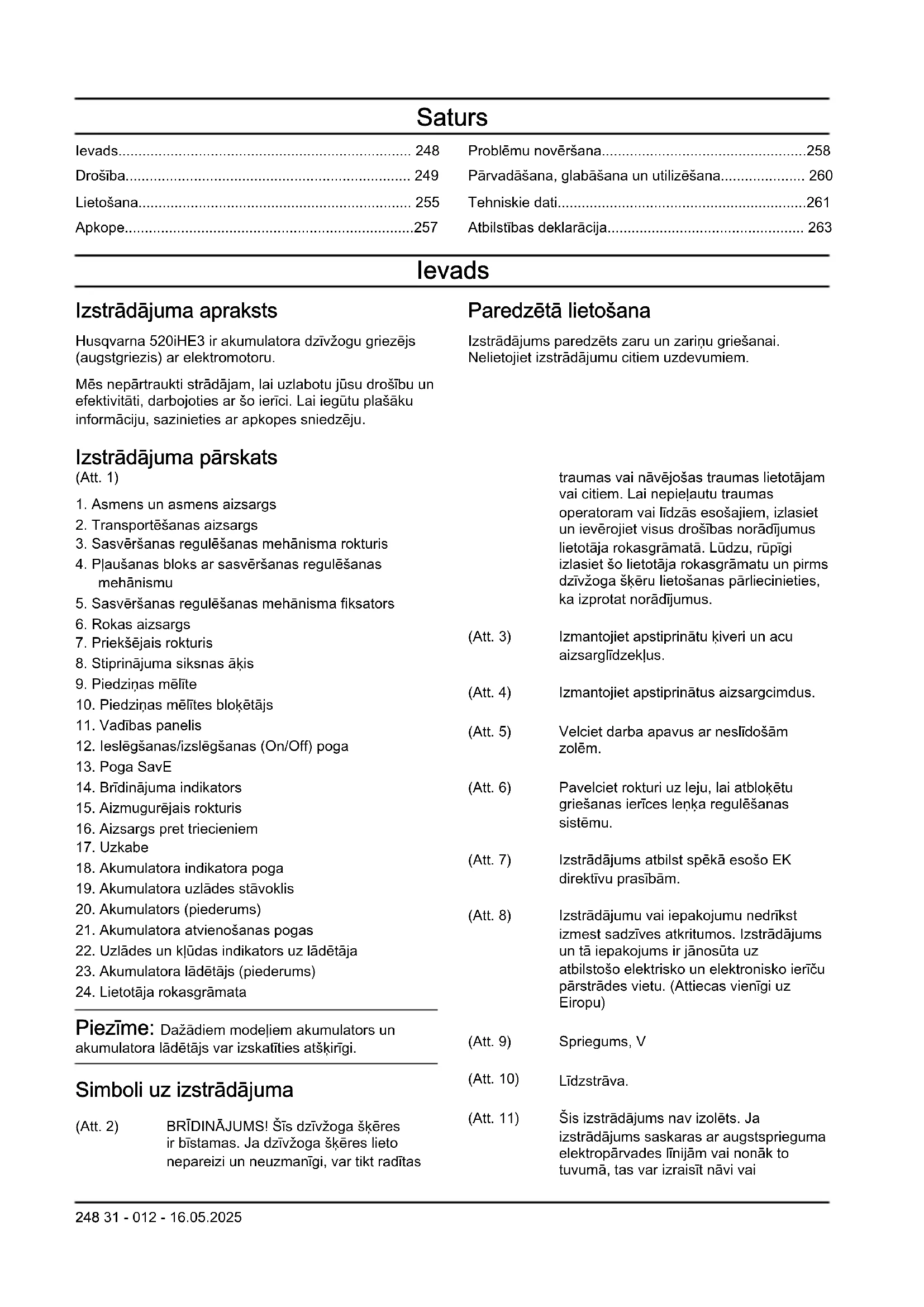 Piezīme: Dažādiem modeļiem akumulators un akumulatora lādētājs var izskatīties atšķirīgi. Simboli uz izstrādājuma (Att. 2) BRĪDINĀJUMS! Šīs dzīvžoga šķēres ir bīstamas. Ja dzīvžoga šķēres lieto nepareizi un neuzmanīgi, var tikt radītas traumas vai nāvējošas traumas lietotājam vai citiem. Lai nepieļautu traumas operatoram vai līdzās esošajiem, izlasiet un ievērojiet visus drošības norādījumus lietotāja rokasgrāmatā. Lūdzu, rūpīgi izlasiet šo lietotāja rokasgrāmatu un pirms dzīvžoga šķēru lietošanas pārliecinieties, ka izprotat norādījumus. (Att. 3) Izmantojiet apstiprinātu ķiveri un acu aizsarglīdzekļus. (Att. 4) Izmantojiet apstiprinātus aizsargcimdus. (Att. 5) Velciet darba apavus ar neslīdošām zolēm. (Att. 6) Pavelciet rokturi uz leju, lai atbloķētu griešanas ierīces leņķa regulēšanas sistēmu. (Att. 7) Izstrādājums atbilst spēkā esošo EK direktīvu prasībām. (Att. 8) Izstrādājumu vai iepakojumu nedrīkst izmest sadzīves atkritumos. Izstrādājums un tā iepakojums ir jānosūta uz atbilstošo elektrisko un elektronisko ierīču pārstrādes vietu. (Attiecas vienīgi uz Eiropu) (Att. 9) Spriegums, V (Att. 10) Līdzstrāva. (Att. 11) Šis izstrādājums nav izolēts. Ja izstrādājums saskaras ar augstsprieguma elektropārvades līnijām vai nonāk to tuvumā, tas var izraisīt nāvi vai 248 31 - 012 - 16.05.2025nopietnas traumas. Elektriskā strāva no viena punkta uz otru var tikt pārnesta ar elektriskā loka palīdzību. Jo augstāks ir spriegums, jo lielāks ir attālums, kādā var tikt pārnesta strāva. Elektriskā strāva var tikt pārvadīta arī ar zaru un citu priekšmetu palīdzību, sevišķi, ja tie ir mitri. Nodrošiniet, lai attālums starp izstrādājumu un augstsprieguma elektropārvades līniju un/vai priekšmetiem, kas ir saskarē ar to, vienmēr būtu vismaz 10m. Ja nepieciešams strādāt drošības zonā, pirms darba vienmēr sazinieties ar atbildīgo elektrokompāniju un pārliecinieties, ka elektrības padeve ir atslēgta. Darba laikā ievērojiet vismaz 15m attālumu līdz citām personām vai dzīvniekiem. (Att. 12) Aizsardzība pret ūdens šļakstiem. (Att. 13) Pļaušanas bloka darbības cikls, darbības laiks/dīkstāve. yyyywwxxxx Datu plāksnītē ir norādīts sērijas nu- murs. yyyy ir ražošanas gads, ww ir ražošanas nedēļa, xxxx ir kārtas nu- murs. Piezīme: Pārējie uz dzīvžoga šķērēm norādītie simboli/norādes atbilst noteiktu valstu sertifikācijas prasībām. Simboli uz akumulatora un/vai akumulatora lādētāja (Att. 17) Utilizējiet šo izstrādājumu elek- trisko un elektronisko ierīču pārstrādes uzņēmumā. (Attie- cas vienīgi uz Eiropu) (Att. 14) Bezatteices transformators. (Att. 15) Lietojiet un uzglabājiet akumulatoru lādētāju tikai iekštelpās. (Att. 16) Dubultā izolācija. Produkta bojājumi Mēs neatbildam par mūsu produkta bojājumiem, ja: