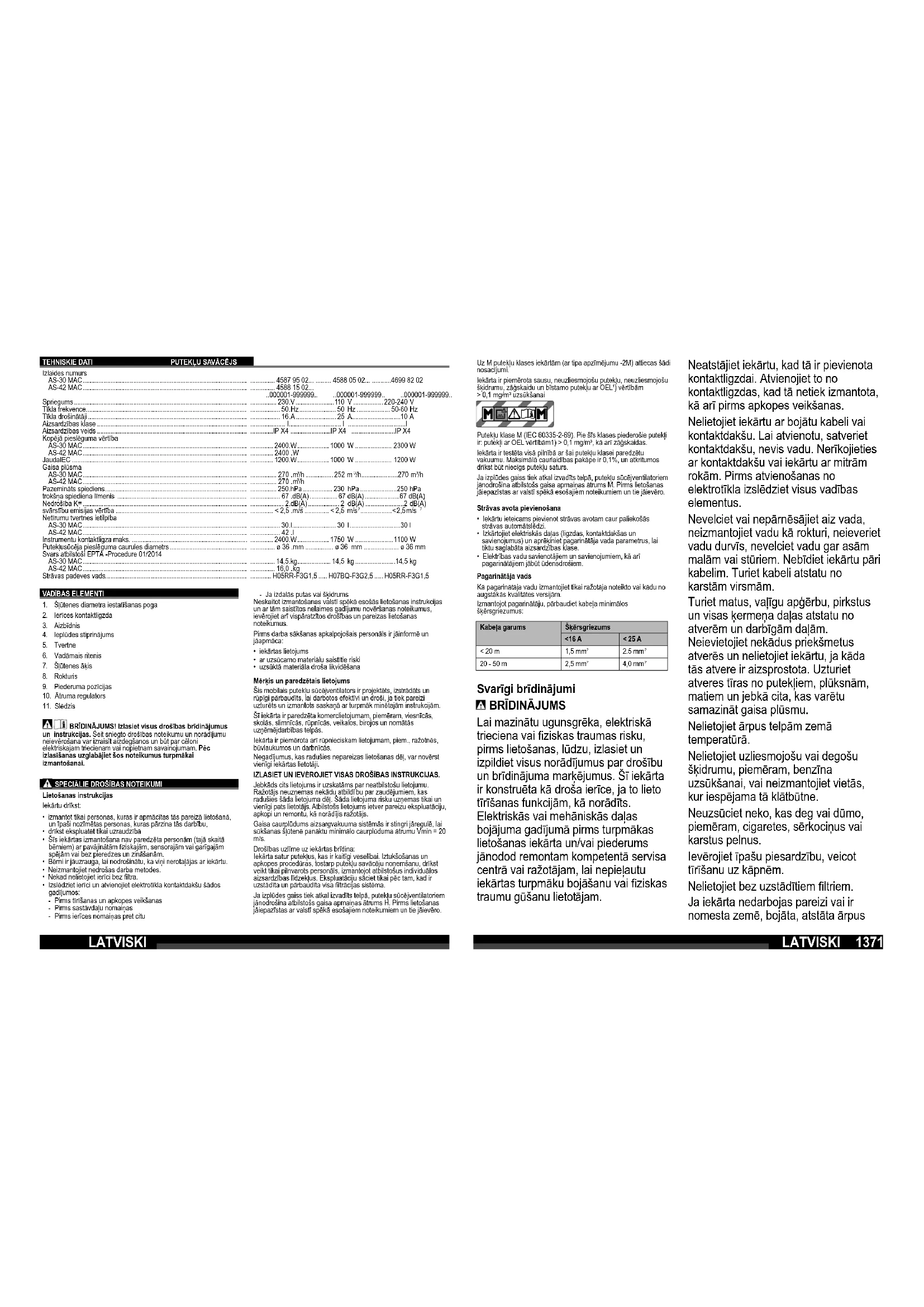 - uzsūktā materiāla droša likvidēšana Mērķis un paredzētais lietojums Šis mobilais putekļu sūcējventilators ir projektēts, izstrādāts un rūpīgi pārbaudīts, lai darbotos efektīvi un droši, ja tiek pareizi uztur ēts un izmantots saskaņā ar turpmāk minētajām instrukcijām. Šī iekārta ir paredzēta komerclietojumam, piemēram, viesnīcās, skolās, slimnīcās, rūpnīcās, veikalos, birojos un nomātās uzņēmējdarbības telpās. Iekārta ir piemērota arī rūpnieciskam lietojumam, piem., ražotnēs, būvlaukumos un darbnīcās. Negadījumus, kas radušies nepareizas lietošanas dēļ, var novērst vienīgi iekārtas lietotāji. IZLASIET UN IEVĒROJIET VISAS DROŠĪBAS INSTRUKCIJAS. Jebkāds cits lietojums ir uzskatāms par neatbilstošu lietojumu. Ražotājs neuzņemas nekādu atbildī bu par zaudējumiem, kas radušies šāda lietojuma dēļ. Šāda lietojuma risku uzņemas tikai un vienīgi pats lietotājs. Atbilstošs lietojums ietver pareizu ekspluatāciju, apkopi un remontu, kā norādījis ražotājs. Gaisa caurplūdums aizsargvakuuma sistēmās ir stingri jāregulē, lai sūkšanas šļūtenē panāktu minimālo caurplūduma ātrumu Vmin = 20 m/s. Drošības uzlīme uz iekārtas brīdina: Iekārta satur putekļus, kas ir kaitīgi veselībai. Iztukšošanas un apkopes procedūras, tostarp putekļu savācēju noņemšanu, drīkst veikt tikai pilnvarots personāls, izmantojot atbilstošus individuālos aizsardzības līdzekļus. Ekspluatāciju sāciet tikai pēc tam, kad ir uzstādīta un pārbaudīta visa fi ltrācijas sistēma. Ja izplūdes gaiss tiek atkal izvadīts telpā, putekļu sūcējventilatoriem jānodrošina atbilstošs gaisa apmaiņas ātrums H. Pirms lietošanas jāiepazīstas ar valstī spēkā esošajiem noteikumiem un tie jāievēro. Uz M putekļu klases iekārtām (ar tipa apzīmējumu -2M) attiecas šādi nosacījumi. Iekārta ir piemērota sausu, neuzliesmojošu putekļu, neuzliesmojošu šķidrumu, zāģskaidu un bīstamo putekļu ar OEL