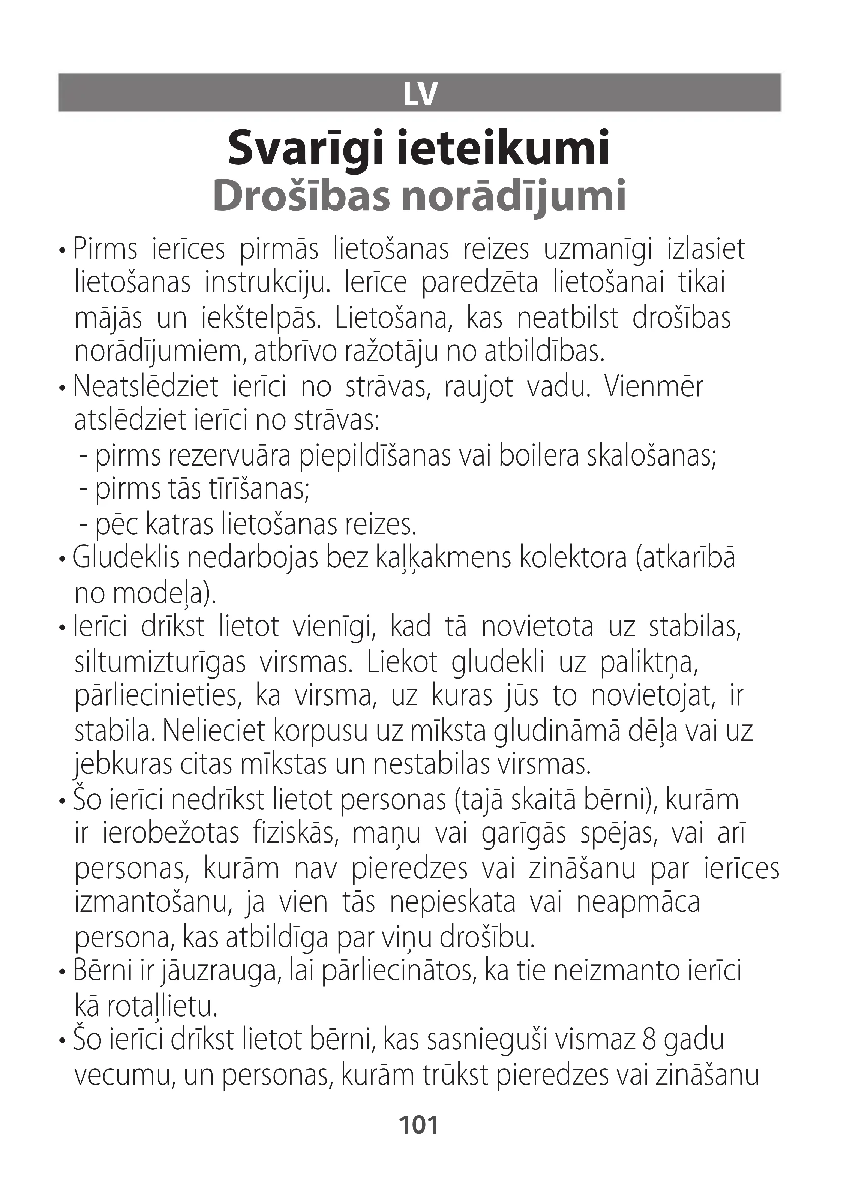- Pirms ierīces pirmās lietošanas reizes uzmanīgi izlasiet lietošanas instrukciju. Ierīce paredzēta lietošanai tikai mājās un iekštelpās. Lietošana, kas neatbilst drošības norādījumiem, atbrīvo ražotāju no atbildības.