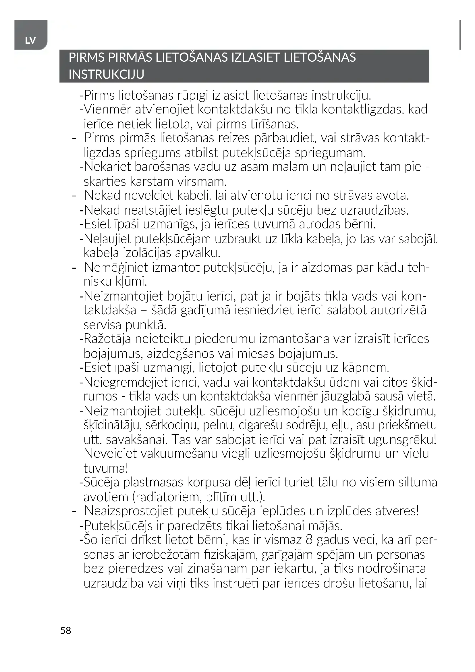 Putekļsūcēju izmantojiet kai iekštelpās un kai sausu virsmu rīšanai. Mitri izrītus paklājus pirms rīšanas ar putekļu sūcēju izžāvējiet.