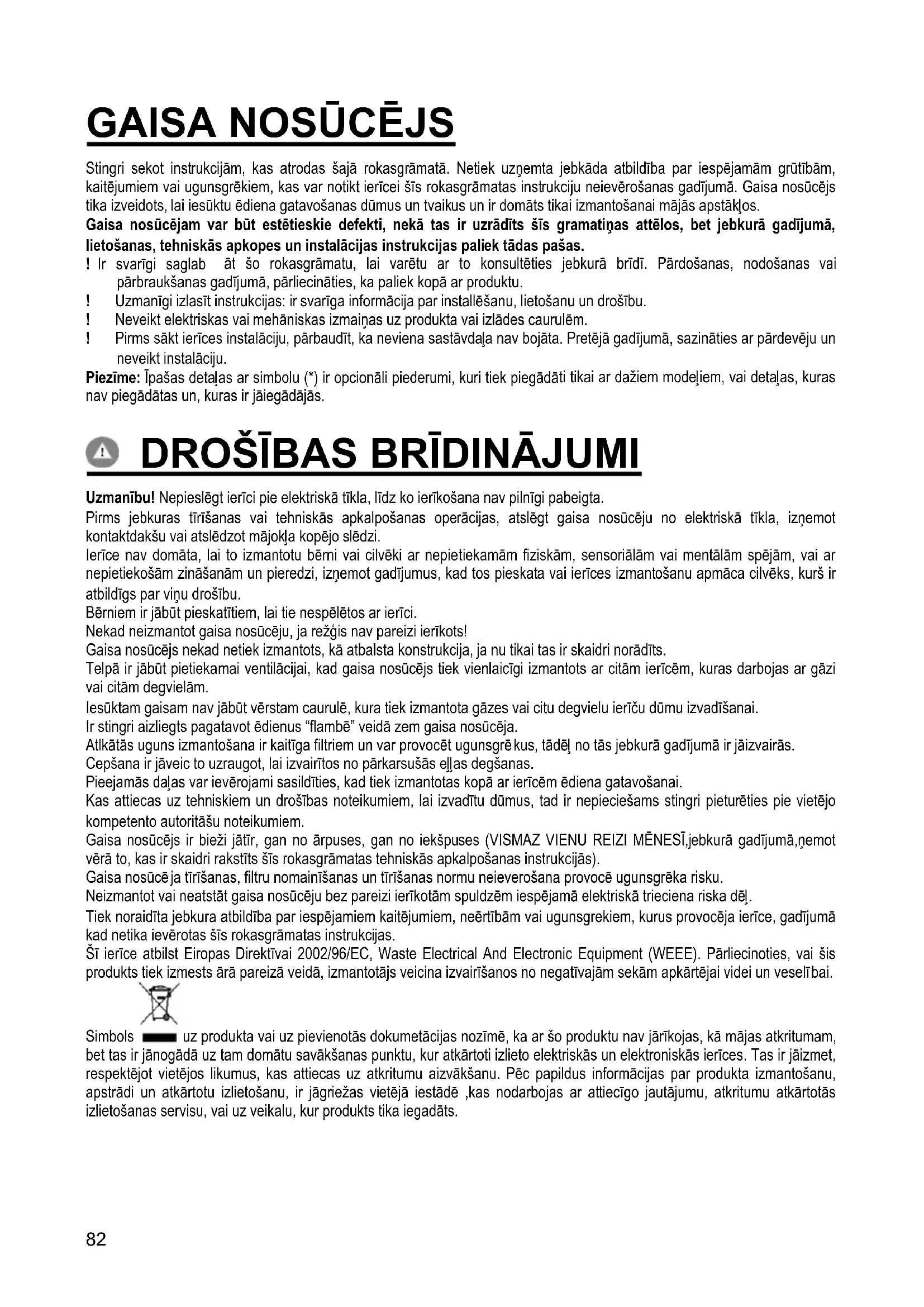 rniem ir jābūt pieskatītiem, lai tie nespēlētos ar ierīci. Nekad neizmantot gaisa nosūcēju, ja režģis nav pareizi ierīkots! Gaisa nosūcējs nekad netiek izmantots, kā atbalsta konstrukcija, ja nu tikai tas ir skaidri norādīts. Telpā ir jābūt pietiekamai ventilācijai, kad gaisa nosūcējs tiek vienlaicīgi izmantots ar citām ierīcēm, kuras darbojas ar gāzi vai citām degvielām. Iesūktam gaisam nav jābūt vērstam caurulē, kura tiek izmantota gāzes vai citu degvielu ierīču dūmu izvadīšanai. Ir stingri aizliegts pagatavot ēdienus “flambē” veidā zem gaisa nosūcēja. Atlkātās uguns izmantošana ir kaitīga filtriem un var provocēt ugunsgrē kus, tādēļ no tās jebkurā gadījumā ir jāizvairās. Cepšana ir jāveic to uzraugot, lai izvairītos no pārkarsušās eļļas degšanas. Pieejamās daļas var ievērojami sasildīties, kad tiek izmantotas kopā ar ierīcēm ēdiena gatavošanai. Kas attiecas uz tehniskiem un drošības noteikumiem, lai izvadītu dūmus, tad ir nepieciešams stingri pieturēties pie vietējo kompetento autoritāšu noteikumiem. Gaisa nosūcējs ir bieži jātīr, gan no ārpuses, gan no iekšpuses (VISMAZ VIENU REIZI MĒNESĪ,jebkurā gadījumā,ņemot vērā to, kas ir skaidri rakstīts šīs rokasgrāmatas tehniskās apkalpošanas instrukcijās). Gaisa nosūcē ja tīrīšanas, filtru nomainīšanas un tīrīšanas normu neieverošana provocē ugunsgrēka risku. Neizmantot vai neatstāt gaisa nosūcēju bez pareizi ierīkotām spuldzēm iespējamā elektriskā trieciena riska dēļ. Tiek noraidīta jebkura atbildība par iespējamiem kaitējumiem, neērtībām vai ugunsgrekiem, kurus provocēja ierīce, gadījumā kad netika ievērotas šīs rokasgrāmatas instrukcijas. Šī ierīce atbilst Eiropas Direktīvai 2002/96/EC, Waste Electrical And Electronic Equipment (WEEE). Pārliecinoties, vai šis produkts tiek izmests ārā pareizā veidā, izmantotājs veicina izvairīšanos no negatīvajām sekām apkārtējai videi un veselī bai. Simbols uz produkta vai uz pievienotās dokumetācijas nozīmē, ka ar šo produktu nav jārīkojas, kā mājas atkritumam, bet tas ir jānogādā uz tam domātu savākšanas punktu, kur atkārtoti izlieto elektriskās un elektroniskās ierīces. Tas ir jāizmet, respektējot vietējos likumus, kas attiecas uz atkritumu aizvākšanu. Pēc papildus informācijas par produkta izmantošanu, apstrādi un atkārtotu izlietošanu, ir jāgriežas vietējā iestādē ,kas nodarbojas ar attiecīgo jautājumu, atkritumu atkārtotās izlietošanas servisu, vai uz veikalu, kur produkts tika iegadāts.83 Ierīce ir izstrādāta, pārbaudīta un ražota atbilstoši šādām prasībām.