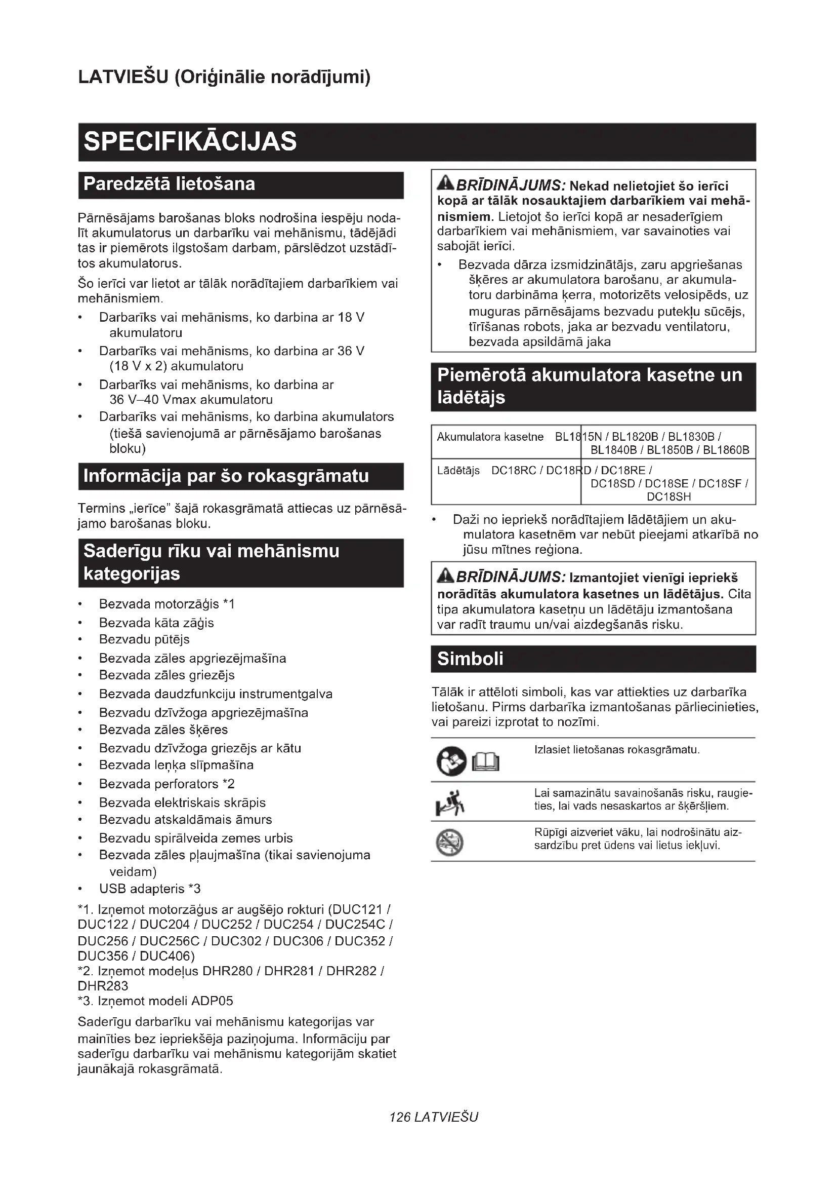 DUC356/DUC406) *2.IzņemotmodeļusDHR280/DHR281/DHR282/ DHR283 *3.IzņemotmodeliADP05 Saderīgudarbarīkuvaimehānismukategorijasvar mainītiesbeziepriekšējapaziņojuma.Informācijupar saderīgudarbarīkuvaimehānismukategorijāmskatiet jaunākajārokasgrāmatā. BRĪDINĀJUMS: Nekad nelietojiet šo ierīci kopā ar tālāk nosauktajiem darbarīkiem vai mehā- nismiem.Lietojotšoierīcikopāarnesaderīgiem darbarīkiemvaimehānismiem,varsavainotiesvai sabojātierīci.