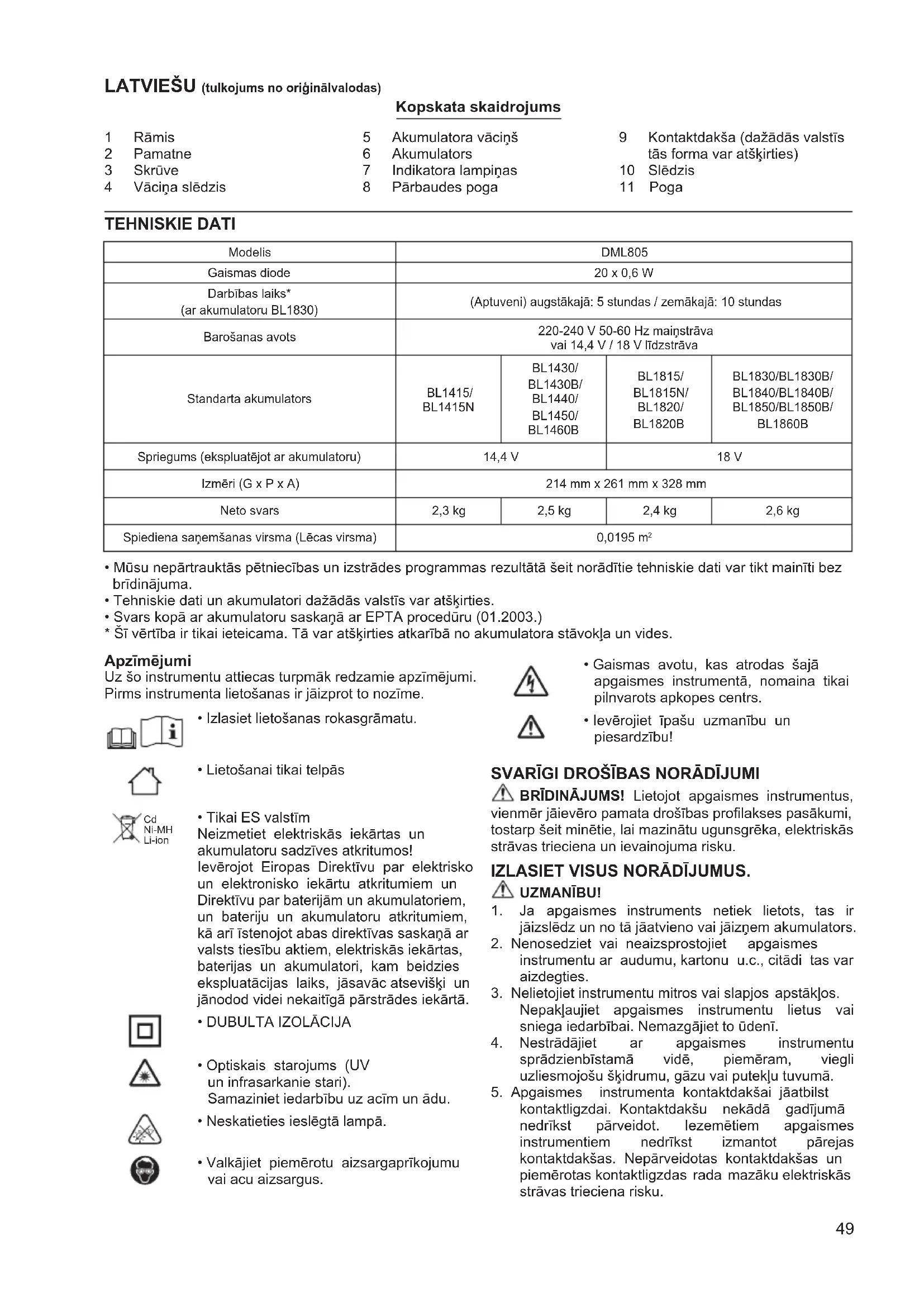 kontaktligzdai. Kontaktdakšu nekādā gadījumā nedrīkst pārveidot. Iezemētiem apgaismes instrumentiem nedrīkst izmantot pārejas kontaktdakšas. Nepārveidotas kontaktdakšas un piemērotas kontaktligzdas rada mazāku elektriskās strāvas trieciena risku. Modelis DML805 Gaismas diode 20 x 0,6 W Darbības laiks* (ar akumulatoru BL1830) (Aptuveni) augstākajā: 5 stundas / zemākajā: 10 stundas Barošanas avots 220-240 V 50-60 Hz maiņstrāva vai 14,4 V / 18 V līdzstrāva Standarta akumulators BL1415/ BL1415N BL1430/ BL1430B/ BL1440/ BL1450/ BL1460B BL1815/ BL1815N/ BL1820/ BL1820B BL1830/BL1830B/ BL1840/BL1840B/ BL1850/BL1850B/ BL1860B Spriegums (ekspluatējot ar akumulatoru) 14,4 V 18 V Izmēri (G x P x A) 214 mm x 261 mm x 328 mm Neto svars 2,3 kg 2,5 kg 2,4 kg 2,6 kg Spiediena saņemšanas virsma (Lēcas virsma) 0,0195 m