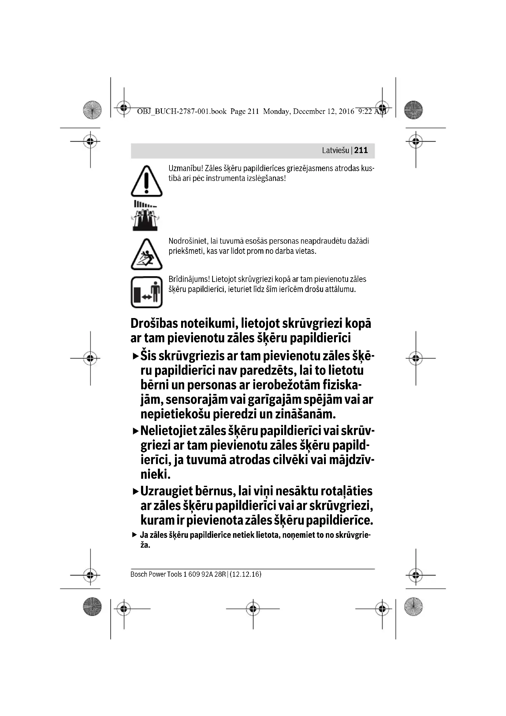 Montaaž Lõiketera ei ole vaja vahetada. Rohulõikeotsaku paigaldamine (vt jooniseid A1 – A2) – Enne rohulõikeotsaku 1 paigaldamist tuleb kruvikeeraja kummikate 9 suunaga ette maha tõmmata. – Suruge rohulõikeotsaku lukustuslüliti 8 alla. – Viige reverslüliti 6 keskasendisse. Rohulõikeotsak Grass Shear Tootenumber 1 600 A00 9V8 Lõikelaius mm 73 Kaal EPTA-Procedure 01:2014 järgi kg 0,27 OBJ_BUCH-2787-001.book Page 207 Monday, December 12, 2016 9:22 AM1 609 92A 28R | (12.12.16) Bosch Power Tools 208 | Eesti – Kinnitage rohulõikeotsak 1 koos monteeritud terakaitsmega 3 kruvikeera- ja külge. Rohulõikeotsak 1 peab kuuldavalt kohale fikseeruma! –Eemaldage terakaitse 3. Märkus: Rohulõikeotsakut 1 saate kinnitada 8 eri asendisse. See tagab opti- maalse tööasendi näiteks muruservade lõikamiseks. Lahtivõtmine (vt jooniseid B1–B2) – Suruge rohulõikeotsaku lukustuslüliti 8 alla. – Viige reverslüliti 6 keskasendisse. –Lükake terakaitse 3 lõiketera 2 peale (). Terakaitse 3 peab kuuldavalt kohale fikseeruma! –Keerake vabastusrõngast 5 pöörlemissuunas ja tõmmake rohulõikeot- sak 1 maha (). – Seejärel pange kummikate 9 uuesti kruvikeeraja peale. Kasutus Seadme kasutuselevõtt Rohulõikeotsakuga kruvikeeraja käestpanekul asetage see lõikete- rale. Nii hoiate ära niiskuse sissetungimise elektrilisse tööriista. Sisse-/väljalülitus – Tõmmake terakaitse 3 lõiketeralt 2 maha. – Rohulõikeotsakuga kruvikeeraja sisselülitamiseks vajutage lukustuslüliti 8 üles. – Reverslülitist 6 reguleerige välja pöörlemissuund. Rohulõikeotsak töötab päripäeva või vastupäeva. – Vajutage lülitile (sisse/välja) 7 ja hoidke seda all. – Rohulõikeotsaku väljalülitamiseks vabastage lüliti (sisse/välja) 7. – Viige reverslüliti 6 keskasendisse. – Viige lukustuslüliti 8 alla. – Torgake terakaitse 3 lõiketera 2 peale. Terakaitse 3 peab kuuldavalt koha- le fikseeruma! Servade lõikamine Juhtige rohulõikeotsakuga kruvikeerajat piki muruserva.Veenduge, et lõike- tera ei puutu kokku sillutiskividega pindade, kivide või aiamüüridega, kuna selle tagajärjel lüheneb lõiketera tööiga tunduvalt. Pärast kasutamist pange terakaitse uuesti lõiketerale peale. OBJ_BUCH-2787-001.book Page 208 Monday, December 12, 2016 9:22 AMEesti | 209 Bosch Power Tools 1 609 92A 28R | (12.12.16) Lõiketera blokeeringute eemaldamine Ärge kunagi eemaldage lõiketera küljest sinna kinni jäänud taimi, kui lõikete- ra töötab, ja ärge kunagi hoidke lõigatavat rohtu kinni, kui lõiketera töötab. Vabastage lüliti (sisse/välja) 7 ja viige lukustuslüliti 8 alla. Tähelepanu! Pärast rohulõikeotsakuga kruvikeeraja väljalülitamist jätkab lõiketera veel mõne sekundi jooksul liikumist. Ärge puudutage liikuvat lõiketera.Oodake, kuni lõiketera on seiskunud ja seejärel kõrvaldage blokeering. Hooldus ja teenindus Hooldus ja puhastus Rohulõikeotsakuga hooldus- või puhastustööde tegemisel kandke alati kaitsekindaid. Viige reverslüliti keskasendisse. Enne hooldus- ja puhastustöid vajutage lukustuslüliti alla ja võtke ro- hulõikeotsak kruvikeeraja küljest maha. Tõhusa ja ohutu töö tagamiseks hoidke lõiketera puhas. – Kontrollige rohulõikeotsakut 1 korrapäraselt ilmselgete defektide suhtes, nagu lahtised kinnitused või kulunud ja kahjustada saanud osad. – Puhastage rohulõikeotsakut 1 korrapäraselt pintsli või pehme harjaga ja pihustage lõiketerale 2 Bosch hooldusaerosooli. Ärge kasutage lahusteid ega poleerimisvahendeid! Lisatarvikud Klienditeenindus ja müügijärgne nõustamine Klienditeeninduses vastatakse toote paranduse ja hoolduse ning varuosade kohta esitatud küsimustele. Joonised ja teabe varuosade kohta leiate ka vee- bisaidilt: www.bosch-pt.com Boschi nõustajad osutavad Teile toodete ja tarvikute küsimustes meeleldi abi. Tootenumber Hooldusvahend, 250 ml 1 609 200 399 OBJ_BUCH-2787-001.book Page 209 Monday, December 12, 2016 9:22 AM1 609 92A 28R | (12.12.16) Bosch Power Tools 210 | Latviešu Päringute esitamisel ja varuosade tellimisel näidake kindlasti ära rohulõike- otsaku andmesildil olev 10-kohaline tootenumber. Eesti Vabariik Mercantile Group AS Boschi elektriliste käsitööriistade remont ja hooldus Pärnu mnt. 549 76401 Saue vald, Laagri Tel.: 6549 568 Faks: 679 1129 Kasutuskõlbmatuks muutunud seadmete käitlus Rohulõikeotsak, lisatarvikud ja pakendid tuleb keskkonnasäästlikult ringlus- se võtta. Ärge visake rohulõikeotsakut olmejäätmete hulka! Tootja jätab endale õiguse muudatuste tegemiseks. Latviešu Drošības noteikumi Simbolu skaidrojums Izlasiet visus zāles šķēru papildierīcei un izmantojamajam elektroinstrumentam pievienotos drošības noteikumus un norādījumus. Drošības noteikumu un norādījumu neievērošana var izraisīt aizdegšanos un būt par cēloni elektriskajam triecie- nam vai nopietnam savainojumam. Pēc izlasīšanas uzglabājiet šos noteikumus turpmākai izman- tošanai. Nelietojiet skrūvgriezi kopā ar zāles šķēru papildierīci lietū un ne- atstājiet to lietū. OBJ_BUCH-2787-001.book Page 210 Monday, December 12, 2016 9:22 AMLatviešu | 211 Bosch Power Tools 1 609 92A 28R | (12.12.16) Uzmanību! Zāles šķēru papildierīces griezējasmens atrodas kus- tībā arī pēc instrumenta izslēgšanas! Nodrošiniet, lai tuvumā esošās personas neapdraudētu dažādi priekšmeti, kas var lidot prom no darba vietas. Brīdinājums! Lietojot skrūvgriezi kopā ar tam pievienotu zāles šķēru papildierīci, ieturiet līdz šīm ierīcēm drošu attālumu. Drošības noteikumi, lietojot skrūvgriezi kopā ar tam pievienotu zāles šķēru papildierīci Šis skrūvgriezis ar tam pievienotu zāles šķē- ru papildierīci nav paredzēts, lai to lietotu bērni un personas ar ierobežotām fiziska- jām, sensorajām vai garīgajām spējām vai ar nepietiekošu pieredzi un zināšanām. Nelietojiet zāles šķēru papildierīci vai skrūv- griezi ar tam pievienotu z