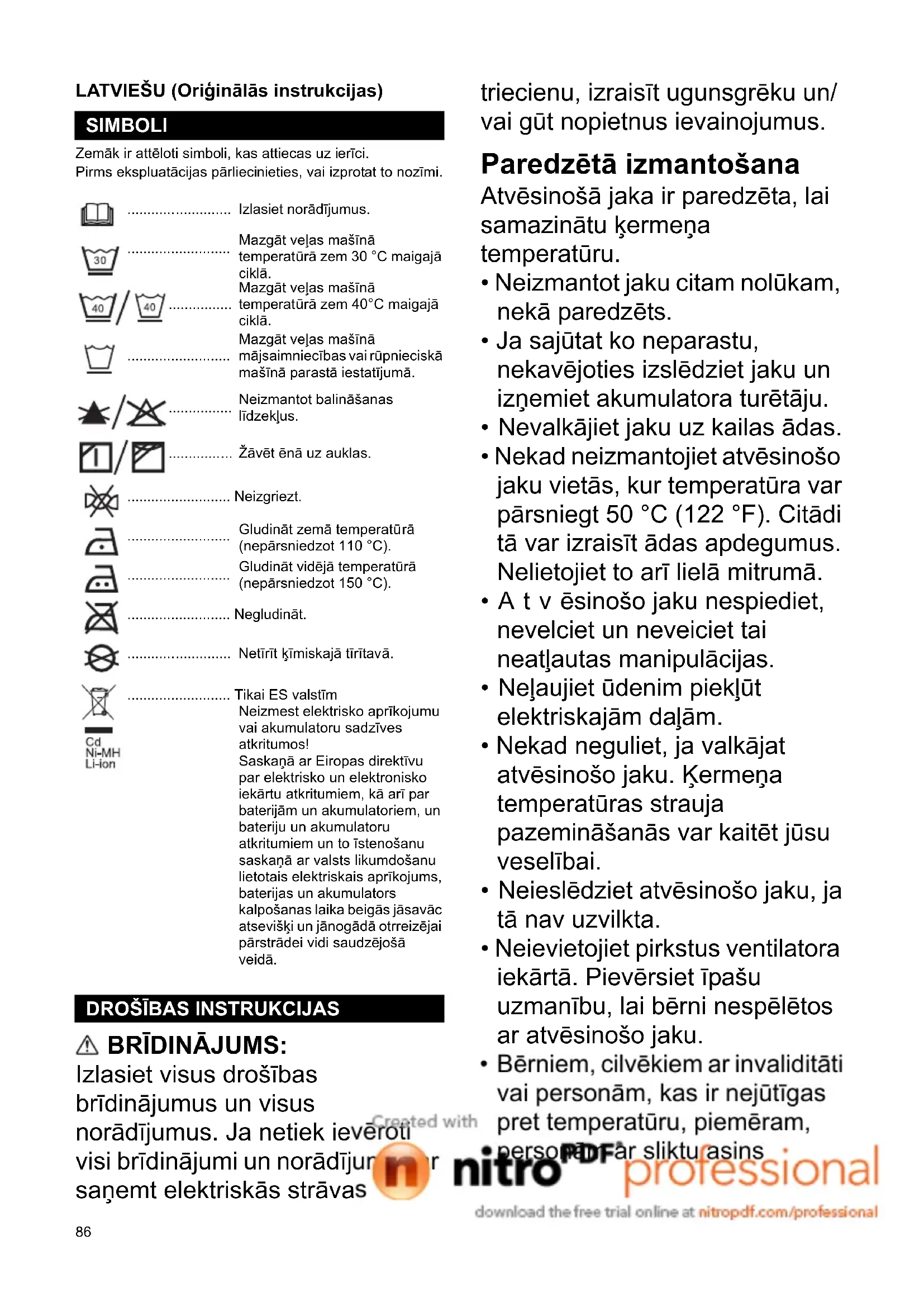 - Jotkin luettelossa mainitut varusteet voivat sisältyä työkalun toimitukseen vakiovarusteina. Ne voivat vaihdella maittain. YLLÄPITO LISÄVARUSTEET86 LATVIEŠU (Oriģinālās instrukcijas) Zemāk ir attēloti simboli, kas attiecas uz ierīci. Pirms ekspluatācijas pārliecinieties, vai izprotat to nozīmi. BRĪDINĀJUMS: Izlasiet visus drošības brīdinājumus un visus norādījumus. Ja netiek ievēroti visi brīdinājumi un norādījumi, var saņemt elektriskās strāvas triecienu, izraisīt ugunsgrēku un/ vai gūt nopietnus ievainojumus. Paredzētā izmantošana Atvēsinošā jaka ir paredzēta, lai samazinātu ķermeņa temperatūru.