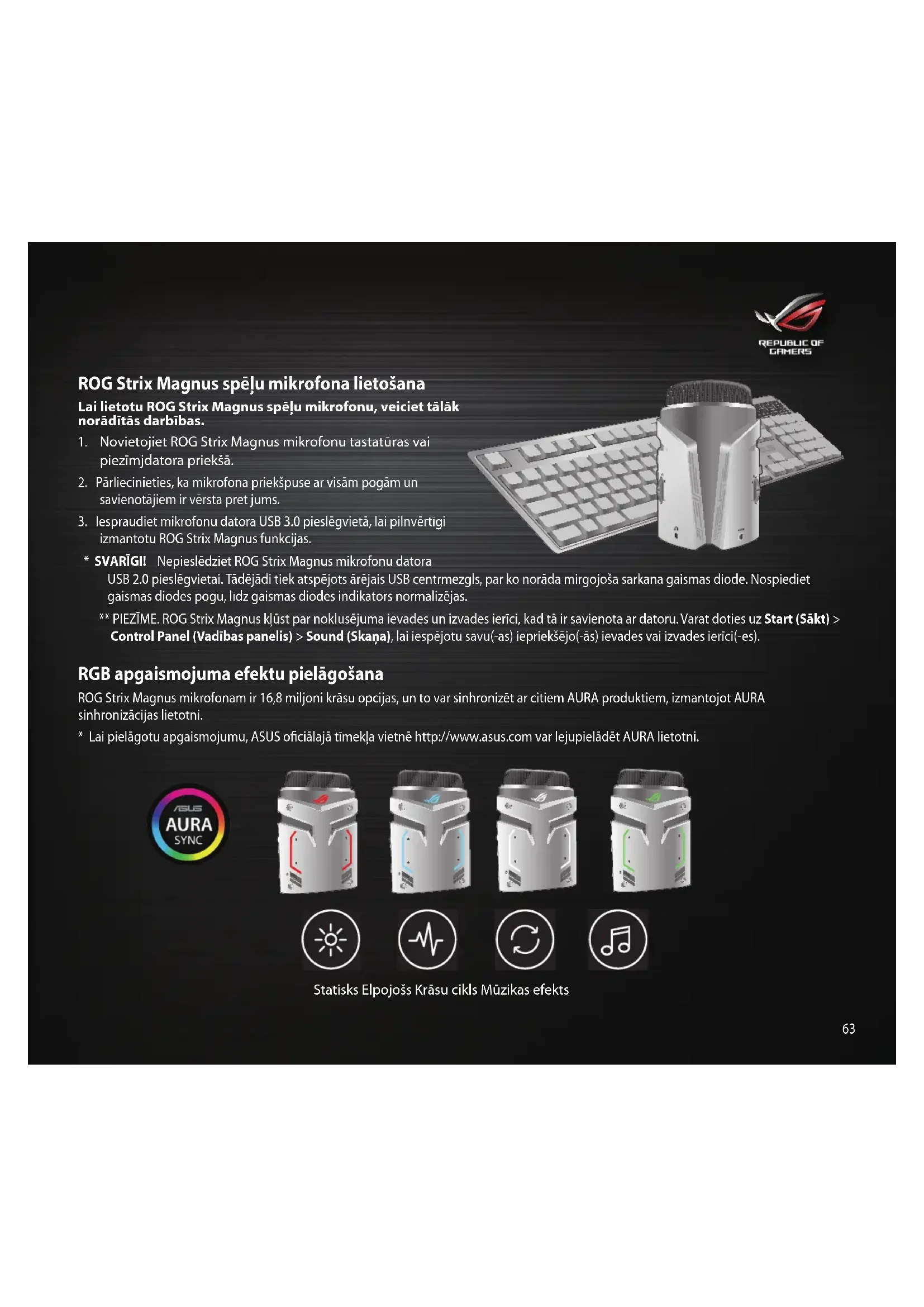 - SVARĪGI! Nepieslēdziet ROG Strix Magnus mikrofonu datora USB 2.0 pieslēgvietai. Tādējādi tiek atspējots ārējais USB centrmezgls, par ko norāda mirgojoša sarkana gaismas diode. Nospiediet gaismas diodes pogu, līdz gaismas diodes indikators normalizējas. ** PIEZĪME. ROG Strix Magnus kļūst par noklusējuma ievades un izvades ierīci, kad tā ir savienota ar datoru. Varat doties uz Start (Sākt) > Control Panel (Vadības panelis) > Sound (Skaņa), lai iespējotu savu(-as) iepriekšējo(-ās) ievades vai izvades ierīci(-es). RGB apgaismojuma efektu pielāgošana ROG Strix Magnus mikrofonam ir 16,8 miljoni krāsu opcijas, un to var sinhronizēt ar citiem AURA produktiem, izmantojot AURA sinhronizācijas lietotni.