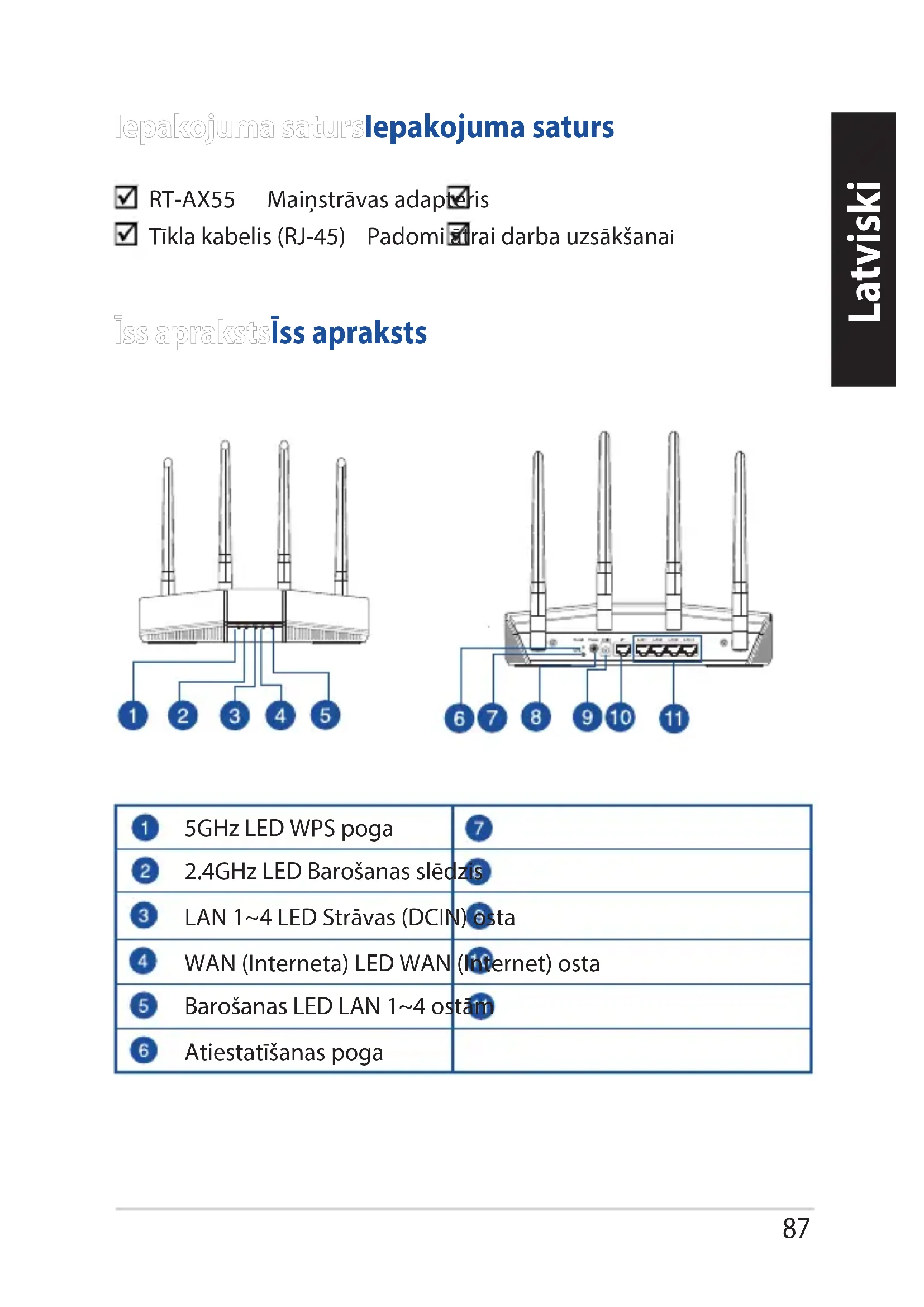 - Naudotojo vadovą galite rasti internete, adresu https://www.asus.com/support ASUS Router ASUS Router87 Latviski Īss aprakstsĪss apraksts Iepakojuma satursIepakojuma saturs RT-AX55 Maiņstrāvas adapteris Tīkla kabelis (RJ-45) Padomi ātrai darba uzsākšanai 5GHz LED WPS poga 2.4GHz LED Barošanas slēdzis LAN 1~4 LED Strāvas (DCIN) osta WAN (Interneta) LED WAN (Internet) osta Barošanas LED LAN 1~4 ostām Atiestatīšanas poga88 Latviski Bezvadu maršrutētāja novietošanaBezvadu maršrutētāja novietošana Lai būtu laba bezvadu signāla pārraide starp bezvadu maršrutētāju un tam pievienotajām tīkla ierīcēm, pārliecinieties, ka: