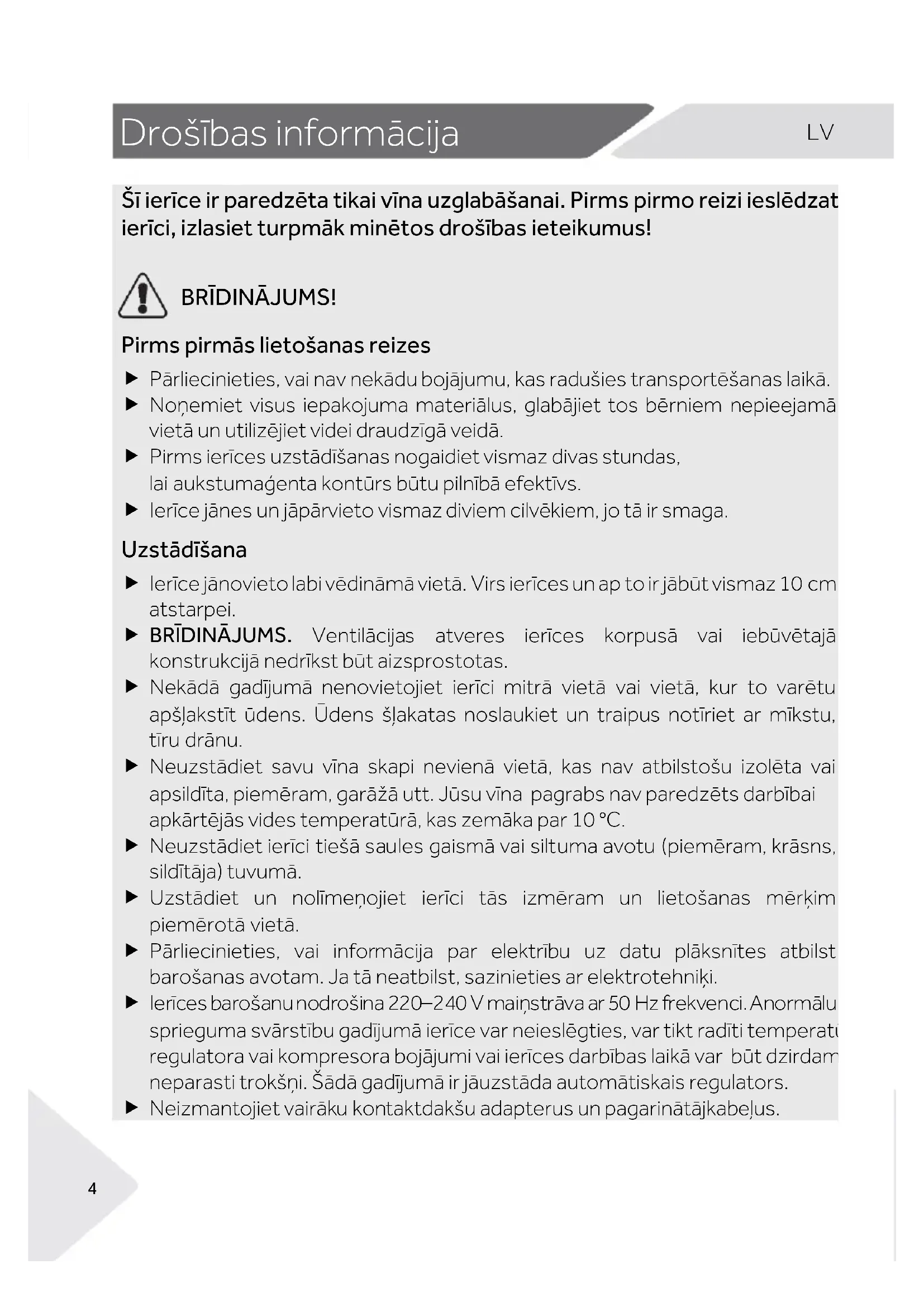 BRĪDINĀJUMS! Pirms pirmās lietošanas reizes Pārliecinieties, vai nav nekādu bojājumu, kas radušies transportēšanas laikā. Noņemiet visus iepakojuma materiālus, glabājiet tos bērniem nepieejamā vietā un utilizējiet videi draudzīgā veidā. Pirms ierīces uzstādīšanas nogaidiet vismaz divas stundas, lai aukstumaģenta kontūrs būtu pilnībā efektīvs. Ierīce jānes un jāpārvieto vismaz diviem cilvēkiem, jo tā ir smaga. Uzstādīšana Ierīce jānovieto labi vēdināmā vietā. Virs ierīces un ap to ir jābūt vismaz 10 cm atstarpei. BRĪDINĀJUMS. Ventilācijas atveres ierīces korpusā vai iebūvētajā konstrukcijā nedrīkst būt aizsprostotas. Nekādā gadījumā nenovietojiet ierīci mitrā vietā vai vietā, kur to varētu apšļakstīt ūdens. Ūdens šļakatas noslaukiet un traipus notīriet ar mīkstu, tīru drānu. Neuzstādiet savu vīna skapi nevienā vietā, kas nav atbilstošu izolēta vai apsildīta, piemēram, garāžā utt. Jūsu vīna pagrabs nav paredzēts darbībai apkārtējās vides temperatūrā, kas zemāka par 10 °C. Neuzstādiet ierīci tiešā saules gaismā vai siltuma avotu (piemēram, krāsns, sildītāja) tuvumā. Uzstādiet un nolīmeņojiet ierīci tās izmēram un lietošanas mērķim piemērotā vietā. Pārliecinieties, vai informācija par elektrību uz datu plāksnītes atbilst barošanas avotam. Ja tā neatbilst, sazinieties ar elektrotehniķi. Ierīces barošanu nodrošina 220–240 V maiņstrāva ar 50 Hz frekvenci. Anormālu sprieguma svārstību gadījumā ierīce var neieslēgties, var tikt radīti temperatūras regulatora vai kompresora bojājumi vai ierīces darbības laikā var būt dzirdami neparasti trokšņi. Šādā gadījumā ir jāuzstāda automātiskais regulators. Neizmantojiet vairāku kontaktdakšu adapterus un pagarinātājkabeļus.Drošības informācija
