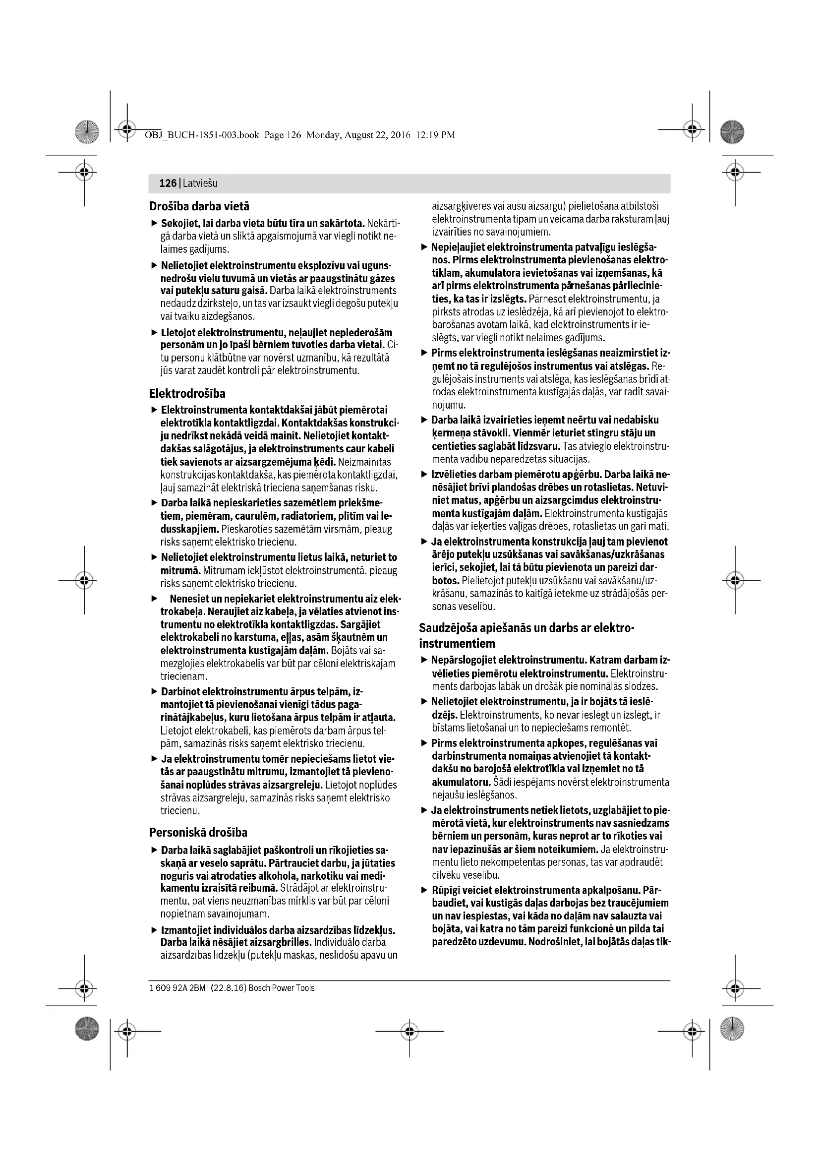 Toimingu eesmärk Joonis Pöörake tähelepanu Lehekülg BRIDINAJUMS OBJ_BUCH-1851-003.book Page 125 Monday, August 22, 2016 12:19 PM126 | Latviešu 1 609 92A 2BM | (22.8.16) Bosch Power Tools Drošība darba vietā Sekojiet, lai darba vieta būtu tīra un sakārtota. Nekārtī- gā darba vietā un sliktā apgaismojumā var viegli notikt ne- laimes gadījums. Nelietojiet elektroinstrumentu eksplozīvu vai uguns- nedrošu vielu tuvumā un vietās ar paaugstinātu gāzes vai putekļu saturu gaisā. Darba laikā elektroinstruments nedaudz dzirksteļo, un tas var izsaukt viegli degošu putekļu vai tvaiku aizdegšanos. Lietojot elektroinstrumentu, neļaujiet nepiederošām personām un jo īpaši bērniem tuvoties darba vietai. Ci- tu personu klātbūtne var novērst uzmanību, kā rezultātā jūs varat zaudēt kontroli pār elektroinstrumentu. Elektrodrošība Elektroinstrumenta kontaktdakšai jābūt piemērotai elektrotīkla kontaktligzdai. Kontaktdakšas konstrukci- ju nedrīkst nekādā veidā mainīt. Nelietojiet kontakt- dakšas salāgotājus, ja elektroinstruments caur kabeli tiek savienots ar aizsargzemējuma ķēdi. Neizmainītas konstrukcijas kontaktdakša, kas piemērota kontaktligzdai, ļauj samazināt elektriskā trieciena saņemšanas risku. Darba laikā nepieskarieties sazemētiem priekšme- tiem, piemēram, caurulēm, radiatoriem, plītīm vai le- dusskapjiem. Pieskaroties sazemētām virsmām, pieaug risks saņemt elektrisko triecienu. Nelietojiet elektroinstrumentu lietus laikā, neturiet to mitrumā. Mitrumam iekļūstot elektroinstrumentā, pieaug risks saņemt elektrisko triecienu. Nenesiet un nepiekariet elektroinstrumentu aiz elek- trokabeļa. Neraujiet aiz kabeļa, ja vēlaties atvienot ins- trumentu no elektrotīkla kontaktligzdas. Sargājiet elektrokabeli no karstuma, eļļas, asām šķautnēm un elektroinstrumenta kustīgajām daļām. Bojāts vai sa- mezglojies elektrokabelis var būt par cēloni elektriskajam triecienam. Darbinot elektroinstrumentu ārpus telpām, iz- mantojiet tā pievienošanai vienīgi tādus paga- rinātājkabeļus, kuru lietošana ārpus telpām ir atļauta. Lietojot elektrokabeli, kas piemērots darbam ārpus tel- pām, samazinās risks saņemt elektrisko triecienu. Ja elektroinstrumentu tomēr nepieciešams lietot vie- tās ar paaugstinātu mitrumu, izmantojiet tā pievieno- šanai noplūdes strāvas aizsargreleju. Lietojot noplūdes strāvas aizsargreleju, samazinās risks saņemt elektrisko triecienu. Personiskā drošība Darba laikā saglabājiet paškontroli un rīkojieties sa- skaņā ar veselo saprātu. Pārtrauciet darbu, ja jūtaties noguris vai atrodaties alkohola, narkotiku vai medi- kamentu izraisītā reibumā. Strādājot ar elektroinstru- mentu, pat viens neuzmanības mirklis var būt par cēloni nopietnam savainojumam. Izmantojiet individuālos darba aizsardzības līdzekļus. Darba laikā nēsājiet aizsargbrilles. Individuālo darba aizsardzības līdzekļu (putekļu maskas, neslīdošu apavu un aizsargķiveres vai ausu aizsargu) pielietošana atbilstoši elektroinstrumenta tipam un veicamā darba raksturam ļauj izvairīties no savainojumiem. Nepieļaujiet elektroinstrumenta patvaļīgu ieslēgša- nos. Pirms elektroinstrumenta pievienošanas elektro- tīklam, akumulatora ievietošanas vai izņemšanas, kā arī pirms elektroinstrumenta pā rnešanas pārliecinie- ties, ka tas ir izslēgts. Pārnesot elektroinstrumentu, ja pirksts atrodas uz ieslēdzēja, kā arī pievienojot to elektro- barošanas avotam laikā, kad elektroinstruments ir ie- slēgts, var viegli notikt nelaimes gadījums. Pirms elektroinstrumenta ieslēgšanas neaizmirstiet iz- ņemt no tā regulējošos instrumentus vai atslēgas. Re- gulējošais instruments vai atslēga, kas ieslēgšanas brīdī at- rodas elektroinstrumenta kustīgajās daļās, var radīt savai- nojumu. Darba laikā izvairieties ieņemt neērtu vai nedabisku ķermeņa stāvokli. Vienmēr ieturiet stingru stāju un centieties saglabāt līdzsvaru. Tas atvieglo elektroinstru- menta vadību neparedzētās situācijās. Izvēlieties darbam piemērotu ap ģērbu. Darba laikā ne- nēsājiet brīvi plandošas drēbes un rotaslietas. Netuvi- niet matus, apģērbu un aizsargcimdus elektroinstru- menta kustīgajām daļām. Elektroinstrumenta kustīgajās daļās var ieķerties vaļīgas drēbes, rotaslietas un gari mati. Ja elektroinstrumenta konstrukcija ļauj tam pievienot ārējo putekļu uzsūkšanas vai savākšanas/uzkrāšanas ierīci, sekojiet, lai tā būtu pievienota un pareizi dar- botos. Pielietojot putekļu uzsūkšanu vai savākšanu/uz- krāšanu, samazinās to kaitīgā ietekme uz strādājošās per- sonas veselību. Saudzējoša apiešanās un darbs ar elektro- instrumentiem Nepārslogojiet elektroinstrumentu. Katram darbam iz- vēlieties piemērotu elektroinstrumentu. Elektroinstru- ments darbojas labāk un drošāk pie nominālās slodzes. Nelietojiet elektroinstrumentu, ja ir bojāts tā ieslē- dzējs. Elektroinstruments, ko nevar ieslēgt un izslēgt, ir bīstams lietošanai un to nepieciešams remontēt. Pirms elektroinstrumenta apkopes, regulēšanas vai darbinstrumenta nomaiņas atvienojiet tā kontakt- dakšu no barojošā elektrotīkla vai izņemiet no tā akumulatoru. Šādi iespējams novērst elektroinstrumenta nejaušu ieslēgšanos. Ja elektroinstruments netiek lietots, uzglabājiet to pie- mērotā vietā, kur elektroinstruments nav sasniedzams bērniem un personām, kuras neprot ar to rīkoties vai nav iepazinušās ar šiem noteikumiem. Ja elektroinstru- mentu lieto nekompetentas personas, tas var apdraudēt cilvēku veselību.