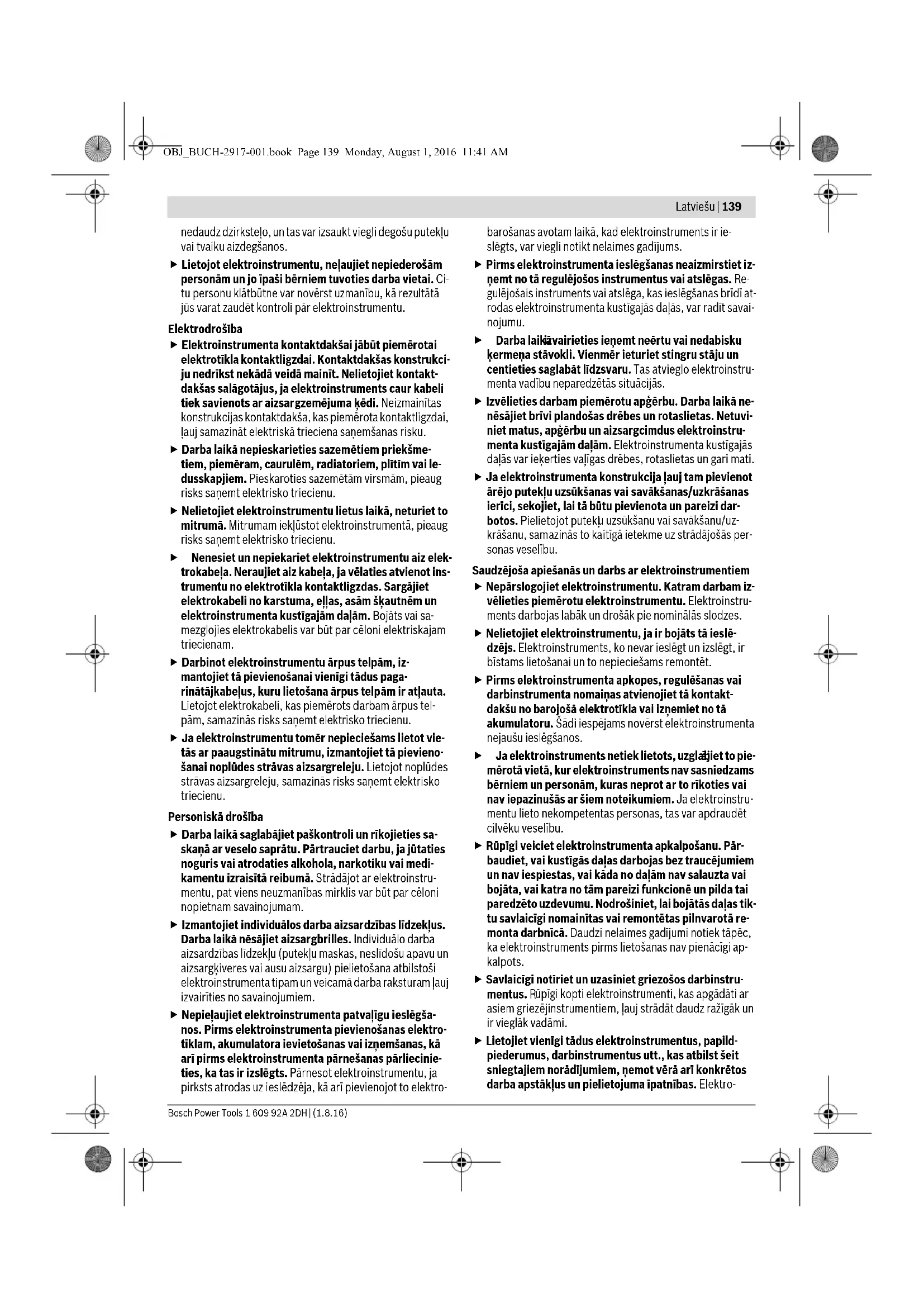 ā gadījumā elektroinstrumenta lietotājs var gūt savainoju- mu. Norādījumi darbam Kontaktējiet darbinstrumentu ar skrūves galvu tikai tad, ja elektroinstruments ir izslēgts. Rotējošs darbins- truments var noslīdēt no skrūves galvas. Lokveida turētājs piekāršanai Elektroinstruments ir apgādāts ar atliecamu lokveida turētāju 8, ar kura palīdzību to var piekārt, piemēram, pie jostas āķa. Tas ļauj izbrīvēt darbam abas rokas, un elektroinstruments jebkurā brīdī ir viegli pieejams. Apkalpošana un apkope Apkalpošana un tīrīšana Pirms jebkuras darbības, kas saistīta ar elektroinstru- menta apkalpošanu, izņemiet no tā akumulatoru. OBJ_BUCH-2917-001.book Page 142 Monday, August 1, 2016 11:41 AMLietuviškai | 143 Bosch Power Tools 1 609 92A 2DH | (1.8.16) Lai nodrošinātu ilgstošu un nevainojamu elektroin- strumenta darbību, uzturiet tīru tā korpusu un ventilā- cijas atveres. Ja akumulators ir nolietojies, nogādājiet to firmas Bosch piln- varotā elektroinstrumentu remonta darbnīcā. Ja, neraugoties uz augsto izgatavošanas kvalitāti un rūpīgo pēcražošanas pārbaudi, elektroinstruments tomēr sabojājas, tas nogādājams remontam firmas Bosch pilnvarotā elektro- instrumentu remonta darbnīcā. Pieprasot konsultācijas un pasūtot rezerves daļas, noteikti paziņojiet 10 zīmju izstrādājuma numuru, kas atrodams uz elektroinstrumenta marķējuma plāksnītes. Klientu konsultāciju dienests un konsultācijas par lietošanu Klientu konsultāciju dienesta darbinieki atbildēs uz Jūsu jau- tājumiem par izstrādājuma remontu un apkalpošanu, kā arī par rezerves daļu iegādi. Izklājuma zīmējumus un informāciju par rezerves daļām var atrast arī interneta vietnē: www.bosch-pt.com Bosch klientu konsultāciju grupa centīsies Jums palīdzēt vis- labākajā veidā, sniedzot atbildes uz jautājumiem par mūsu iz- strādājumiem un to piederumiem. Pieprasot konsultācijas un pasūtot rezerves daļas, noteikti paziņojiet 10 zīmju izstrādājuma numuru, kas norādīts uz iz- strādājuma marķējuma plāksnītes. Latvijas Republika Robert Bosch SIA Bosch elektroinstrumentu servisa centrs Mūkusalas iel ā 97 LV-1004 Rīga Tālr.: 67146262 Telefakss: 67146263 E-pasts: service-pt@lv.bosch.com Transportēšana Uz izstrādājumam pievienotajiem litija-jonu akumulatoriem attiecas noteikumi par bīstamo kravu pārvadāšanu. Lietotājs var transportēt akumulatorus ielu transporta plūsmā bez pa- pildu nosacījumiem. Pārsūtot tos ar trešo personu starpniecību (piemēram, ar gai- sa transporta vai citu transporta aģentūru starpniecību), jāie- vēro īpaši sūtījuma iesaiņošanas un marķēšanas noteikumi. Tāpēc sūtījumu sagatavošanas laikā jāpieaicina kravu pārva- dāšanas speciālists. Pārsūtiet akumulatoru tikai tad, ja tā korpuss nav bojāts. Aizlī- mējiet vaļējos akumulatora kontaktus un iesaiņojiet akumula- toru tā, lai tas iesaiņojumā nep ārvietotos. Lūdzam ievērot arī ar akumulatoru pārsūtīšanu saistītos na- cionālos noteikumus, ja tādi pastāv. Atbrīvošanās no nolietotajiem izstrādājumiem Nolietotie elektroinstrumenti, akumulatori, piederu- mi un iesaiņojuma materiāli jāpakļauj otrreizējai pār- strādei apkārtējai videi nekaitīgā veidā. Neizmetiet nolietotos elektroinstrumentus, akumulatorus un baterijas sadzīves atkritumu tvertnē! Tikai ES valstīm Atbilstoši Eiropas Savienības direktīvai 2012/19/ES par nolietotajām elektriska- jām un elektroniskajām ierīcēm, lietošanai nederīgie elektroinstrumenti, kā arī, atbil- stoši direktīvai 2006/66/EK, bojātie vai no- lietotie akumulatori un baterijas jāsavāc at- sevišķi un jānogādā otrreizējai pārstrādei apkārtējai videi nekaitīgā veidā. Akumulatori un baterijas Litija-jonu akumulatori
