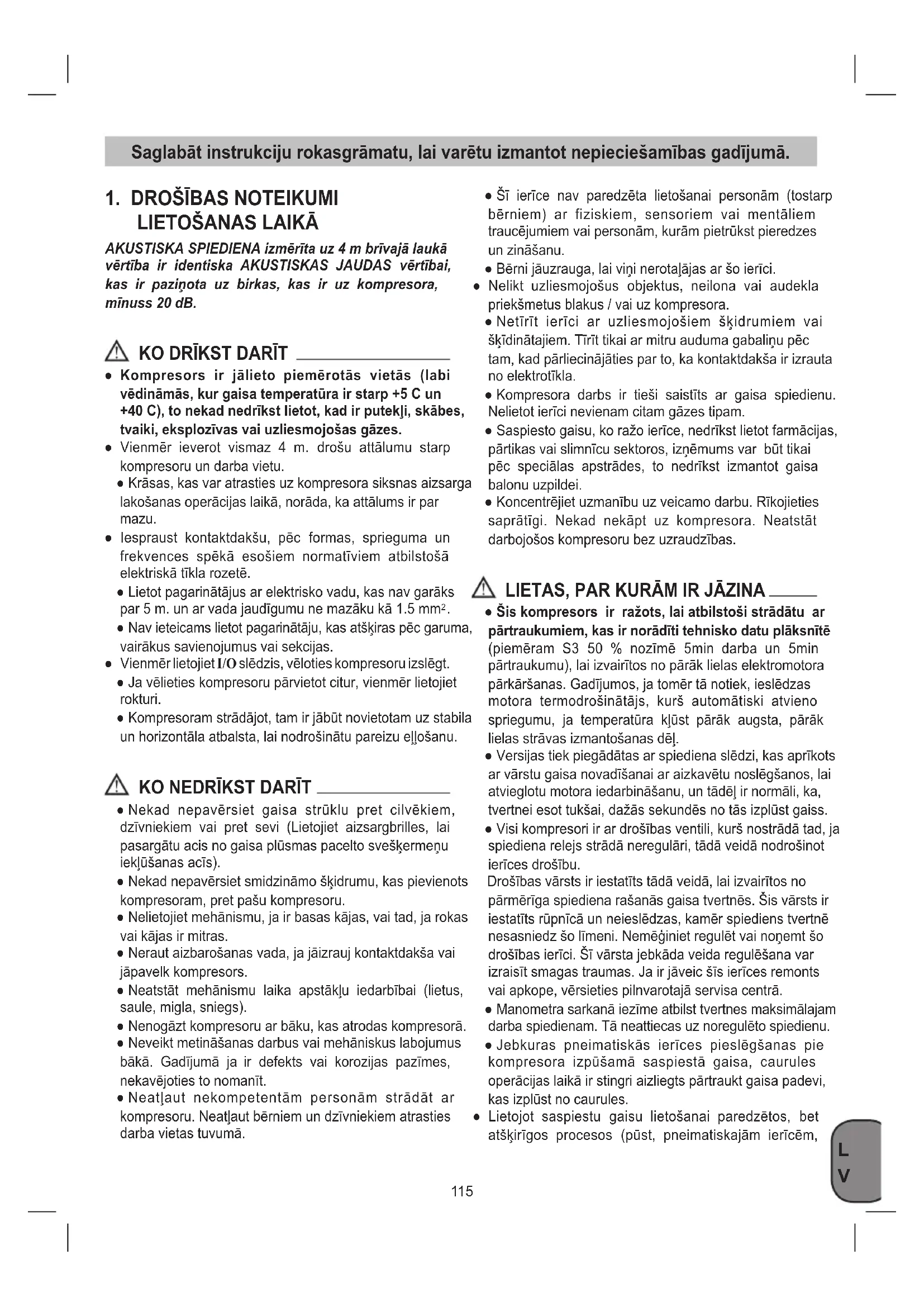 ● Nekad nepavērsiet gaisa strūklu pret cilvēkiem, dzīvniekiem vai pret sevi (Lietojiet aizsargbrilles, lai pasargātu acis no gaisa plūsmas pacelto svešķermeņu iekļūšanas acīs). ● Nekad nepavērsiet smidzināmo šķidrumu, kas pievienots kompresoram, pret pašu kompresoru. ● Nelietojiet mehānismu, ja ir basas kājas, vai tad, ja rokas vai kājas ir mitras. ● Neraut aizbarošanas vada, ja jāizrauj kontaktdakša vai jāpavelk kompresors. ● Neatstāt mehānismu laika apstākļu iedarbībai (lietus, saule, migla, sniegs). ● Nenogāzt kompresoru ar bāku, kas atrodas kompresorā. ● Neveikt metināšanas darbus vai mehāniskus labojumus bākā. Gadījumā ja ir defekts vai korozijas pazīmes, nekavējoties to nomanīt. ● Neatļaut nekompetentām personām strādāt ar kompresoru. Neatļaut bērniem un dzīvniekiem atrasties darba vietas tuvumā. ● Šī ierīce nav paredzēta lietošanai personām (tostarp bērniem) ar fiziskiem, sensoriem vai mentāliem traucējumiem vai personām, kurām pietrūkst pieredzes un zināšanu. ● Bērni jāuzrauga, lai viņi nerotaļājas ar šo ierīci. ● Nelikt uzliesmojošus objektus, neilona vai audekla priekšmetus blakus / vai uz kompresora. ● Netīrīt ierīci ar uzliesmojošiem šķidrumiem vai šķīdinātajiem. Tīrīt tikai ar mitru auduma gabaliņu pēc tam, kad pārliecinājāties par to, ka kontaktdakša ir izrauta no elektrotīkla. ● Kompresora darbs ir tieši saistīts ar gaisa spiedienu. Nelietot ierīci nevienam citam gāzes tipam. ● Saspiesto gaisu, ko ražo ierīce, nedrīkst lietot farmācijas, pārtikas vai slimnīcu sektoros, izņēmums var būt tikai pēc speciālas apstrādes, to nedrīkst izmantot gaisa balonu uzpildei. ● Koncentrējiet uzmanību uz veicamo darbu. Rīkojieties saprātīgi. Nekad nekāpt uz kompresora. Neatstāt darbojošos kompresoru bez uzraudzības. LIETAS, PAR KURĀM IR JĀZINA ● Šis kompresors ir ražots, lai atbilstoši strādātu ar pārtraukumiem, kas ir norādīti tehnisko datu plāksnītē (piemēram S3 50 % nozīmē 5min darba un 5min pārtraukumu), lai izvairītos no pārāk lielas elektromotora pārkāršanas. Gadījumos, ja tomēr tā notiek, ieslēdzas motora termodrošinātājs, kurš automātiski atvieno spriegumu, ja temperatūra kļūst pārāk augsta, pārāk lielas strāvas izmantošanas dēļ. ● Versijas tiek piegādātas ar spiediena slēdzi, kas aprīkots ar vārstu gaisa novadīšanai ar aizkavētu noslēgšanos, lai atvieglotu motora iedarbināšanu, un tādēļ ir normāli, ka, tvertnei esot tukšai, dažās sekundēs no tās izplūst gaiss. ● Visi kompresori ir ar drošības ventili, kurš nostrādā tad, ja spiediena relejs strādā neregulāri, tādā veidā nodrošinot ierīces drošību. Drošības vārsts ir iestatīts tādā veidā, lai izvairītos no pārmērīga spiediena rašanās gaisa tvertnēs. Šis vārsts ir iestatīts rūpnīcā un neieslēdzas, kamēr spiediens tvertnē nesasniedz šo līmeni. Nemēģiniet regulēt vai noņemt šo drošības ierīci. Šī vārsta jebkāda veida regulēšana var izraisīt smagas traumas. Ja ir jāveic šīs ierīces remonts vai apkope, vērsieties pilnvarotajā servisa centrā. ● Manometra sarkanā iezīme atbilst tvertnes maksimālajam darba spiedienam. Tā neattiecas uz noregulēto spiedienu. ● Jebkuras pneimatiskās ierīces pieslēgšanas pie kompresora izpūšamā saspiestā gaisa, caurules operācijas laikā ir stingri aizliegts pārtraukt gaisa padevi, kas izplūst no caurules. ● Lietojot saspiestu gaisu lietošanai paredzētos, bet atšķirīgos procesos (pūst, pneimatiskajām ierīcēm,116