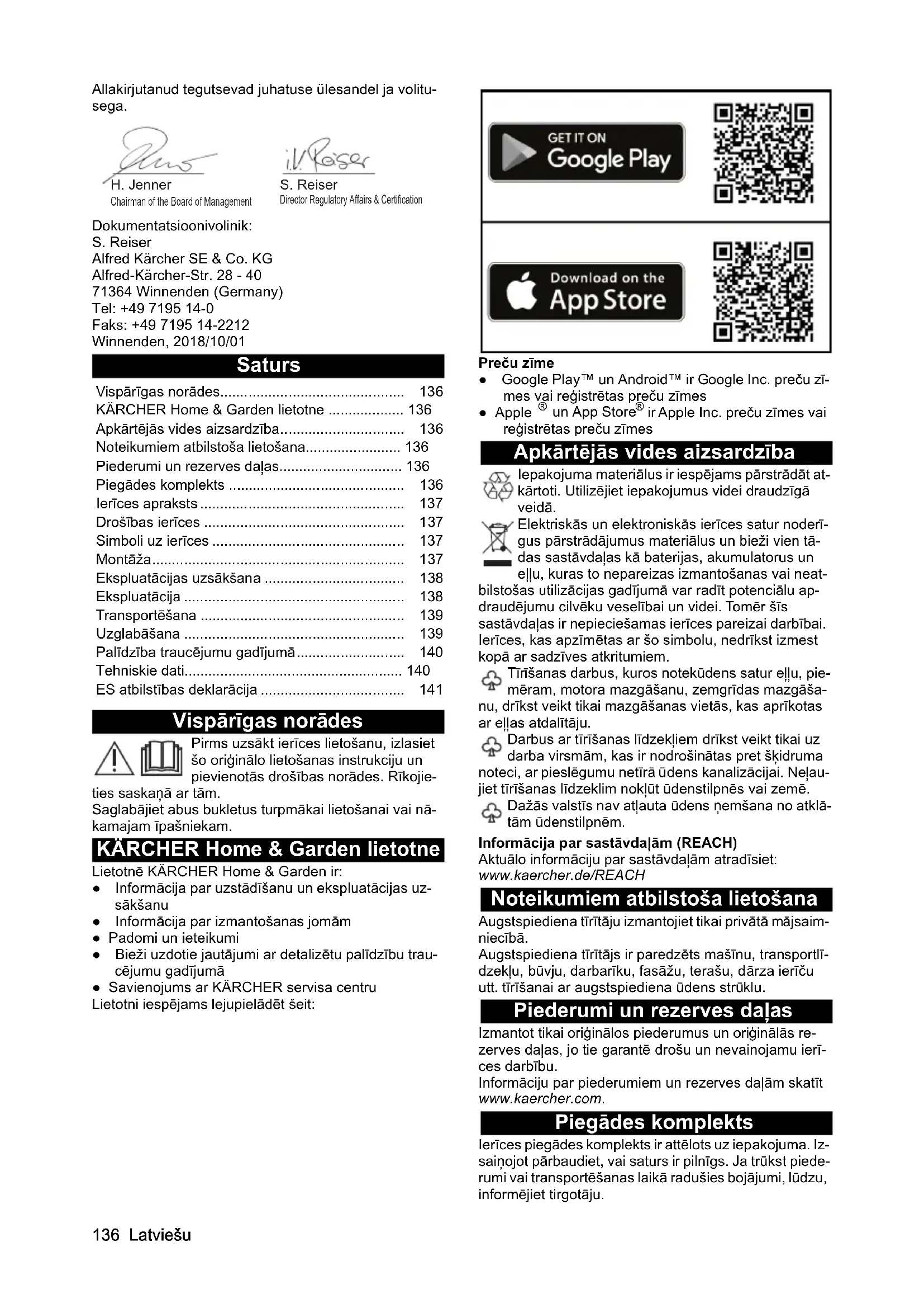 dB(A) 92136 Latviešu Allakirjutanud tegutsevad juhatuse ülesandel ja volitu- sega. Dokumentatsioonivolinik: S. Reiser Alfred Kärcher SE & Co. KG Alfred-Kärcher-Str. 28 - 40 71364 Winnenden (Germany) Tel: +49 7195 14-0 Faks: +49 7195 14-2212 Winnenden, 2018/10/01 Saturs Vispārīgas norādes Pirms uzsākt ierīces lietošanu, izlasiet šo oriģinālo lietošanas instrukciju un pievienotās drošības norādes. Rīkojie- ties saskaņā ar tām. Saglabājiet abus bukletus turpmākai lietošanai vai nā- kamajam īpašniekam. KÄRCHER Home & Garden lietotne Lietotnē KÄRCHER Home & Garden ir: ● Informācija par uzstādīšanu un ekspluatācijas uz- sākšanu ● Informācija par izmantošanas jomām ● Padomi un ieteikumi ● Bieži uzdotie jautājumi ar detalizētu palīdzību trau- cējumu gadījumā ● Savienojums ar KÄRCHER servisa centru Lietotni iespējams lejupielādēt šeit: Preču zīme ● Google Play™ un Android™ ir Google Inc. preču zī- mes vai reģistrētas preču zīmes ● Apple