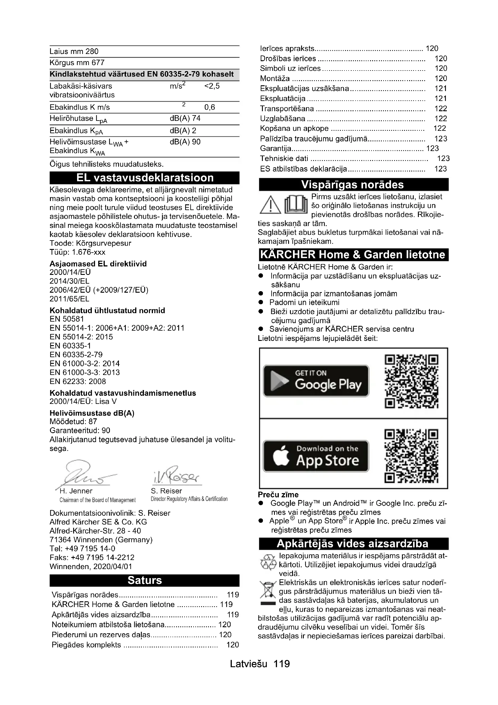 locīšanas vietas. Garantija Katrā valstī ir spēkā mūsu uzņēmuma atbildīgās sa- biedrības izdotie garantijas nosacījumi. Garantijas ter- miņa ietvaros iespējamos Jūsu iekārtas darbības traucējumus mēs novērsīsim bez maksas, ja to cēlonis ir materiāla vai ražošanas defekts. Garantijas remonta nepieciešamības gadījumā ar pirkumu apliecinošu do- kumentu griezieties pie tirgotāja vai tuvākajā pilnvarota- jā klientu apkalpošanas dienestā. (Adresi skatīt aizmugurē) Tehniskie dati Paturētas tiesības veikt tehniskas izmaiņas. ES atbilstības deklarācija Ar šo mēs paziņojam, ka turpmāk tekstā minētās iekār- tas projekts un konstrukcija, kā arī mūsu izgatavotais modelis atbilst ES direktīvu drošības un veselības pa- matprasībām. Veicot ar mums nesaskaņotas izmaiņas iekārtas uzbūvē, šī deklarācija zaudē savu spēku. Produkts: Augstspiediena tīrītājs Tips: 1.676-xxx Attiecīgās ES direktīvas 2000/14/EK 2014/30/ES 2006/42/EK (+2009/127/EK) 2011/65/ES Piemērotie saskaņotie standarti EN 50581 EN 55014-1: 2006+A1: 2009+A2: 2011 EN 55014-2: 2015 EN 60335-1 EN 60335-2-79 EN 61000-3-2: 2014 EN 61000-3-3: 2013 Strāvas pieslēgums Spriegums V 220-240 Fāze ~ 1 Frekvence Hz 50-60 Strāvas patēriņšA6 Drošinātāja veids IPX5 Aizsardzības klase II Tīkla drošinātājs (inertais) A 10 Ūdens pieslēgums Pieplūdes spiediens (maks.) MPa 1,2 Pievades temperatūra (maks.) °C 40 Pieplūdes daudzums (min.) l/min 8 Ierīces veiktspējas dati Darba spiediens MPa 8 Maks. pieļaujamais spiediens MPa 12 Padeves apjoms, ūdens l/min 5,5 Maksimālais padeves apjoms l/min 6,3 Padeves apjoms, tīrīšanas līdzek- lis l/min 0,3 Augstspiediena pistoles atsitiena spēks N12 Izmēri un svars Raksturīgais ekspluatācijas svars kg 5,4 Garums mm 297 Platums mm 280 Augstums mm 677 Aprēķinātās vērtības saskaņā ar EN 60335-2-79 Roku-plaukstu vibrācijas vērtība m/s