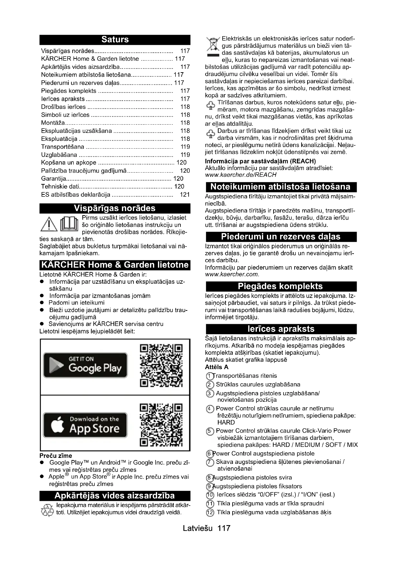 dB(A) 90 Chairman of the Board of Management Director Regulatory Affairs & Certification H. Jenner S. ReiserLatviešu 117 Saturs Vispārīgas norādes Pirms uzsākt ierīces lietošanu, izlasiet šo oriģinālo lietošanas instrukciju un pievienotās drošības norādes. Rīkojie- ties saskaņā ar tām. Saglabājiet abus bukletus turpmākai lietošanai vai nā- kamajam īpašniekam. KÄRCHER Home & Garden lietotne Lietotnē KÄRCHER Home & Garden ir: Informācija par uzstādīšanu un ekspluatācijas uz- sākšanu Informācija par izmantošanas jomām Padomi un ieteikumi Bieži uzdotie jautājumi ar detalizētu palīdzību trau- cējumu gadījumā Savienojums ar KÄRCHER servisa centru Lietotni iespējams lejupielādēt šeit: Preču zīme Google Play™ un Android™ ir Google Inc. preču zī- mes vai reģistrētas preču zīmes Apple