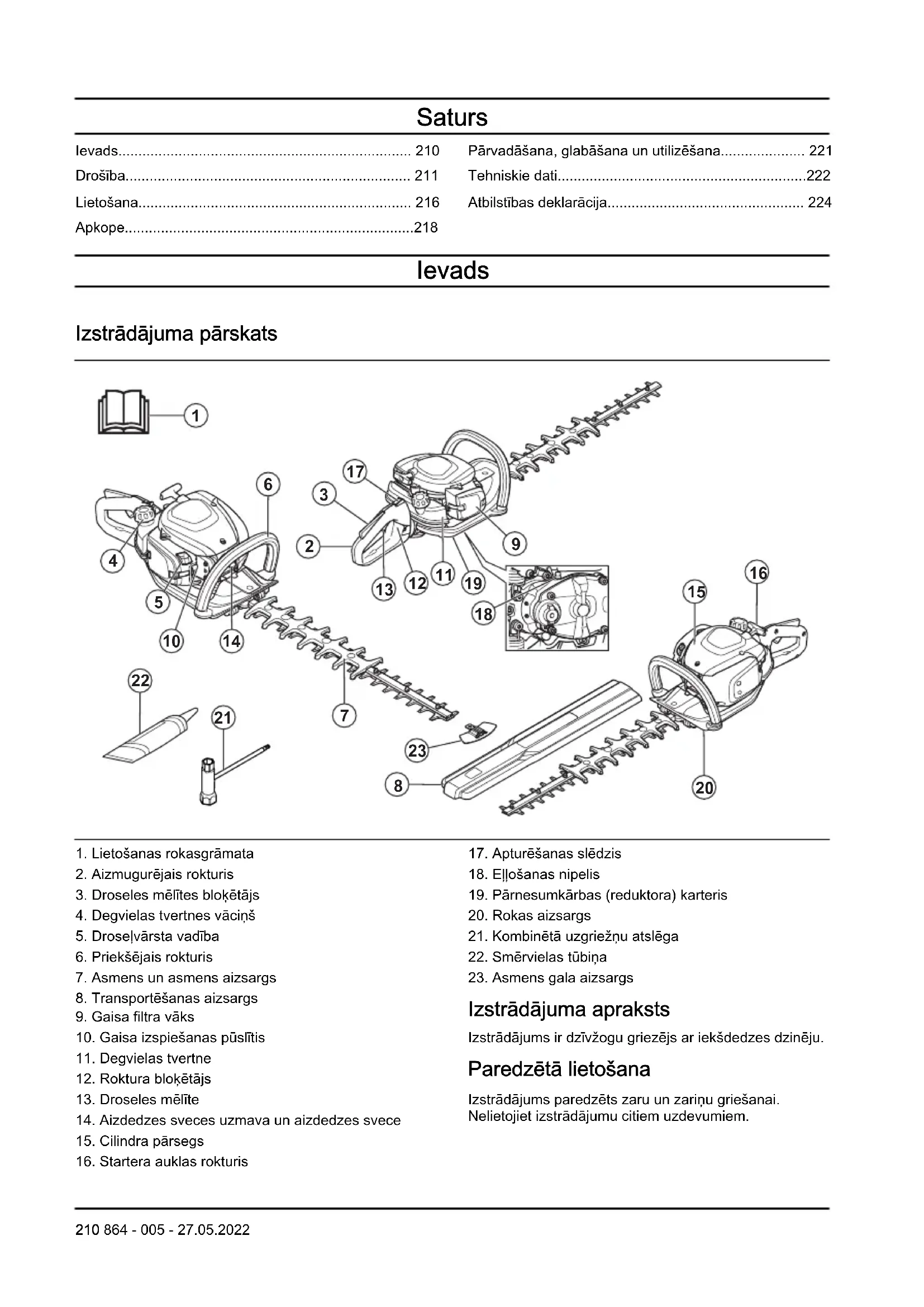 Izstrādājuma apraksts Izstrādājums ir dzīvžogu griezējs ar iekšdedzes dzinēju. Paredzētā lietošana Izstrādājums paredzēts zaru un zariņu griešanai. Nelietojiet izstrādājumu citiem uzdevumiem. 210 864 - 005 - 27.05.2022Simboli uz izstrādājuma Apturēt. Esiet uzmanīgi un lietojiet izstrādājumu pareizi. Šis izstrādājums var izraisīt smagas vai nāvējošas traumas operatoram vai citām personām. Rūpīgi izlasiet lietotāja rokasgrāmatu un pirms izstrādājuma lietošanas pārliecinieties, vai izprotat instrukcijas. Izmantojiet apstiprinātus dzirdes un acu aizsarglīdzekļus. Izmantojiet apstiprinātus aizsargcimdus. Velciet darba apavus ar neslīdošām zolēm. Tukšgaitas regulēšanas skrūve. Liela ātruma adata. Neliela ātruma adata. Trokšņa izplūde vidē atbilstoši Eiropas Direktīvai 2000/14/EK un Jaundienvidvelsas tiesību aktiem “Darba vidē aizsardzības (trokšņa kontroles) regula (2017)”. Trokšņa izplūdes dati ir atrodami uz iekārtas etiķetes un tehnisko datu nodaļā. Šis produkts atbilst piemērojamo EK direktīvu prasībām. Šis izstrādājums atbilst spēkā esošajiem AK noteikumiem. yyyywwxxxx Datu plāksnītē ir norādīts sērijas nu- murs. yyyy ir ražošanas gads un ww ir ražošanas nedēļa. Piezīme: Pārējie uz izstrādājuma norādītie simboli/ norādes atbilst dažu valstu sertifikācijas prasībām. Euro V emisija BRĪDINĀJUMS: Motora atvēršana anulē šī ķēdes zāģa ES tipa apstiprinājumu. Drošība Drošības definīcijas Brīdinājumi, norādes “Uzmanību!” un piezīmes tiek izmantotas, lai izceltu īpaši svarīgas lietotāja rokasgrāmatas daļas. BRĪDINĀJUMS: Tiek izmantota tad, ja rokasgrāmatā sniegto instrukciju neievērošanas dēļ operatoram vai blakus esošajām personām draud traumu vai nāves risks. IEVĒROJIET: Tiek izmantota tad, ja rokasgrāmatā sniegto instrukciju neievērošanas dēļ rodas izstrādājuma, citu materiālu vai blakus esošās teritorijas bojājuma risks. Piezīme: Tiek izmantota, lai sniegtu plašāku informāciju, kas nepieciešama attiecīgajā situācijā. Vispārīgi norādījumi par drošību BRĪDINĀJUMS: Pirms izstrādājuma lietošanas izlasiet tālāk izklāstītās brīdinājuma instrukcijas.