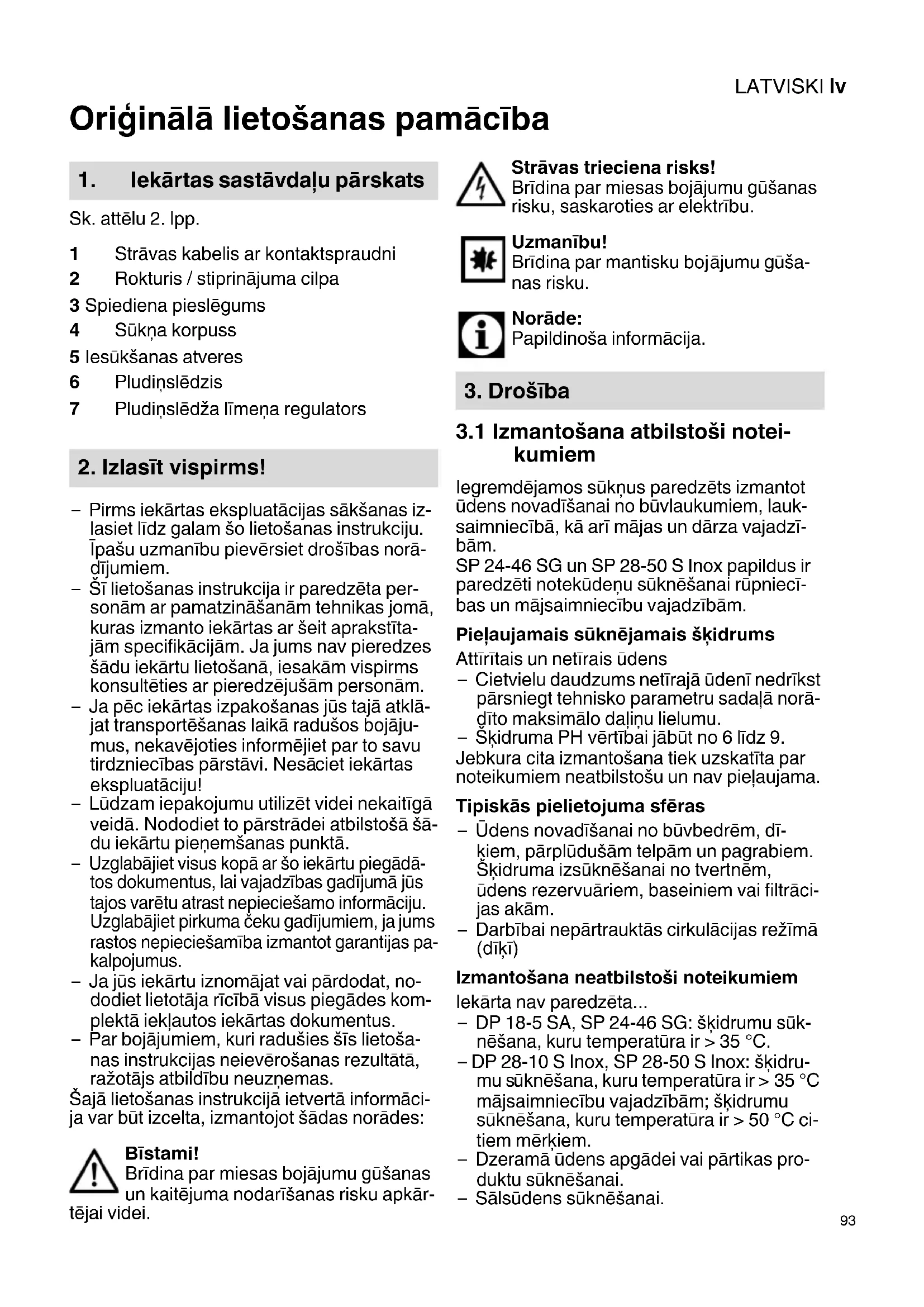kumiem Iegremdējamos sūkņus paredzēts izmantot ūdens novadīšanai no būvlaukumiem, lauk- saimniecībā, kā arī mājas un dārza vajadzī- bām. SP 24-46 SG un SP 28-50 S Inox papildus ir paredzēti notekūdeņu sūknēšanai rūpniecī- bas un mājsaimniecību vajadzībām. Pieļaujamais sūknējamais šķidrums Attīrītais un netīrais ūdens – Cietvielu daudzums netīrajā ūdenī nedrīkst pārsniegt tehnisko parametru sadaļā norā- dīto maksimālo daļi ņu lielumu. –Šķidruma PH vērtībai jābūt no 6 līdz 9. Jebkura cita izmantošana tiek uzskatīta par noteikumiem neatbilstošu un nav pieļaujama. Tipiskās pielietojuma sfēras – Ūdens novadīšanai no būvbedrēm, dī- ķiem, pārplūdušām telpām un pagrabiem. Šķidruma izsūknēšanai no tvertnēm, ūdens rezervuāriem, baseiniem vai filtrāci- jas akām. –Darbībai nepārtrauktās cirkulācijas režīmā (dīķī) Izmantošana neatbilstoši noteikumiem Iekārta nav paredzēta... – DP 18-5 SA, SP 24-46 SG: šķidrumu sūk- nēšana, kuru temperatūra ir > 35 °C. – DP 28-10 S Inox, SP 28-50 S Inox: šķidru- mu s ūknēšana, kuru temperatūra ir > 35 °C mājsaimniecību vajadzībām; šķidrumu sūknēšana, kuru temperatūra ir > 50 °C ci- tiem mērķiem. –Dzeramā ūdens apgādei vai pārtikas pro- duktu sūknēšanai. –Sālsūdens sūknēšanai.