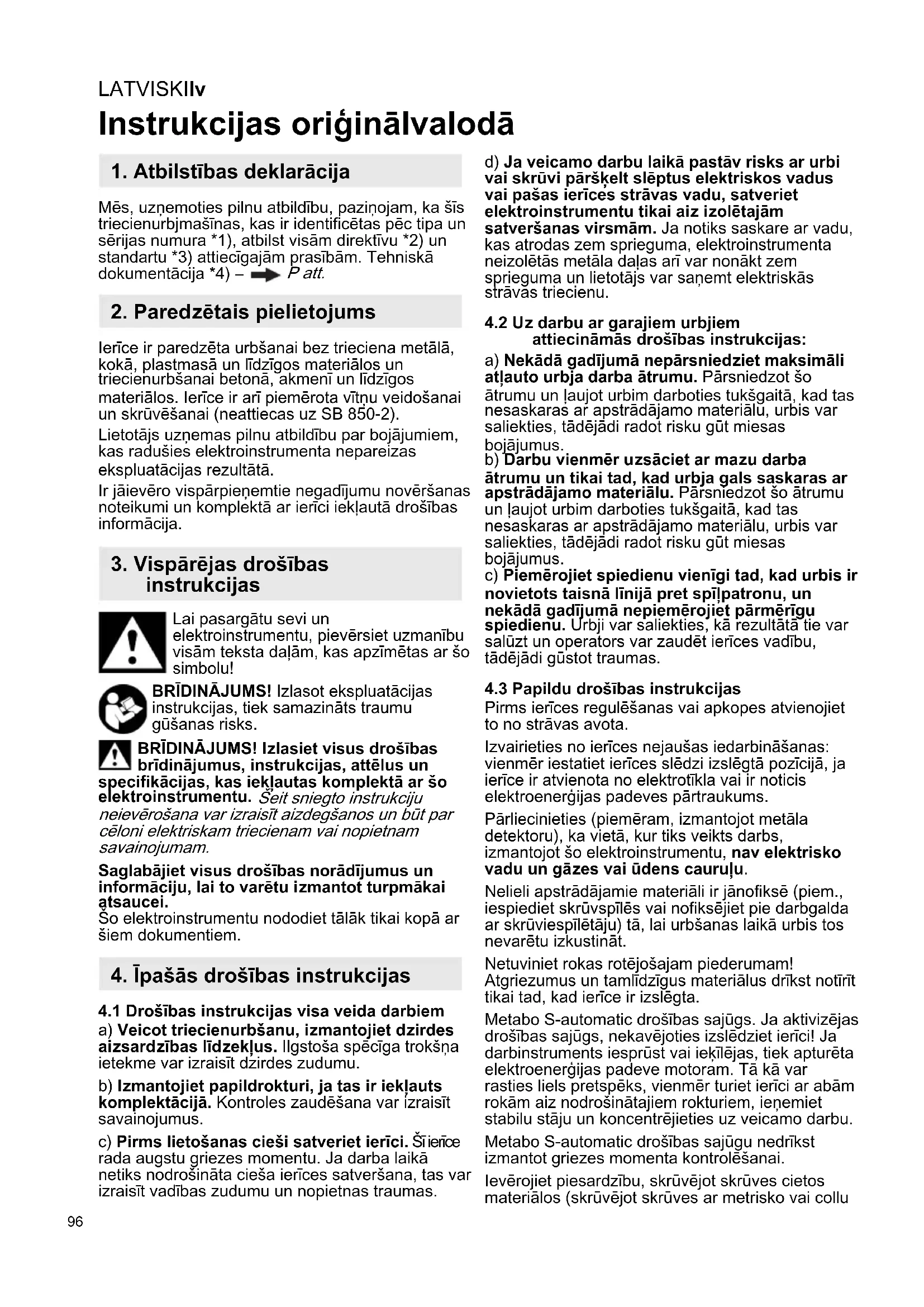 Pirms ierīces regulēšanas vai apkopes atvienojiet to no strāvas avota. Izvairieties no ierīces nejaušas iedarbināšanas: vienmēr iestatiet ierīces slēdzi izslēgtā pozīcijā, ja ierīce ir atvienota no elektrotīkla vai ir noticis elektroenerģijas padeves pārtraukums. Pārliecinieties (piemēram, izmantojot metāla detektoru), ka vietā, kur tiks veikts darbs, izmantojot šo elektroinstrumentu, nav elektrisko vadu un gāzes vai ūdens cauruļu. Nelieli apstrādājamie materiāli ir jānofiksē (piem., iespiediet skrūvspīlēs vai nofiksējiet pie darbgalda ar skrūviespīlētāju) tā, lai urbšanas laikā urbis tos nevarētu izkustināt. Netuviniet rokas rotējošajam piederumam! Atgriezumus un tamlīdzīgus materiālus drīkst notīrīt tikai tad, kad ierīce ir izslēgta. Metabo S-automatic drošības sajūgs. Ja aktivizējas drošības sajūgs, nekavējoties izslēdziet ierīci! Ja darbinstruments iesprūst vai ieķīlējas, tiek apturēta elektroenerģijas padeve motoram. Tā kā var rasties liels pretspēks, vienmēr turiet ierīci ar abām rokām aiz nodrošinātajiem rokturiem, ieņemiet stabilu stāju un koncentrējieties uz veicamo darbu. Metabo S-automatic drošības sajūgu nedrīkst izmantot griezes momenta kontrolēšanai. Ievērojiet piesardzību, skrūvējot skrūves cietos materiālos (skrūvējot skrūves ar metrisko vai collu