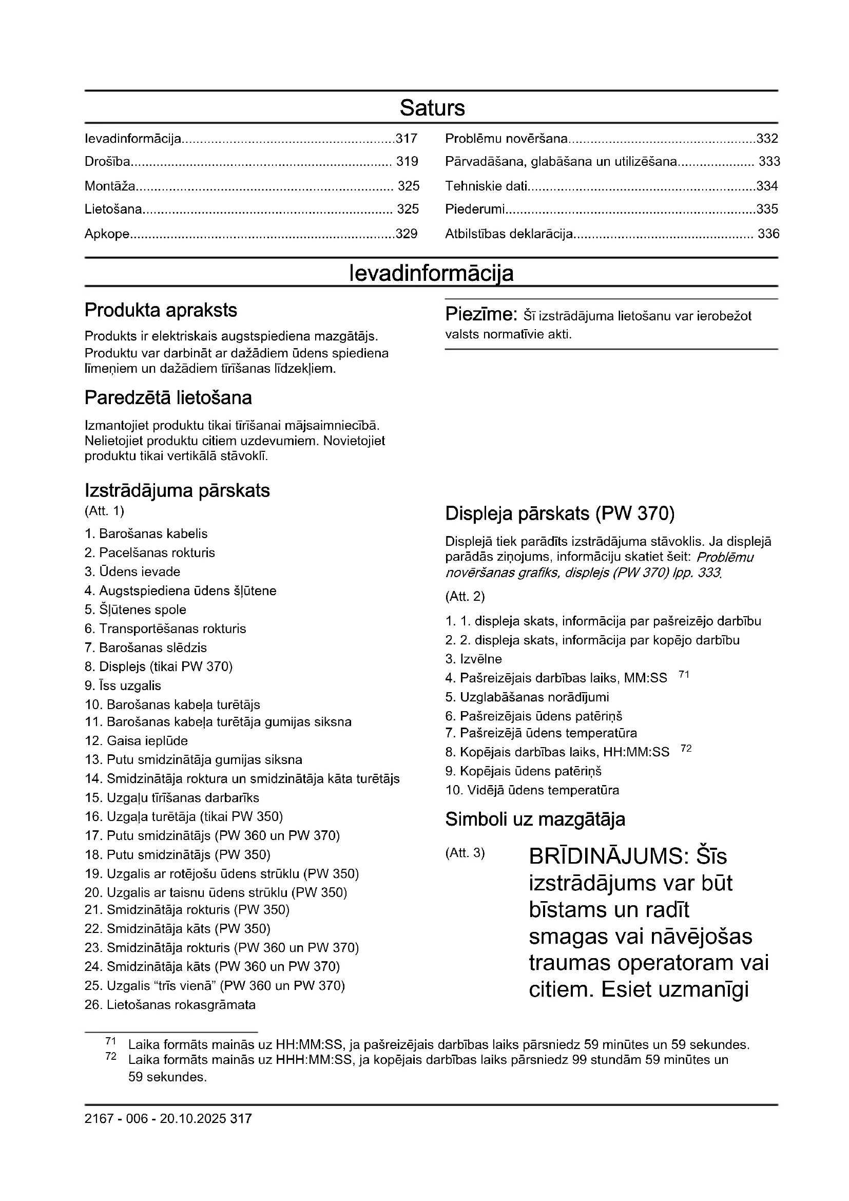 spiediet to, līdz tas nofiksējas pozīcijā. 2167 - 006 - 20.10.2025 331Problēmu novēršana Problēmu novēršanas grafiks Kļūme Iespējamais iemesls Risinājums Mazgātājs nesāk darboties. Kontaktspraudnis nav pievienots ba- rošanas avotam. Ievietojiet kontaktspraudni kontakt- ligzdā. Barošanas slēdzis ir izslēgtā stāvok- lī(0). Pagrieziet barošanas slēdzi ieslēgtā stāvoklī(I). Kontaktligzdā nav elektrības. Sazinieties ar apstiprinātu elektriķi. Barošanas kabelis ir bojāts. Sazinieties ar pilnvarotu apkopes die- nesta pārstāvi. Termiskā aizsargierīce pārtrauc baro- šanu. Pirms mazgātāja atkārtotas ieslēgša- nas uzgaidiet, līdz tas atdziest. Tiek izmantots nepareiza veida paga- rinātājs. Pārliecinieties, ka pagarinātājs ir pil- nībā attīts un spriegums atbilst maz- gātāja sprieguma datiem. Displejs neieslēdzas, kad barošanas slēdzis ir pagriezts stāvoklī ieslēg- tā(I). Kontaktspraudnis nav pievienots ba- rošanas avotam. Ievietojiet kontaktspraudni kontakt- ligzdā. Drošinātājs izdeg ieslēgšanas vai darbības laikā. Tiek izmantots nepareiza veida droši- nātājs. Pārliecinieties, vai izmantojat “C“ vai “K” klases lēndarbīgu drošinātāju. Mazgātāju nevar apturēt. Mazgātājs ir bojāts. Atvienojiet kontaktspraudni un sazi- nieties ar pilnvarota apkopes dienes- ta pārstāvi. Mazgātājs pārmērīgi sakarst. Nepietiekama gaisa plūsma. Iztīriet gaisa ieplūdes atveres. Mazgātājs darbojas nevienmērīgi. Sistēmā ir gaiss. Atgaisojiet sistēmu. Ūdens spiediens nav apmierinošs. Šļūtene ir saliekta. Pārbaudiet, vai šļūtenes nav saliek- tas. Barošanas slēdzis ir izslēgtā stāvok- lī(0). Pagrieziet barošanas slēdzi ieslēgtā stāvoklī(I). Nepietiekama ūdens plūsma. Pārbaudiet, vai mazgātājs ir parei- zi pievienots ūdens avotam. Nodroši- niet pietiekamu ūdens plūsmu. Aizsērējis ūdens filtrs. Iztīriet ūdens filtru. Sistēmā ir gaiss. Atgaisojiet sistēmu. Piederums nav pareizs. Izmantojiet pareizu piederumu. Nevar izvilkt augstspiediena ūdens šļūteni. Šļūtenes spole ir bloķēta. Noņemiet šļūtenes spoles pārsegu un novērsiet nosprostojumu. Iztīriet šļūtenes spoli. No savienojumiem ir noplūde. Blīvgredzeni ir nodiluši vai bojāti. Nomainiet blīvgredzenus. 332 2167 - 006 - 20.10.2025Problēmu novēršanas grafiks, displejs (PW 370) Problēma Iespējamais iemesls Risinājums Sarkans temperatūras simbols. Pla- šāku informāciju skatiet ekrānā re- dzamajā kļūdas ziņojumā. Apkārtējās vides temperatūra darba zonā ir pārāk zema. Lietojiet izstrādājumu tikai tad, ja ap- kārtējās vides temperatūra ir 4°C vai augstāka. Apkārtējās vides temperatūra uzgla- bāšanas vietā ir pārāk zema. Glabājiet izstrādājumu sausā, no sa- la aizsargātā vietā. Pārliecinieties, ka apkārtējās vides temperatūra uzgla- bāšanas vietā ir augstāka par 0°C. Pārāk augsta ūdens ieplūdes tempe- ratūra. Pārliecinieties, ka ūdens ieplūdes temperatūra nepārsniedz 40°C. Sarkans darbarīka simbols. Plašāku informāciju skatiet ekrānā redzamajā kļūdas ziņojumā. Ūdens sensors nevar reģistrēt ūdens līmeni. Apturiet izstrādājumu un uzgaidiet 5minūtes, pirms atkal to ieslēdzat. Ja kļūme joprojām nav novērsta, sa- zinieties ar pilnvarotu apkopes die- nesta pārstāvi. Temperatūras sensors nespēj reģis- trēt ūdens temperatūru. Dzeltens darbarīka simbols. Plašāku informāciju skatiet ekrānā redzamajā kļūdas ziņojumā. Ieteicams nomainīt blīvgredzenus. Nomainiet blīvgredzenus. Ieteicams iztīrīt ūdens filtru izstrādā- juma ūdens ievadē. Iztīriet ūdens filtru izstrādājuma ūdens ievadē. Pārvadāšana, glabāšana un utilizēšana Transportēšana