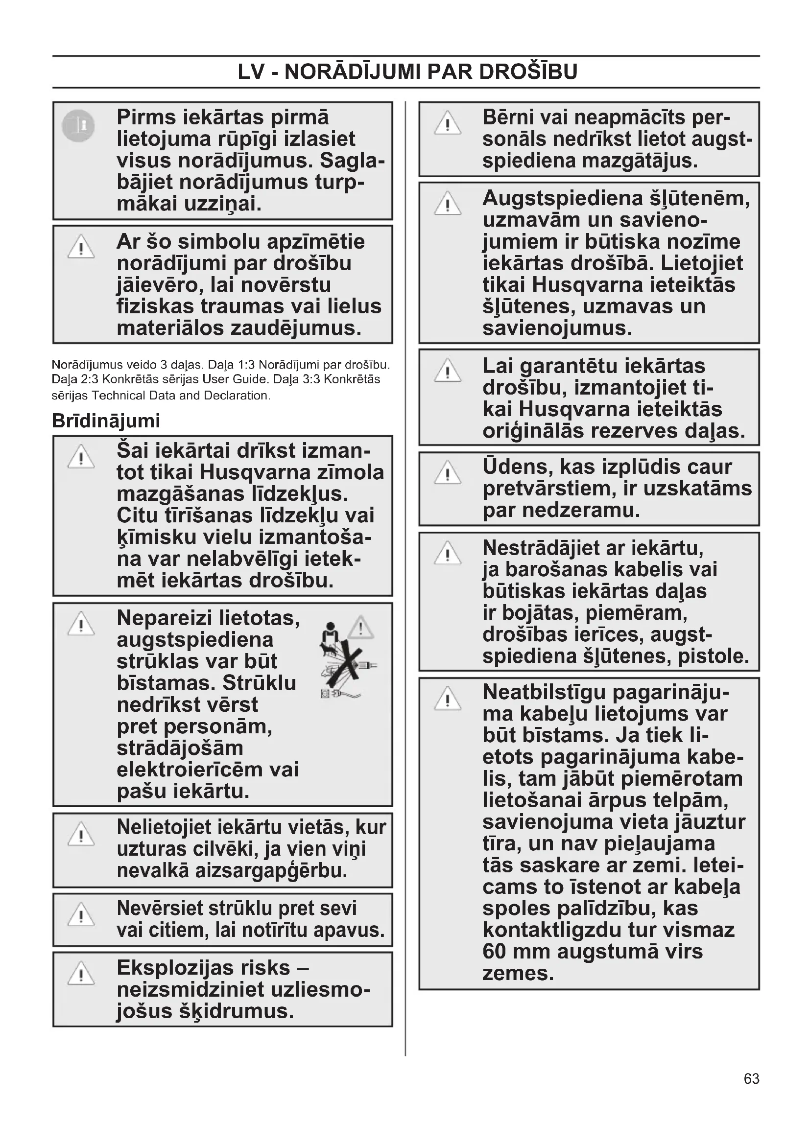 - Elektrický kábel a vysokotlakovú hadicu zviňte, aby sa prediš- lo poškodeniu kábla, vysokotlakovej hadice a tvaroviek. Zariadenie musí byť počas skladovania chránené pred mrazom. Postupujte podľa ilustrácii v časti F. G Údržba, kontrola a oprava Údržbu zariadenia je potrebné vykonať vždy pred opätovným používaním zariadenia po dlhodobom skladovaní. Pred použitím vždy skontrolujte zariade- nie a príslušenstvo, či nedošlo k poškodeniu. V prípade poškodenia, konajte v súlade s uve- denými varovaniami. Nikdy nevykonávajte údržbu, ktorá nie je popísaná v tomto návode. V prípade, že sa zariadenie nezapne, zastaví, pulzuje, ak dochádza ku kolísaniu tlaku, ak motor bzučí, ak sa vypálila poistka alebo ak zo zariadenia nevychádza voda, pozrite si schému riešení problémov uvedenú na webovej lokalite www.husqvarna.com. Každá oprava zariadenia sa musí vždy vykonať v autori- zovanej servisnej dielni spoločnosti Husqvarna, s použitím originálnych náhradných dielov značky Husqvarna. Používateľská údržba v súlade s ilustráciami v časti G. OM 1-3 Safety FINAL rev 1 draft.indd 62 2017-06-14 13:59:5363 LV - NORĀDĪJUMI PAR DROŠĪBU Pirms iekārtas pirmā lietojuma rūpīgi izlasiet visus norādījumus. Sagla- bājiet norādījumus turp- mākai uzziņai. Ar šo simbolu apzīmētie norādījumi par drošību jāievēro, lai novērstu ziskas traumas vai lielus materiālos zaudējumus. Norādījumus veido 3 daļas. Daļa 1:3 Norādījumi par drošību. Daļa 2:3 Konkrētās sērijas User Guide. Daļa 3:3 Konkrētās sērijas Technical Data and Declaration. Brīdinājumi Šai iekārtai drīkst izman- tot tikai Husqvarna zīmola mazgāšanas līdzekļus. Citu tīrīšanas līdzekļu vai ķīmisku vielu izmantoša- na var nelabvēlīgi ietek- mēt iekārtas drošību. Nepareizi lietotas, augstspiediena strūklas var būt bīstamas. Strūklu nedrīkst vērst pret personām, strādājošām elektroierīcēm vai pašu iekārtu. Nelietojiet iekārtu vietās, kur uzturas cilvēki, ja vien viņi nevalkā aizsargapģērbu. Nevērsiet strūklu pret sevi vai citiem, lai notīrītu apavus. Eksplozijas risks – neizsmidziniet uzliesmo- jošus šķidrumus. Bērni vai neapmācīts per- sonāls nedrīkst lietot augst- spiediena mazgātājus. Augstspiediena šļūtenēm, uzmavām un savieno- jumiem ir būtiska nozīme iekārtas drošībā. Lietojiet tikai Husqvarna ieteiktās šļūtenes, uzmavas un savienojumus. Lai garantētu iekārtas drošību, izmantojiet ti- kai Husqvarna ieteiktās oriģinālās rezerves daļas. Ūdens, kas izplūdis caur pretvārstiem, ir uzskatāms par nedzeramu. Nestrādājiet ar iekārtu, ja barošanas kabelis vai būtiskas iekārtas daļas ir bojātas, piemēram, drošības ierīces, augst- spiediena šļūtenes, pistole. Neatbilstīgu pagarināju- ma kabeļu lietojums var būt bīstams. Ja tiek li- etots pagarinājuma kabe- lis, tam jābūt piemērotam lietošanai ārpus telpām, savienojuma vieta jāuztur tīra, un nav pieļaujama tās saskare ar zemi. Ietei- cams to īstenot ar kabeļa spoles palīdzību, kas kontaktligzdu tur vismaz 60 mm augstumā virs zemes. OM 1-3 Safety FINAL rev 1 draft.indd 63 2017-06-14 13:59:5364 LV - NORĀDĪJUMI PAR DROŠĪBU Atstājot iekārtu bez uz- raudzības, pabeidzot darbu ar to vai pārveido- jot to citai funkcijai, kā arī veicot remontu vai apko- pi, izslēdziet iekārtu un atvienojiet to elektrotīkla. Augstspiediena mazgātā- ju lietošanas laikā var veidoties izsmidzinā- jumi. Izsmidzinājumu ieelpošana var būt bīstama veselībai, tādēļ aizsardzības nolūkā pret izsmidzinājumiem, iespē- jams (atkarībā no tīrāmās vides), nepieciešama FFP 2 klases vai līdzvērtīga elpošanas maska. Paredzētais lietojums un atbildības noteikumi 100, 200, 300 un 400 sērija ir izstrādāta tikai sadzīviskas tīrīšanas nolūkā un lietojumam stateniskā stāvoklī. Jebkāds cits lietojums ir uzskatāms par neatbilstošu lietojumu. Augstspiediena mazgātājs darbojas ar dažādiem spiediena līmeņiem un tīrīšanas līdzekļiem, kas paredzēti atšķirīgiem tīrīšanas uzdevumiem un rezultātiem. Vienmēr ievērojiet uz mazgāšanas līdzekļiem iespiestos norādījumus par lietoju- mu, rīcību ārkārtas situācijā un likvidēšanu. Nedarbiniet iekārtu temperatūrā, kas zemāka par 0°C. Nekad neiedarbiniet sasalušu iekārtu, nekad nelietojiet to telpās un nekad to lietošanas laikā nepārsedziet. Tas ir uzskatāms par neatbilstīgu un nepareizu lietojumu. Nepareiza spiediena, mazgāšanas līdzekļu un/vai programmu lietojums var sabojāt iekārtu, virsmas, materiālus un ierīces. Viss iepriekš minētais ir uzskatāms par neatbilstīgu un nepareizu lietojumu. Husqvarna neuzņemas nekādu atbildību par zaudējumiem, kas radušies neatbilstīga vai nepareiza lietojuma dēļ. Papildu norādījumus un informāciju par lietojumu, rīcību ārkārtas gadījumā un likvidēšanu, lūdzu, skatiet mūsu tīmekļa vietnē www.husqvarna.com. Aizsargierīces un to funkcijas Atlaižot mēlīti, iekārtas darbība tiek apturēta automātiski. Iekārta būs iedarbināma no jauna, atkal piespiežot mēlīti. Smidzinātāja rokturim ir bloķējoša ierīce. Kad tā ir aktivizēta, smidzināšanas rokturi nav iespējams darbināt. Iekārtai ir termoaizsargs ar automātiskas pašatiestates funkciju. Ja iekārta ir pārkarsusi, termoaizsargs pārtrauks elektroenerģi- jas padevi. Tādā gadījumā jānogaida, līdz iekārta atdziest. Integrēts hidrauliskais drošības vārsts aizsargā sistēmu pret pārmērīgu spiedienu. Piesardzības pasākumi Elektropadeves savienojumu drīkst izveidot kvalicēts elek- triķis, un savienojumam ir jāatbilst IEC 60364-1. Ieteicams, lai elektropadevē uz šo iekārtu būtu ierīkota atlikumstrāvas ierīce, kas pārtrauktu padevi tad, kad noplūdes strāva uz zemi 30 ms pārsniedz 30 mA, vai ierīce, kas nodrošina zemējuma ķēdi. Li