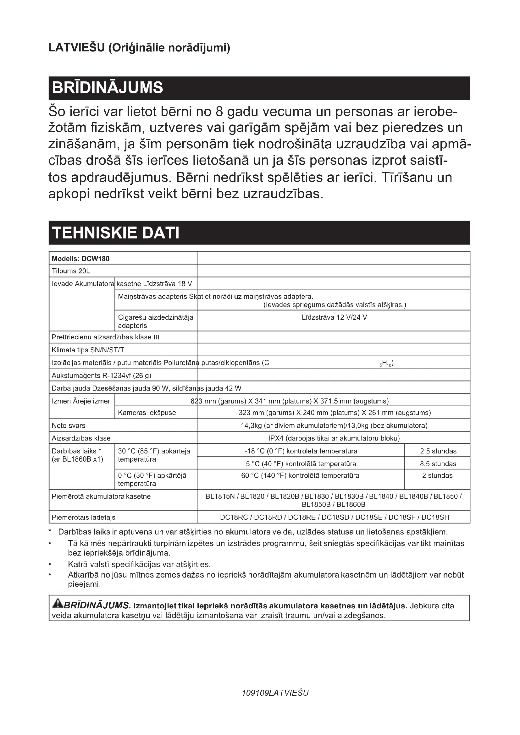 Šo ierīci var lietot bērni no 8 gadu vecuma un personas ar ierobe- žotām ziskām, uztveres vai garīgām spējām vai bez pieredzes un zināšanām, ja šīm personām tiek nodrošināta uzraudzība vai apmā- cības drošā šīs ierīces lietošanā un ja šīs personas izprot saistī- tos apdraudējumus. Bērni nedrīkst spēlēties ar ierīci. Tīrīšanu un apkopi nedrīkst veikt bērni bez uzraudzības. TEHNISKIE DATI Modelis: DCW180Tilpums 20LIevade Akumulatora kasetne Līdzstrāva 18 VMaiņstrāvas adapteris Skatiet norādi uz maiņstrāvas adaptera.(Ievades spriegums dažādās valstīs atšķiras.)Cigarešu aizdedzinātāja adapterisLīdzstrāva 12 V/24 VPrettriecienu aizsardzības klase IIIKlimata tips SN/N/ST/TIzolācijas materiāls / putu materiāls Poliuretāna putas/ciklopentāns (C