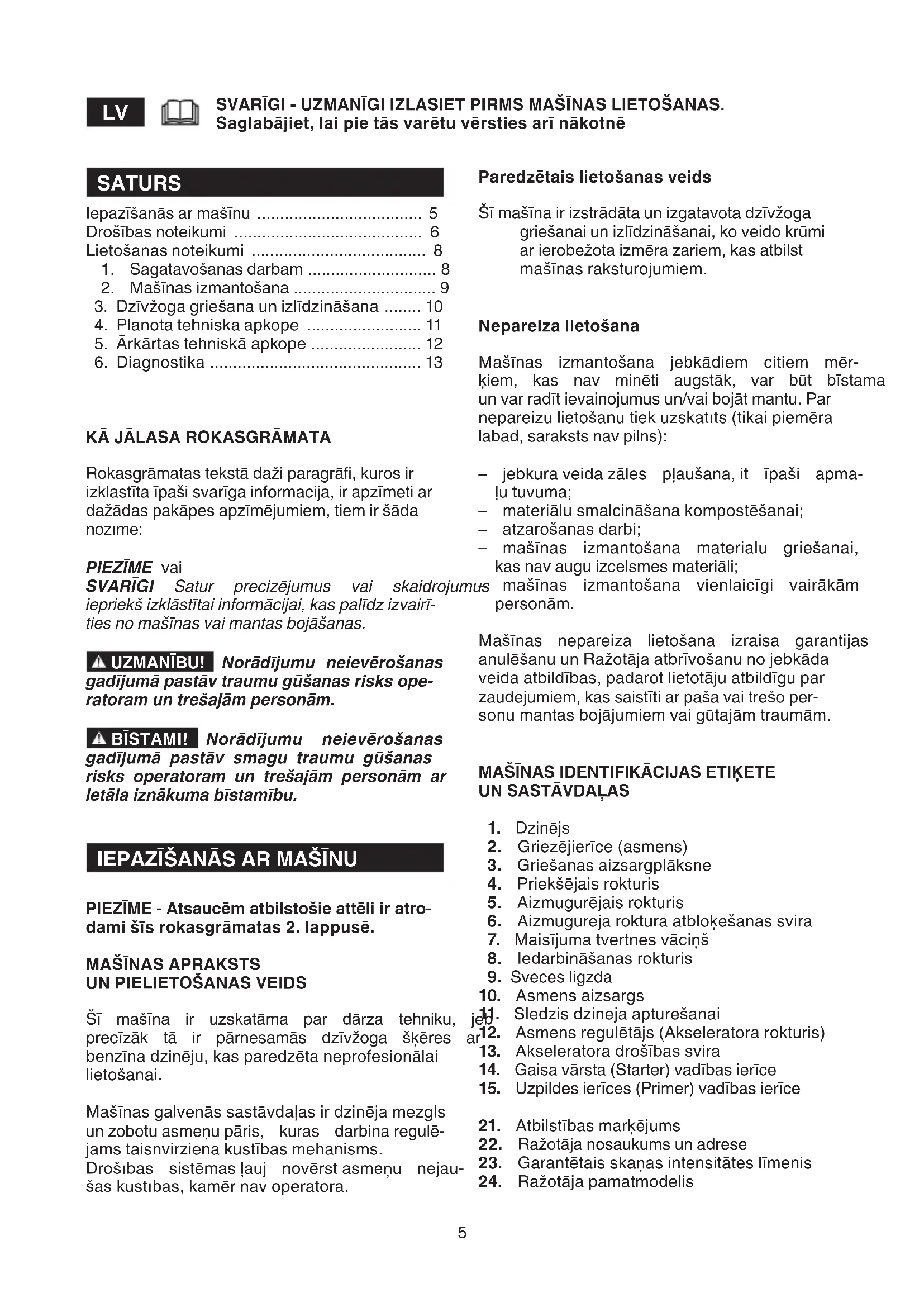 1) ŠĪ MAŠĪNA VAR RADĪT SMAGAS TRAUMAS UN BOJĀJUMUS. Uzmanīgi izlasiet ierīces pa- reizas lietošanas, sagatavošanas, tehniskās ap- kopes, ieslēgšanas un ieslēgšanas norādīju- mus. Iepazīstieties ar mašīnas vadības ierīcēm un ar to pareizu izmantošanu. Iemācieties ātri apturēt dzinēju. 2) Nekādā gadījumā nepieļaujiet, lai mašīnu lie- totu bērni vai cilvēki, kuri nav nepieciešamā lī- menī iepazinušies ar instrukciju. Vietējā likum- došanā var būt noteikts minimālais mašīnas operatora vecums. 3) Mašīnu nedrīkst lietot vairāk kā viena per- sona. 4) Nekad nelietojiet ierīci šādos gadījumos: – ja tuvumā atrodas cilvēki, it sevišķi bērni, vai dzīvnieki; – ja mašīnas operators ir noguris vai slikti jūtas, kā arī ja viņš ir lietojis medikamentus, narkoti- kas, alkoholu vai vielas, kuras pasliktina ref- leksus un uzmanību; – ja lietotājs nespēj stingri turēt mašīnu ar abām rokām un/vai darba laikā saglabāt līdzsvaru, stabili stāvot uz kājām. 5) Atcerieties, ka operators vai lietotājs ir atbil- dīgs par negadījumiem un nejaušiem mantas bojājumiem, kuros ir iesaistītas trešās personas vai to manta.7