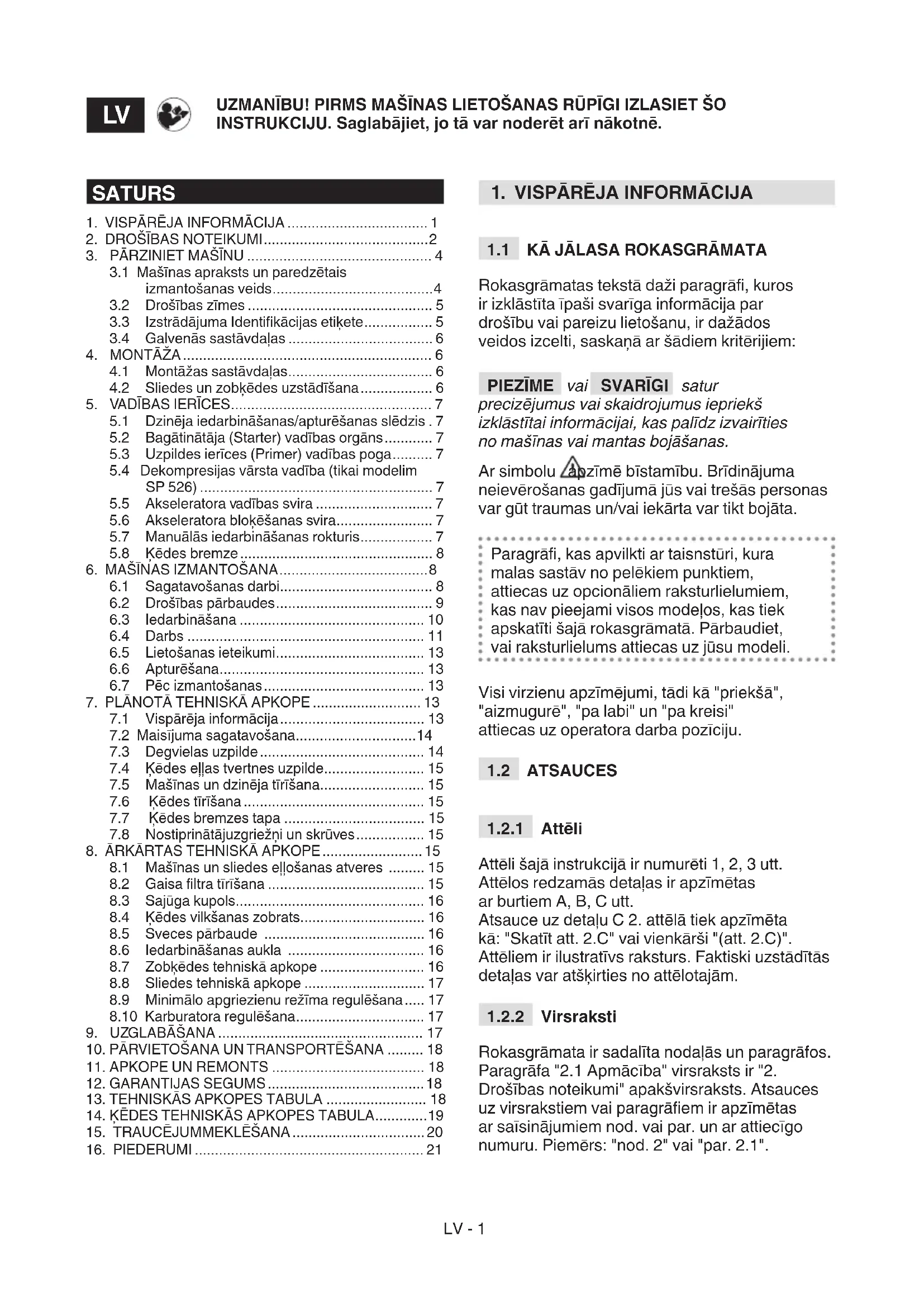 Rokasgrāmata ir sadalīta nodaļās un paragrāfos. Paragrāfa "2.1 Apmācība" virsraksts ir "2. Drošības noteikumi" apakšvirsraksts. Atsauces uz virsrakstiem vai paragrāem ir apzīmētas ar saīsinājumiem nod. vai par. un ar attiecīgo numuru. Piemērs: "nod. 2" vai "par. 2.1". UZMANĪBU! PIRMS MAŠĪNAS LIETOŠANAS RŪPĪGI IZLASIET ŠO INSTRUKCIJU. Saglabājiet, jo tā var noderēt arī nākotnē.