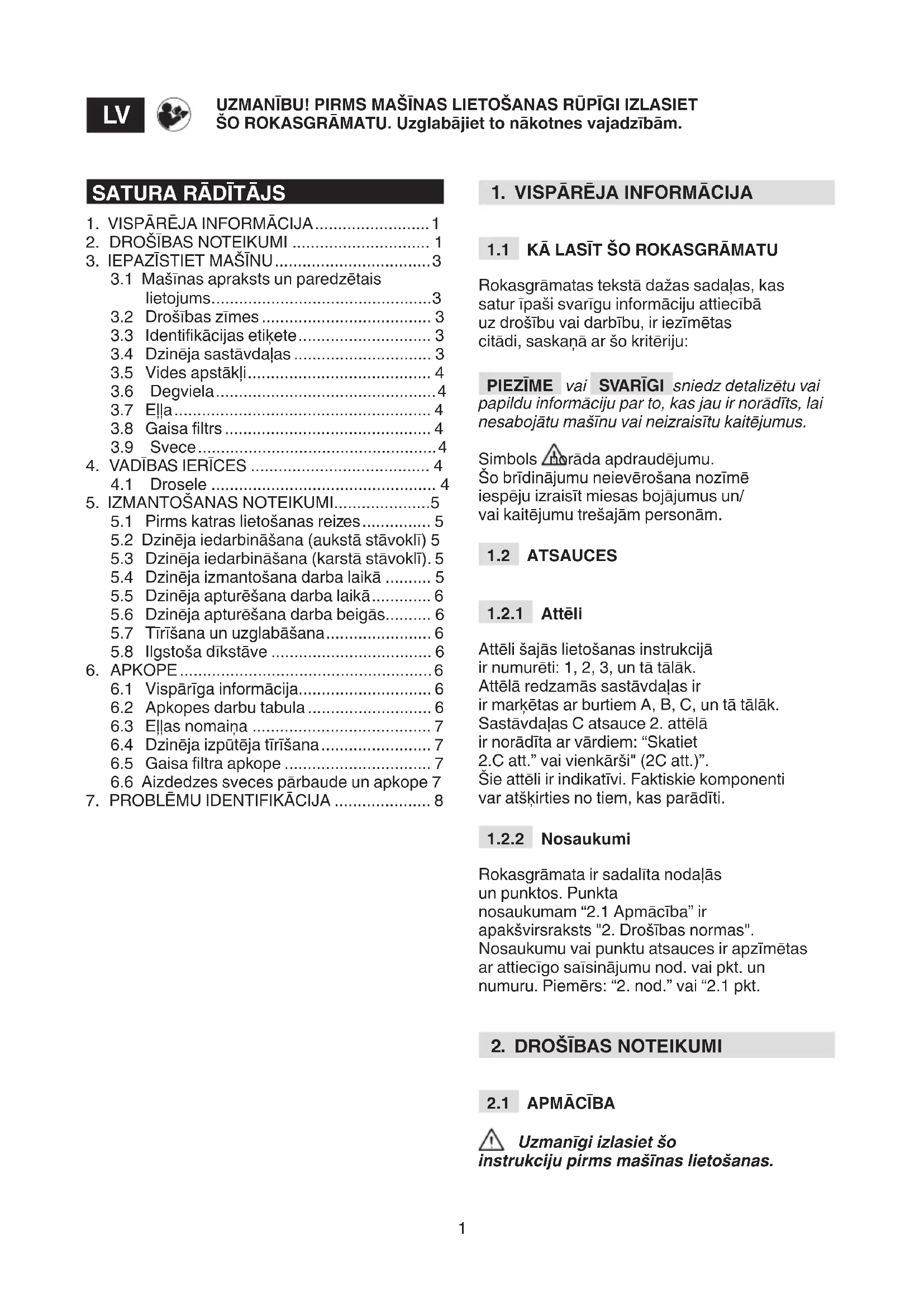 Uzmanīgi izlasiet šo instrukciju pirms mašīnas lietošanas. UZMANĪBU! PIRMS MAŠĪNAS LIETOŠANAS RŪPĪGI IZLASIET ŠO ROKASGRĀMATU. Uzglabājiet to nākotnes vajadzībām.