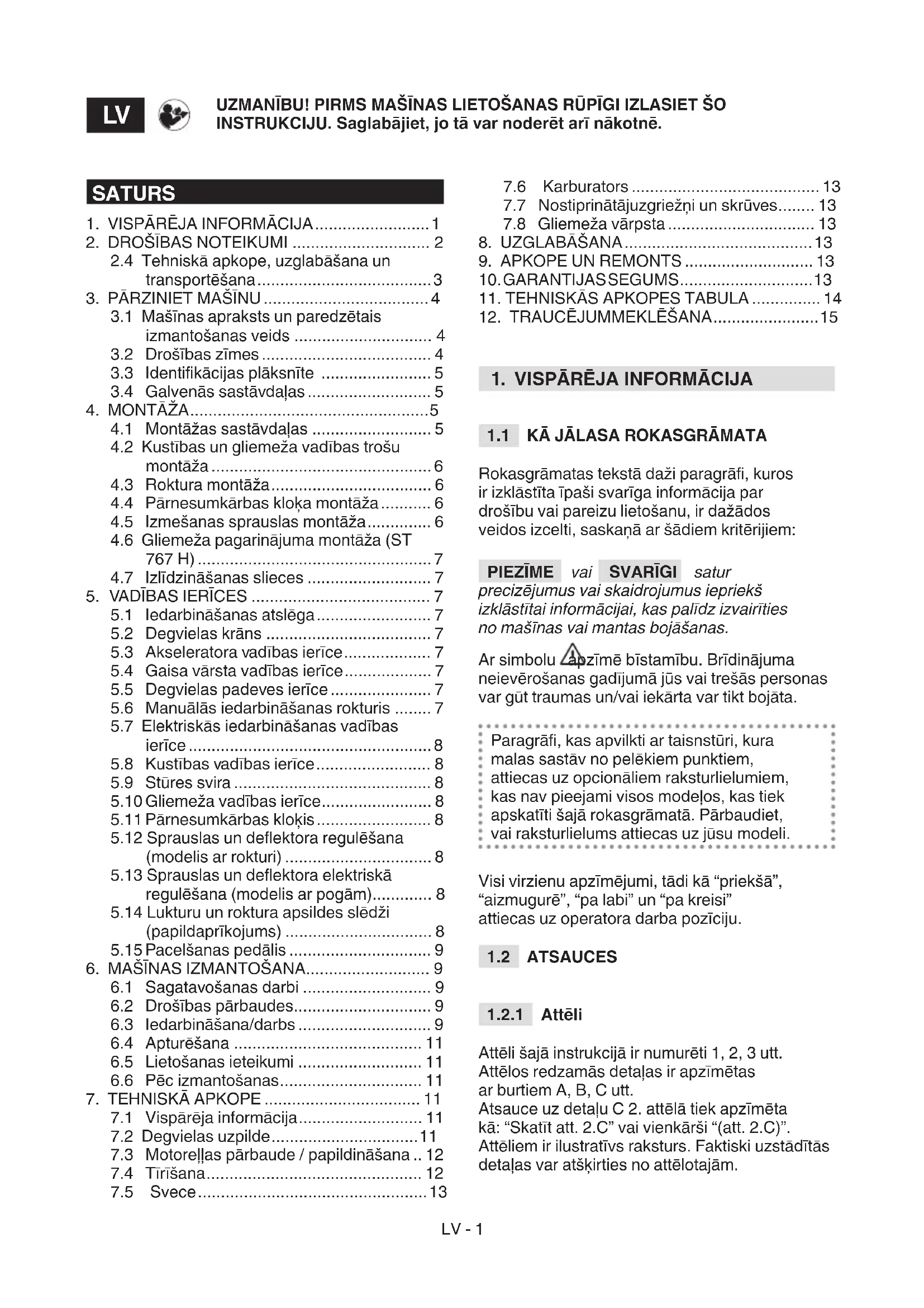 Attēli šajā instrukcijā ir numurēti 1, 2, 3 utt. Attēlos redzamās detaļas ir apzīmētas ar burtiem A, B, C utt. Atsauce uz detaļu C 2. attēlā tiek apzīmēta kā: “Skatīt att. 2.C” vai vienkārši “(att. 2.C)”. Attēliem ir ilustratīvs raksturs. Faktiski uzstādītās detaļas var atšķirties no attēlotajām. UZMANĪBU! PIRMS MAŠĪNAS LIETOŠANAS RŪPĪGI IZLASIET ŠO INSTRUKCIJU. Saglabājiet, jo tā var noderēt arī nākotnē.