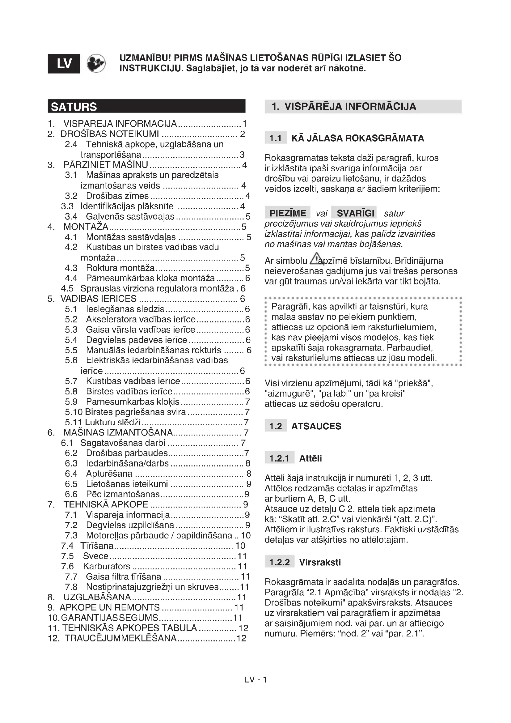 Rokasgrāmata ir sadalīta nodaļās un paragrāfos. Paragrāfa “2.1 Apmācība” virsraksts ir nodaļas "2. Drošības noteikumi" apakšvirsraksts. Atsauces uz virsrakstiem vai paragrāem ir apzīmētas ar saīsinājumiem nod. vai par. un ar attiecīgo numuru. Piemērs: “nod. 2” vai “par. 2.1”. UZMANĪBU! PIRMS MAŠĪNAS LIETOŠANAS RŪPĪGI IZLASIET ŠO INSTRUKCIJU. Saglabājiet, jo tā var noderēt arī nākotnē.