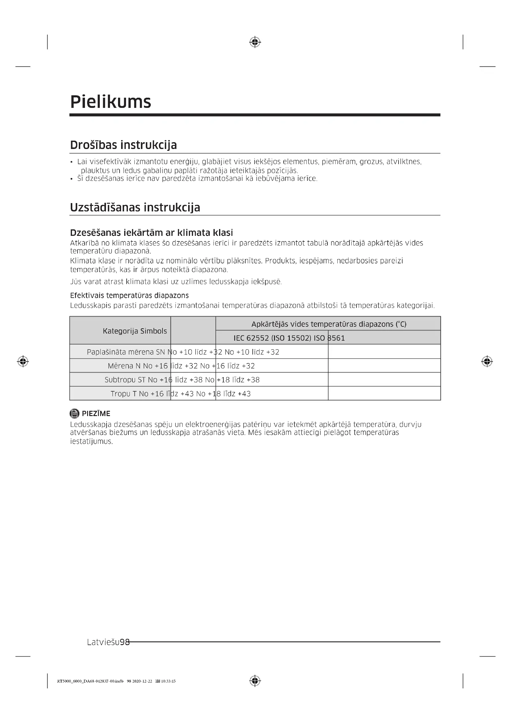 Paplašināta mērena SN No +10 līdz +32 No +10 līdz +32 Mērena N No +16 līdz +32 No +16 līdz +32 Subtropu ST No +16 līdz +38 No +18 līdz +38 Tropu T No +16 līdz +43 No +18 līdz +43 PIEZĪME Ledusskapja dzesēšanas spēju un elektroenerģijas patēriņu var ietekmēt apkārtējā temperatūra, durvju atvēršanas biežums un ledusskapja atrašanās vieta. Mēs iesakām attiecīgi pielāgot temperatūras iestatījumus. RT5000_6000_DA68-04283F-00.indb 98 2020-12-22 10:33:45Latviešu 99 Temperatūras instrukcija Ieteicamā temperatūra Optimālais temperatūras iestatījums pārtikas glabāšanai: