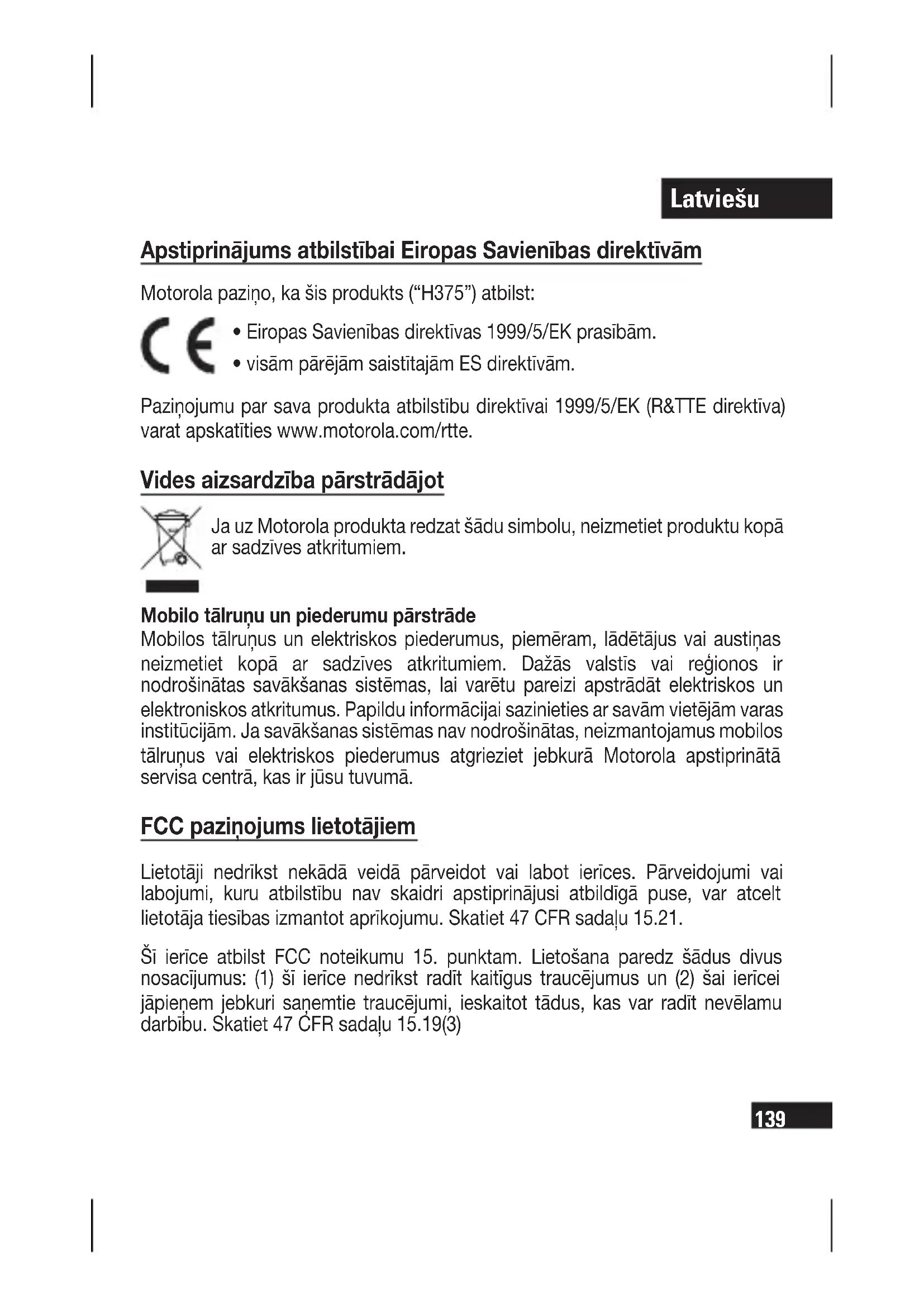 - visām pārējām saistītajām ES direktīvām. Paziņojumu par sava produkta atbilstību direktīvai 1999/5/EK (R&TTE direktīva) varat apskatīties www.motorola.com/rtte. Vides aizsardzība pārstrādājot Ja uz Motorola produkta redzat šādu simbolu, neizmetiet produktu kopā ar sadzīves atkritumiem. Mobilo tālruņu un piederumu pārstrāde Mobilos tālruņus un elektriskos piederumus, piemēram, lādētājus vai austiņas neizmetiet kopā ar sadzīves atkritumiem. Dažās valstīs vai reģionos ir nodrošinātas savākšanas sistēmas, lai varētu pareizi apstrādāt elektriskos un elektroniskos atkritumus. Papildu informācijai sazinieties ar savām vietējām varas institūcijām. Ja savākšanas sistēmas nav nodrošinātas, neizmantojamus mobilos tālruņus vai elektriskos piederumus atgrieziet jebkurā Motorola apstiprinātā servisa centrā, kas ir jūsu tuvumā. FCC paziņojums lietotājiem Lietotāji nedrīkst nekādā veidā pārveidot vai labot ierīces. Pārveidojumi vai labojumi, kuru atbilstību nav skaidri apstiprinājusi atbildīgā puse, var atcelt lietotāja tiesības izmantot aprīkojumu. Skatiet 47 CFR sadaļu 15.21. Šī ierīce atbilst FCC noteikumu 15. punktam. Lietošana paredz šādus divus nosacījumus: (1) šī ierīce nedrīkst radīt kaitīgus traucējumus un (2) šai ierīcei jāpieņem jebkuri saņemtie traucējumi, ieskaitot tādus, kas var radīt nevēlamu darbību. Skatiet 47 CFR sadaļu 15.19(3)Latviešu