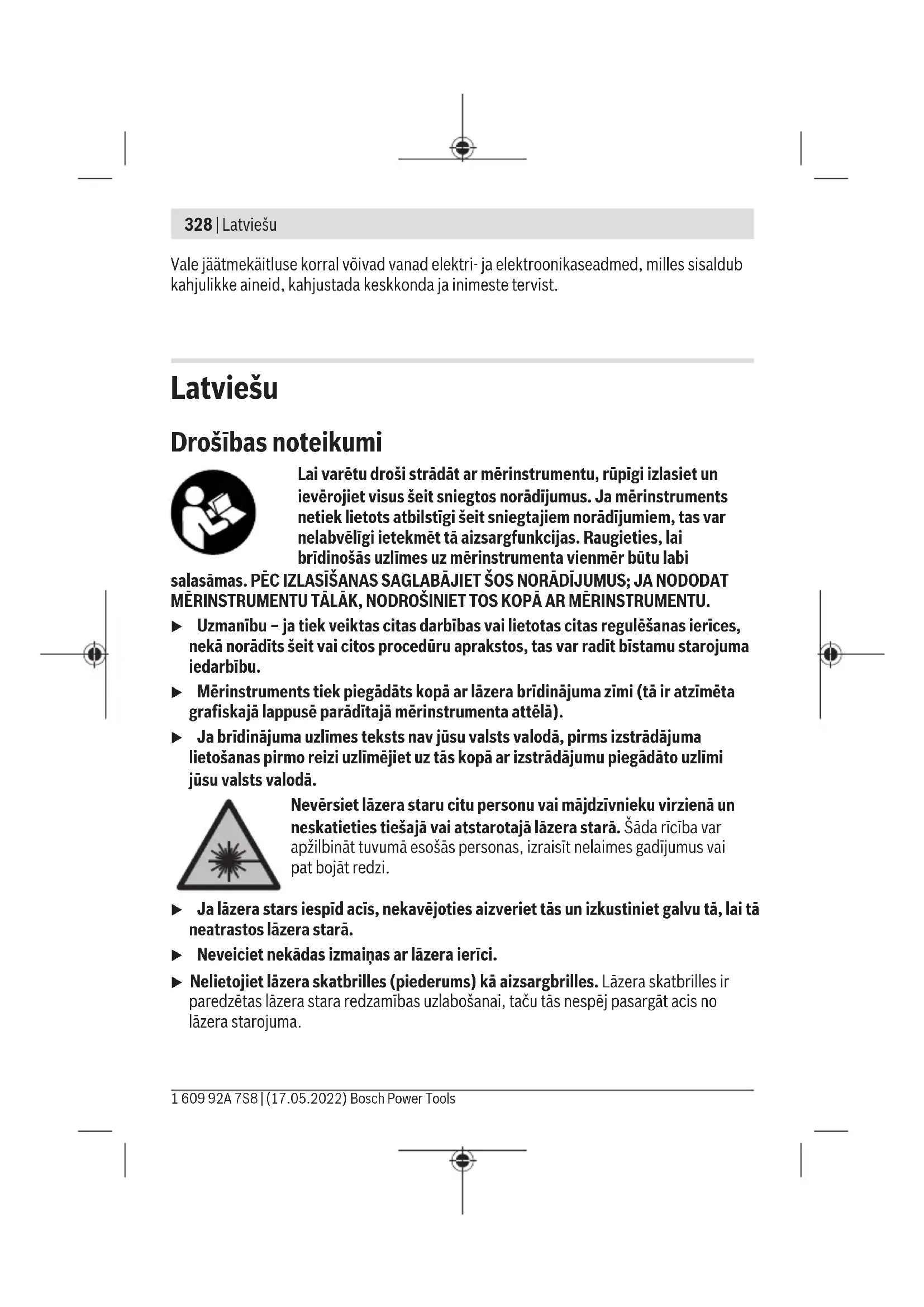 180° – Pagrieziet mērinstrumentu par 180°. Novietojiet mērinstrumentu tā, lai apakšējā lāzera stara projicēšanas vietas viduspunkts uz grīdas sakristu ar jau atzīmēto punktuII. Nogaidiet, līdz beidzas mērinstrumenta pašizlīdzināšanās. Atzīmējiet augšējā lāzera stara projicēšanas vietas viduspunktu uz griestiem (punktsIII). – Attālums d starp abiem uz griestiem atzīmētajiem punktiem I un III ir vienāds ar mērinstrumenta faktisko nolieci no vertikāles. 1 609 92A 7S8 | (17.05.2022) Bosch Power ToolsLatviešu | 337 Maksimālo pieļaujamo nolieci var aprēķināt šādi: divkāršs attālums starp grīdu un griestiem×0,35mm/m. Piemērs: pie attāluma starp grīdu un griestiem 2,5m maksimālā pieļaujamā noliece ir šāda: 2×2,5m×±0,35mm/m=±1,75mm. No tā izriet, ka attālums starp punktiem Ⅰ unⅢ nedrīkst pārsniegt 1,75mm. Norādījumi darbam u Marķējumu veidošanai vienmēr izmantojiet lāzera stara veidotā projekcijas apļa viduspunktu. Lāzera stara veidotā projekcijas apļa izmēri mainās līdz ar attālumu no lāzera. Darbs ar statīvu (papildpiederums) Statīvs ir ierīce ar regulējamu augstumu, kas paredzēta mērinstrumenta stabilai nostiprināšanai. Novietojiet mērinstrumentu uz statīva tā, lai tā vītne (4) atrastos pret statīva (11) vai tirdzniecībā pieejama fotostatīva 1/4" stiprinājuma skrūvi. Stingri pieskrūvējiet mērinstrumentu ar statīva stiprinājuma skrūvi. Pirms mērinstrumenta ieslēgšanas aptuveni izlīdziniet statīvu. Stiprināšana ar magnētisko pagriežamo turētāju (skatietattēlusA–B) Ar iebūvēto magnētisko pagriežamo turētāju(3) mērinstrumentu var stiprināt pie magnetizējamiem materiāliem. u Nelieciet pirkstus uz magnētiskā pagriežamā turētāja aizmugures, kad piestiprināt pagriežamo turētāju pie virsmas. Magnētu(7) stiprā pievilkšanas spēka dēļ var iespiest pirkstus. Pirms ieslēdzat mērinstrumentu, aptuveni izlīdziniet magnētisko pagriežamo turētāju(3). Pagrieziet mērinstrumentu uz magnētiskā pagriežamā turētāja(3) tā, ka apakšējais lāzera punkts ir redzams vai ka augstums ir atzīmēts ar horizontālo lāzera punktu. Pirms izslēdzat un transportējat mērinstrumentu, fiksējiet to uz magnētiskā pagriežamā turētāja (skatiet attēluB). Lāzera skatbrilles (papildpiederums) Lāzera skatbrillēm piemīt īpašība aizturēt apkārtējo gaismu, tāpēc lāzera stars acīm liekas spilgtāks. u Nelietojiet lāzera skatbrilles (piederums) kā aizsargbrilles. Lāzera skatbrilles ir paredzētas lāzera stara redzamības uzlabošanai, taču tās nespēj pasargāt acis no lāzera starojuma. Bosch Power Tools 1 609 92A 7S8 | (17.05.2022)338 | Latviešu u Nelietojiet lāzera skatbrilles kā saules brilles vai kā brilles, vadot satiksmes līdzekli. Lāzera skatbrilles nenodrošina pilnvērtīgu aizsardzību no ultravioletā starojuma un pasliktina krāsu izšķiršanas spēju. Darba operāciju piemēri (attēli C–E) Mērinstrumenta lietošanas piemēri ir sniegti grafiskajās lappusēs. Apkalpošana un apkope Apkalpošana un tīrīšana Uzturiet mērinstrumentu tīru. Neiegremdējiet mērinstrumentu ūdenī vai citos šķidrumos. Apslaukiet izstrādājumu ar mitru, mīkstu lupatiņu. Nelietojiet moduļa apkopei tīrīšanas līdzekļus vai šķīdinātājus. Regulāri un īpaši rūpīgi tīriet lāzera stara izvadlūku virsmas un sekojiet, lai uz tām neveidotos nosēdumi. Uzglabāšanas un transportēšanas laikā ievietojiet mērinstrumentu kopā ar to piegādātajā aizsargsomā (12). Ja mērinstrumentam nepieciešams remonts, nosūtiet to, ievietojot aizsargsomā (12). Klientu apkalpošanas dienests un konsultācijas par lietošanu Klientu apkalpošanas dienests atbildēs uz Jūsu jautājumiem par izstrādājumu remontu un apkalpošanu, kā arī par to rezerves daļām. Kopsalikuma attēlus un informāciju par rezerves daļām Jūs varat atrast interneta vietnē: www.bosch-pt.com Bosch konsultantu grupa palīdzēs Jums vislabākajā veidā rast atbildes uz jautājumiem par mūsu izstrādājumiem un to piederumiem. Pieprasot konsultācijas un pasūtot rezerves daļas, noteikti paziņojiet 10zīmju izstrādājuma numuru, kas norādīts uz izstrādājuma marķējuma plāksnītes. Latvijas Republika Robert Bosch SIA Bosch elektroinstrumentu servisa centrs Mūkusalas ielā 97 LV-1004 Rīga Tālr.: 67146262 Telefakss: 67146263 E-pasts: service-pt@lv.bosch.com 1 609 92A 7S8 | (17.05.2022) Bosch Power ToolsLietuvių k. | 339 Papildu klientu apkalpošanas dienesta adreses skatiet šeit: www.bosch-pt.com/serviceaddresses Atbrīvošanās no nolietotajiem izstrādājumiem Nolietotie mērinstrumenti, to piederumi un iesaiņojuma materiāli jāpārstrādā apkārtējai videi nekaitīgā veidā. Neizmetiet mērinstrumentu un baterijas sadzīves atkritumu tvertnē! Tikai EK valstīm. Saskaņā ar Eiropas Savienības direktīvu 2012/19/ES par nolietotajām elektriskajām un elektroniskajām ierīcēm un šīs direktīvas atspoguļojumiem nacionālajā likumdošanā, lietošanai nederīgas mērierīces un saskaņā ar Eiropas Savienības direktīvu 2006/66/EK, bojāti vai izlietoti akumulatori/baterijas ir jāsavāc atsevišķi un jānogādā otrreizējai pārstrādei apkārtējai videi nekaitīgā veidā. Ja elektriskās un elektroniskās ierīces netiek atbilstoši utilizētas, tās var kaitēt videi un cilvēku veselībai iespējamās bīstamo vielu klātbūtnes dēļ. Lietuvių k. Saugos nuorodos Kad su matavimo prietaisu dirbtumėte nepavojingai ir saugiai, perskaitykite visas nuorodas ir jų laikykitės. Jei matavimo prie- taisas naudojamas nesilaikant pateiktų nuorodų, gali būti pake- nkta matavimo prietaise integruotiems apsauginiams įtaisams. Pasirūpinkite, kad įspėjamieji ženklai ant matavimo prietaiso vi- sada būtų įskaitomi. IŠSAUGOKITE ŠIĄ INSTRUKCIJĄ IR ATIDUOKITE JĄ KARTU SU MATAVIMO PRIETAISU, JEI PERDUODATE JĮ KITAM SAVININKUI. 