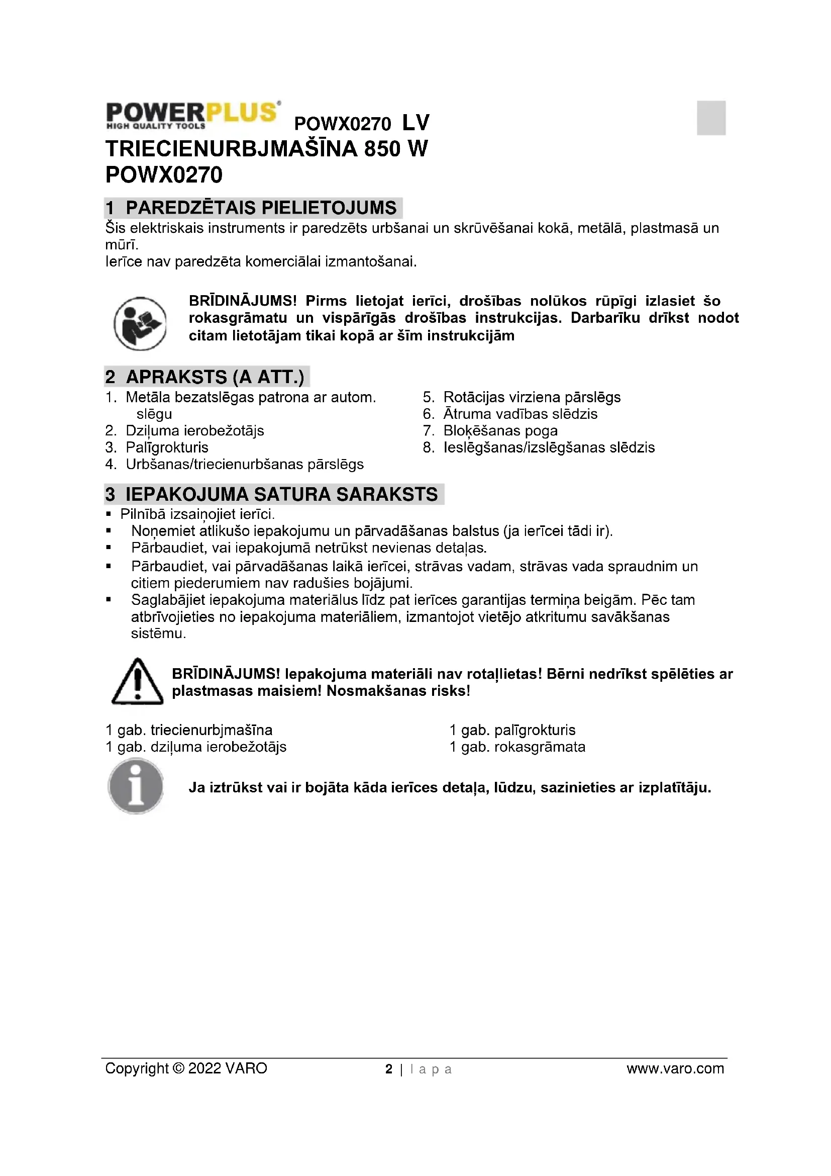 - Ja darbarīku nepieciešams lietot mitrā darba vietā, lietojiet uz diferenciālo strāvu reaģējošu automātslēdzi (RCD). RCD samazinās elektrošoka risku.POWX0270 LV Copyright © 2022 VARO 4 | l a p a www.varo.com