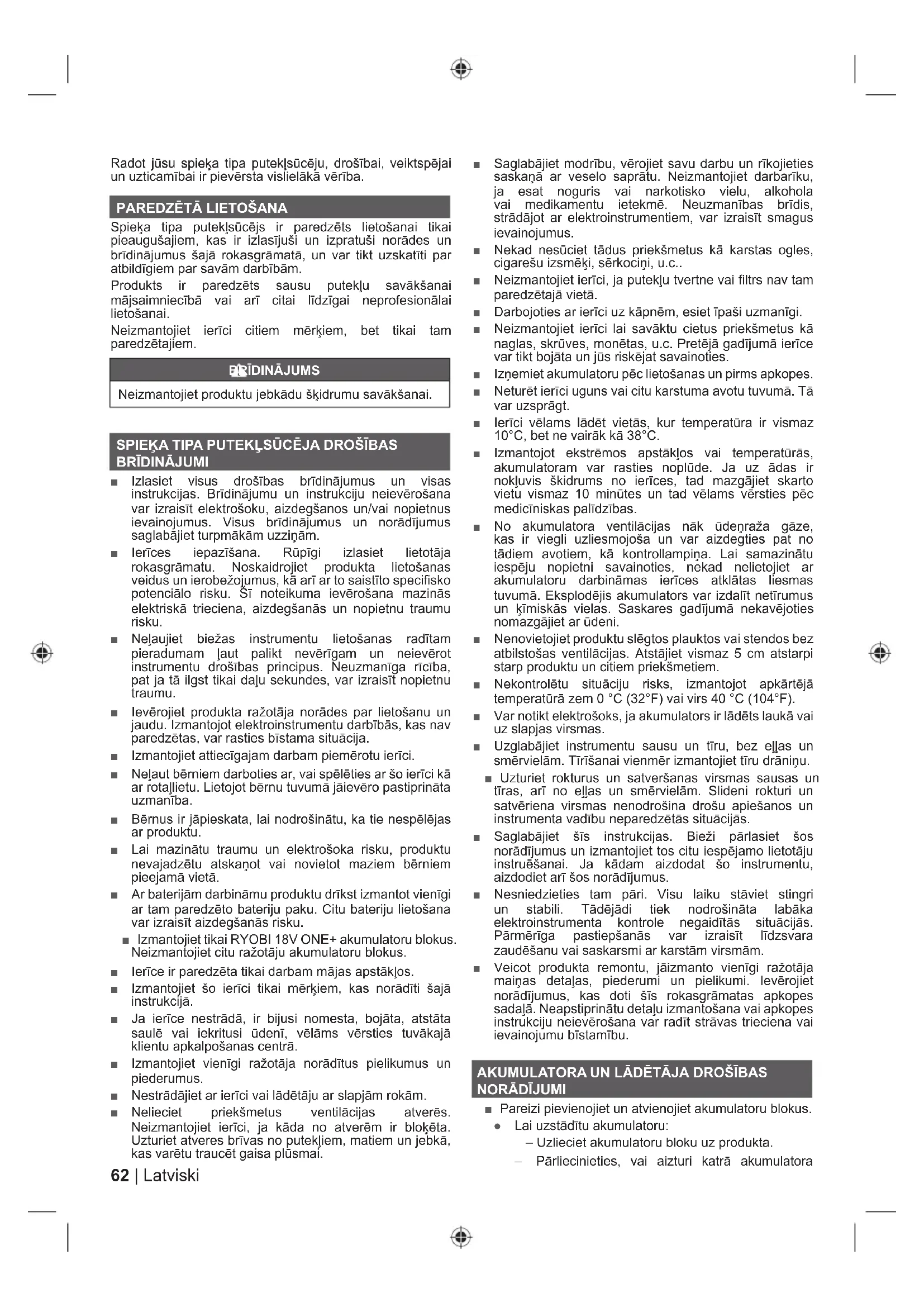 ■ Izlasiet visus drošības brīdinājumus un visas instrukcijas. Brīdinājumu un instrukciju neievērošana var izraisīt elektrošoku, aizdegšanos un/vai nopietnus ievainojumus. Visus brīdinājumus un norādījumus saglabājiet turpmākām uzziņām. ■ Ierīces iepazīšana. Rūpīgi izlasiet lietotāja rokasgrāmatu. Noskaidrojiet produkta lietošanas veidus un ierobežojumus, kā arī ar to saistīto specifisko potenciālo risku. Šī noteikuma ievērošana mazinās elektriskā trieciena, aizdegšanās un nopietnu traumu risku. ■ Neļaujiet biežas instrumentu lietošanas radītam pieradumam ļaut palikt nevērīgam un neievērot instrumentu drošības principus. Neuzmanīga rīcība, pat ja tā ilgst tikai daļu sekundes, var izraisīt nopietnu traumu. ■ Ievērojiet produkta ražotāja norādes par lietošanu un jaudu. Izmantojot elektroinstrumentu darbībās, kas nav paredzētas, var rasties bīstama situācija. ■ Izmantojiet attiecīgajam darbam piemērotu ierīci. ■ Neļaut bērniem darboties ar, vai spēlēties ar šo ierīci kā ar rotaļlietu. Lietojot bērnu tuvumā jāievēro pastiprināta uzmanība. ■ Bērnus ir jāpieskata, lai nodrošinātu, ka tie nespēlējas ar produktu. ■ Lai mazinātu traumu un elektrošoka risku, produktu nevajadzētu atskaņot vai novietot maziem bērniem pieejamā vietā. ■ Ar baterijām darbināmu produktu drīkst izmantot vienīgi ar tam paredzēto bateriju paku. Citu bateriju lietošana var izraisīt aizdegšanās risku. ■ Izmantojiet tikai RYOBI 18V ONE+ akumulatoru blokus. Neizmantojiet citu ražotāju akumulatoru blokus. ■ Ierīce ir paredzēta tikai darbam mājas apstākļos. ■ Izmantojiet šo ierīci tikai mērķiem, kas norādīti šajā instrukcijā. ■ Ja ierīce nestrādā, ir bijusi nomesta, bojāta, atstāta saulē vai iekritusi ūdenī, vēlāms vērsties tuvākajā klientu apkalpošanas centrā. ■ Izmantojiet vienīgi ražotāja norādītus pielikumus un piederumus. ■ Nestrādājiet ar ierīci vai lādētāju ar slapjām rokām. ■ Nelieciet priekšmetus ventilācijas atverēs. Neizmantojiet ierīci, ja kāda no atverēm ir bloķēta. Uzturiet atveres brīvas no putekļiem, matiem un jebkā, kas varētu traucēt gaisa plūsmai. ■ Saglabājiet modrību, vērojiet savu darbu un rīkojieties saskaņā ar veselo saprātu. Neizmantojiet darbarīku, ja esat noguris vai narkotisko vielu, alkohola vai medikamentu ietekmē. Neuzmanības brīdis, strādājot ar elektroinstrumentiem, var izraisīt smagus ievainojumus. ■ Nekad nesūciet tādus priekšmetus kā karstas ogles, cigarešu izsmēķi, sērkociņi, u.c.. ■ Neizmantojiet ierīci, ja putekļu tvertne vai filtrs nav tam paredzētajā vietā. ■ Darbojoties ar ierīci uz kāpnēm, esiet īpaši uzmanīgi. ■ Neizmantojiet ierīci lai savāktu cietus priekšmetus kā naglas, skrūves, monētas, u.c. Pretējā gadījumā ierīce var tikt bojāta un jūs riskējat savainoties. ■ Izņemiet akumulatoru pēc lietošanas un pirms apkopes. ■ Neturēt ierīci uguns vai citu karstuma avotu tuvumā. Tā var uzsprāgt. ■ Ierīci vēlams lādēt vietās, kur temperatūra ir vismaz 10°C, bet ne vairāk kā 38°C. ■ Izmantojot ekstrēmos apstākļos vai temperatūrās, akumulatoram var rasties noplūde. Ja uz ādas ir nokļuvis škidrums no ierīces, tad mazgājiet skarto vietu vismaz 10 minūtes un tad vēlams vērsties pēc medicīniskas palīdzības. ■ No akumulatora ventilācijas nāk ūdeņraža gāze, kas ir viegli uzliesmojoša un var aizdegties pat no tādiem avotiem, kā kontrollampiņa. Lai samazinātu iespēju nopietni savainoties, nekad nelietojiet ar akumulatoru darbināmas ierīces atklātas liesmas tuvumā. Eksplodējis akumulators var izdalīt netīrumus un ķīmiskās vielas. Saskares gadījumā nekavējoties nomazgājiet ar ūdeni. ■ Nenovietojiet produktu slēgtos plauktos vai stendos bez atbilstošas ventilācijas. Atstājiet vismaz 5 cm atstarpi starp produktu un citiem priekšmetiem. ■ Nekontrolētu situāciju risks, izmantojot apkārtējā temperatūrā zem 0 °C (32°F) vai virs 40 °C (104°F). ■ Var notikt elektrošoks, ja akumulators ir lādēts laukā vai uz slapjas virsmas. ■ Uzglabājiet instrumentu sausu un tīru, bez eļļas un smērvielām. Tīrīšanai vienmēr izmantojiet tīru drāniņu. ■ Uzturiet rokturus un satveršanas virsmas sausas un tīras, arī no eļļas un smērvielām. Slideni rokturi un satvēriena virsmas nenodrošina drošu apiešanos un instrumenta vadību neparedzētās situācijās. ■ Saglabājiet šīs instrukcijas. Bieži pārlasiet šos norādījumus un izmantojiet tos citu iespējamo lietotāju instruēšanai. Ja kādam aizdodat šo instrumentu, aizdodiet arī šos norādījumus. ■ Nesniedzieties tam pāri. Visu laiku stāviet stingri un stabili. Tādējādi tiek nodrošināta labāka elektroinstrumenta kontrole negaidītās situācijās. Pārmērīga pastiepšanās var izraisīt līdzsvara zaudēšanu vai saskarsmi ar karstām virsmām. ■ Veicot produkta remontu, jāizmanto vienīgi ražotāja maiņas detaļas, piederumi un pielikumi. Ievērojiet norādījumus, kas doti šīs rokasgrāmatas apkopes sadaļā. Neapstiprinātu detaļu izmantošana vai apkopes instrukciju neievērošana var radīt strāvas trieciena vai ievainojumu bīstamību. AKUMULATORA UN LĀDĒTĀJA DROŠĪBAS
