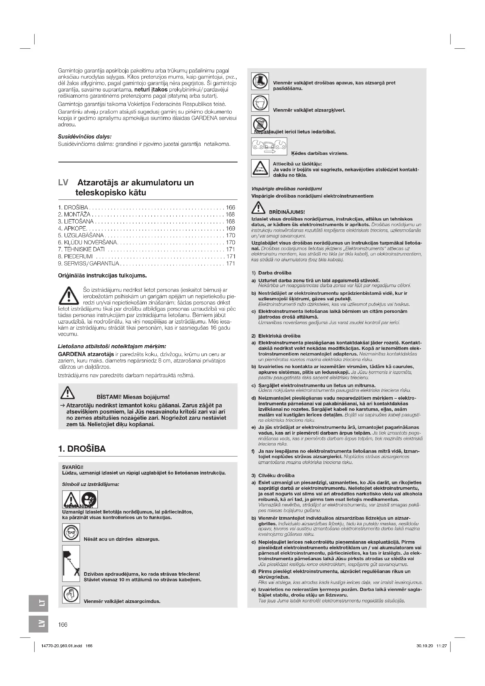 - Pirkuma čeka uzrādīšana. Garantija nav attiecināma uz detaļu un komponentu (piemēram, nažu, nažu stiprinājuma daļu, turbīnu, apgaismes līdzekļu, ķīļsiksnu un zobsiks- nu, darba ratu, gaisa filtru, aizdedzes sveču) normālu nodilumu, optiskām izmaiņām, kā arī uz dilstošajām un patērējamajām detaļām. Šī ražotāja garantija paredz vienīgi izstrādājuma apmaiņu un remontu saskaņā ar iepriekš minētajiem nosacījumiem. Citu mums kā ražotājam izvirzītu prasību apmierināšana, piemēram, zaudējumu atlīdzināšanu, ražotāja garantija neparedz. Šī ražotāja garantija neskar likumā un līgumā noteiktās garantijas prasības, ko lietotājs var izvirzīt pret veikalu / pārdevēju. Ražotāja garantijas spēkā esamību un darbību reglamentē Vācijas Federatīvās Republikas tiesību akti. Iestājoties garantijas gadījumam, lūdzam nosūtīt defektīvo izstrādājumu kopā ar pirkuma čeka kopiju un kļūmes aprakstu uz aizmugurē norādīto GARDENA servisa adresi, pilnībā apmaksājot pasta izdevumus. Dilstošas detaļas: Uz dilstošajām detaļām – ķēdi un tās turētāju garantija neattiecas. 14770-20.960.01.indd 171 30.10.20 11:27172 Produktbezeichnung: Description of the product: Désignation du produit : Beschrijving van het product: Beskrivning av produkten: Beskrivelse af produktet: Tuotteen kuvaus: Descrizione del prodotto: Descripción del producto: Descrição do produto: Opis produktu: A termék leírása: Popis výrobku: Popis produktu: Περιγραφή του προϊόντος: Opis izdelka: Opis proizvoda: Descrierea produsului: Описание на продукта: Toote kirjeldus: Gaminio aprašas: Izstrādājuma apraksts: Akku-Hochentaster Battery Pole Pruner Élagueuse sur perche sur accu Accu-telescoopkettingzaag Batteridriven Kvistsåg Akku-grensav til højtsiddende grene Accu-raivaussaha Potatore telescopico a batteria Sierra de pértiga telescópica conaccu Serra accu para poda em altura Akumulatorowa pilarka łańcuchowa z trzonkiem teleskopowym Akkumulátoros magassági ágvágó Akumulátorová teleskopická vyvětvovací pilka Akumulátorový teleskopický odvetvovač Τηλεσκοπικό αλυσοπρίονο μπαταρίας Akumulatorski obrezovalnik za veje Akumulatorska teleskopska pila Foarfecă cu acumulator pentru rărirea crengilor copacilor înalţi Телескопична акумулаторна кастрачка Akuga kõrglõikur Akumuliatorinė aukštapjovė Atzarotājs ar akumulatoru un teleskopisko kātu Produkttyp: Product type: Type de produit : Producttype: Produkttyp: Produkttype: Tuotetyyppi: Tipo adi prodotto: Tipo de producto: Tipo de produto: Typ produktu: Terméktípus: Druh výrobku: Typ produktu: Τύπος προϊόντος: Vrsta izdelka: Vrsta proizvoda: Tip produs: Тип продукт: Tootetüüp: Gaminio tipas: Produkta veids: