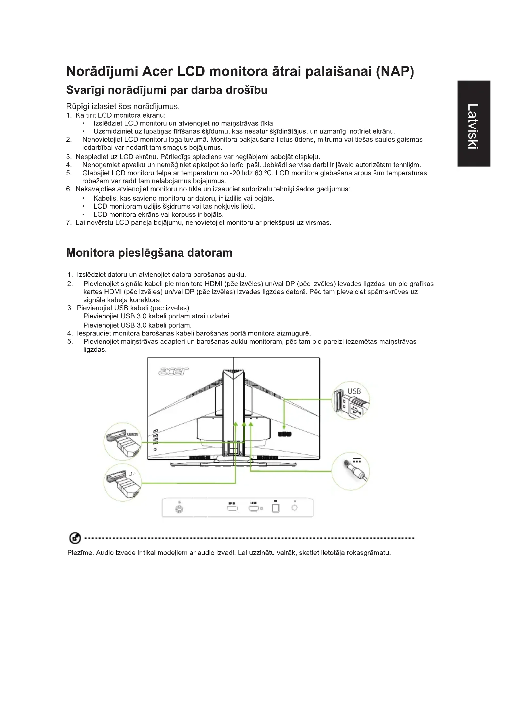 Ieslēgtārežīmā 45W (tipiski) Miegarežīms 0,5 W (tipiski) Izslēgtā/Gaidīšanas režīmā 0,45 W (tipiski) Ievadsignālasavienotājs DP (tikai DP modelim) HDMI (tikai HDMI modelim) USB centrmezgls / USB 3.0 x 4 (tikai modelim ar USB centrmezglu) Ienākošaisvideosignāls DPsignāls(TikaimodelimarDPievadi) HDMIsignāls(TikaimodelimarHDMIievadi) Skaļruņi(Tipiski) 7 W x 2 Audio Audio izvade (tikai modelim ar audio izvadi) Maksimālieekrānaizmēri Horizontāli:697,344mm Vertikāli:392,256mm Barošanasavots 100-240V,50/60Hzmaiņstrāva Videsapsvērumi Darbatemperatūra:no5līdz35°C Glabāšanastemp.:no-20līdz60°C Pieļaujamaismitrums:no10līdz85% Izmēri 712,7(plat.)×484~604(augst.)×298,3(dziļ.)mm Svars (netto) 10,1kgkomplektā(tīrsvars) Mehāniskiedati Sasvērums:no-5līdz+25° Pagrieziens: +/- 25° Augstumapielāgošana:120mm Locīkla:nav Noņemamspamatnesstatnis:ir Ārējievadībaselementi: Functions (Funkcijas) Spilgtums Kontrasts Zila gaisma Tumšāpastiprinājums Adaptīvaiskontrasts Gamma Krāsutemperatūra Piesātinājums 6asukrāsa Skaļums Paātrinājums Mērķapuunkts Valoda OSD taimauts Caurspīdīgums Atsvaidzesintensitāte Ievade Apkārtējāgaisma Karstātaustiņapiešķire Platekrānarežīms Dziļaismiegs Ātrāspalaišanasrežīms UzlādearUSBnoizslēgtasierīces Spēļurežīms *Visitehniskiedativartiktgrozītibezbrīdinājuma. RokasgrāmatasuncitusdokumentussavaiAcerierīceivaratatrastociālajāAceratbalstatīmekļavietnē. *Enerģijaspatēriņugadalaikāaprēķina,izmantojottipiskuenerģijaspatēriņu4stundulaikāikdienu,365dienasgadā.Lietuviu „Acer“ skystųjų kristalų ekrano monitoriaus greito parengimo darbui vadovas (GPV) Svarbios saugos instrukcijos Atidžiaiperskaitykitešiasinstrukcijas.
