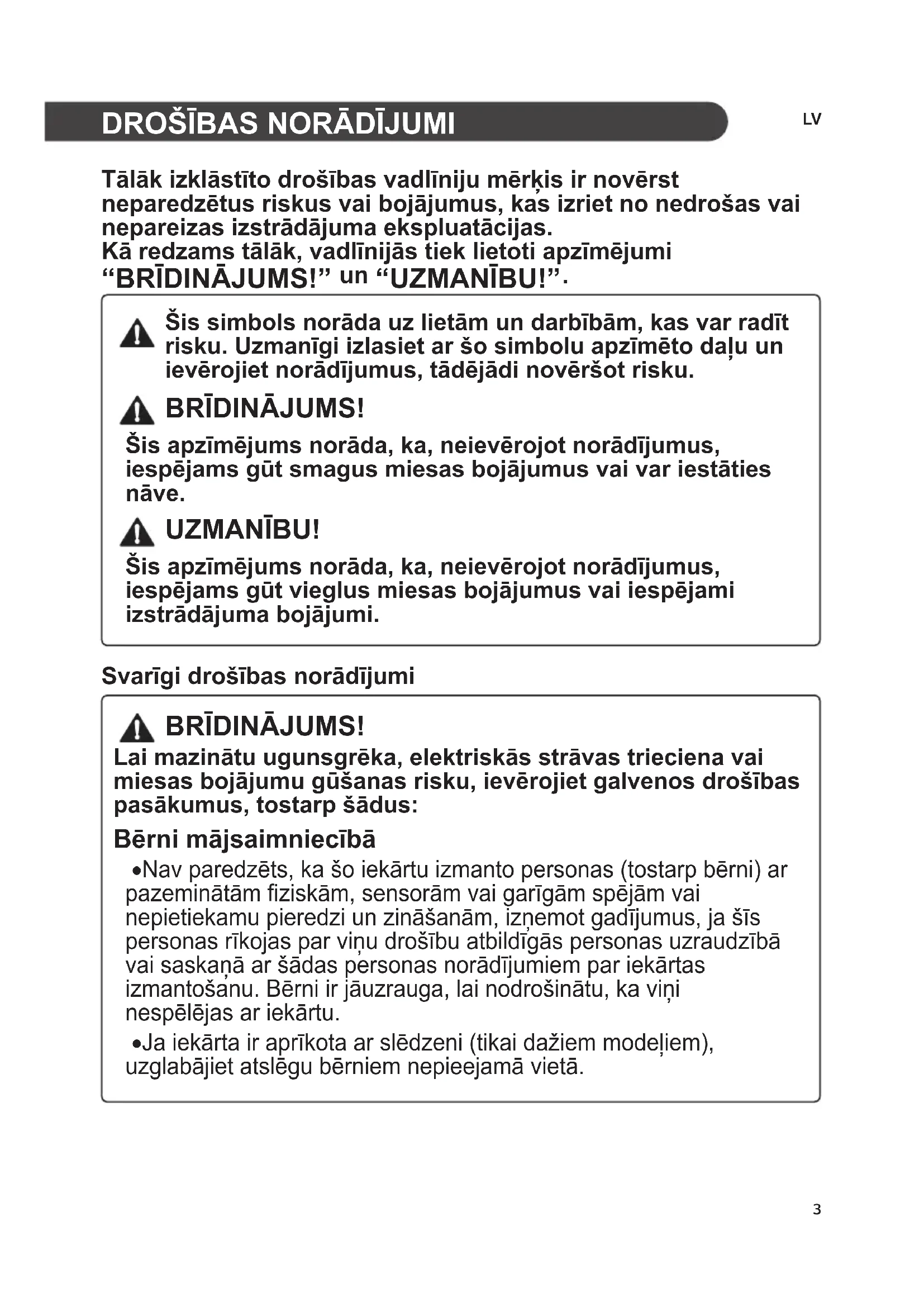 Šis simbols norāda uz lietām un darbībām, kas var radīt risku. Uzmanīgi izlasiet ar šo simbolu apzīmēto daļu un ievērojiet norādījumus, tādējādi novēršot risku. BRĪDINĀJUMS! Šis apzīmējums norāda, ka, neievērojot norādījumus, iespējams gūt smagus miesas bojājumus vai var iestāties nāve. UZMANĪBU! Šis apzīmējums norāda, ka, neievērojot norādījumus, iespējams gūt vieglus miesas bojājumus vai iespējami izstrādājuma bojājumi. Svarīgi drošības norādījumi BRĪDINĀJUMS! Lai mazinātu ugunsgrēka, elektriskās strāvas trieciena vai miesas bojājumu gūšanas risku, ievērojiet galvenos drošības pasākumus, tostarp šādus: Bērni mājsaimniecībā