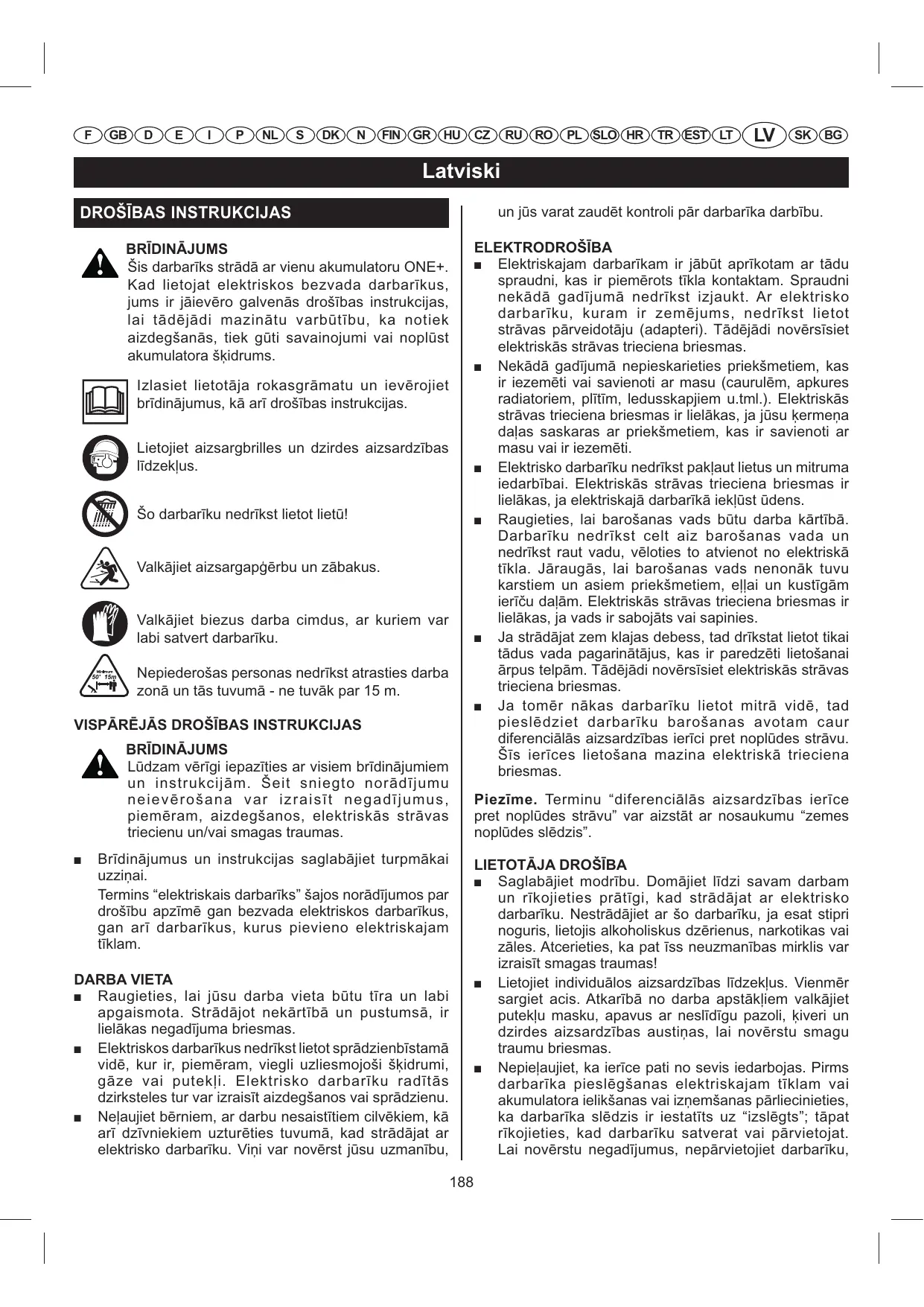 Portez des protections auditives et oculaires. N'utilisez pas votre outil sous la pluie ! Portez des vêtements et des bottes de protection. Portez des gants de travail épais et agrippants. Maintenez les visiteurs à une distance d’au moins 15 m de la zone de travail. CONSIGNES DE SÉCURITÉ GÉNÉRALES AVERTISSEMENT Lisez attentivement tous les avertissements et toutes les instructions. Le non-respect des instructions présentées ci-après peut entraîner des accidents tels que des incendies, des chocs électriques et/ou des blessures corporelles graves.
