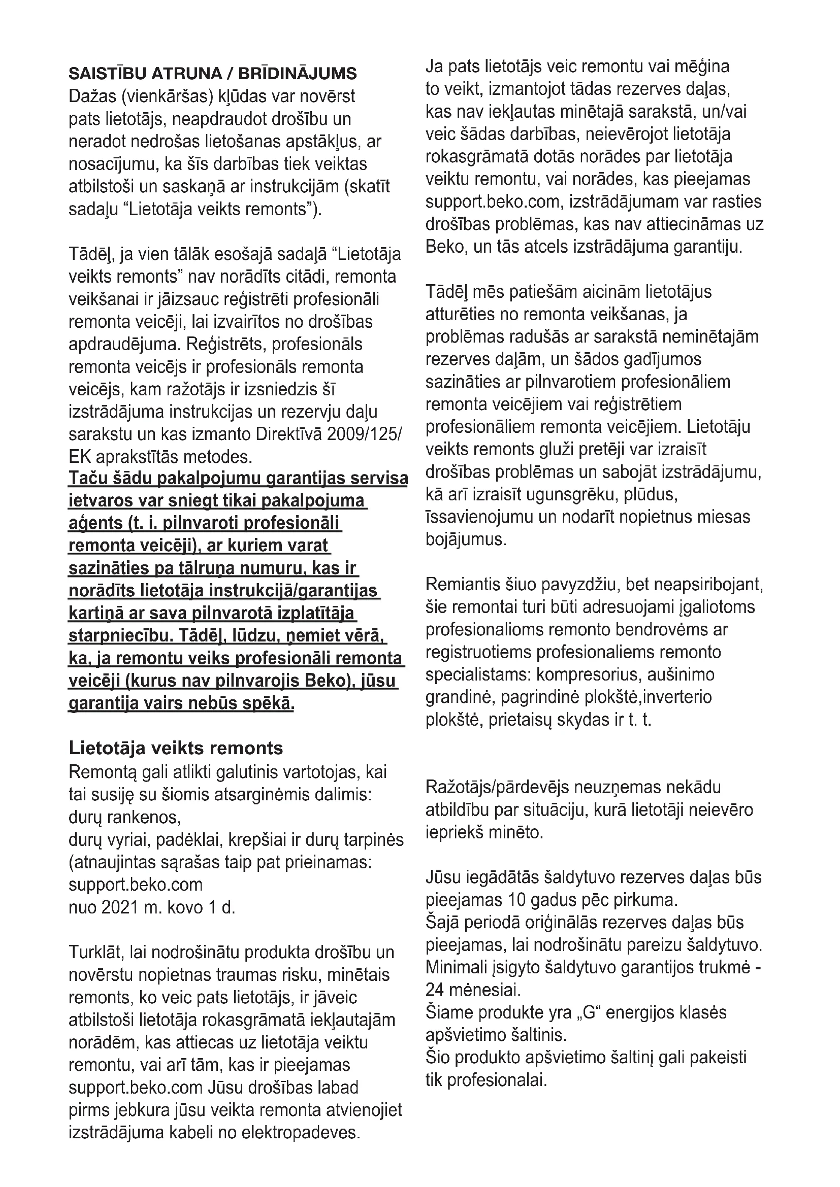 ĮSPĖJIMAS: Jei problema išlieka ir peržiūrėjus šio skyriaus nuorodas, kreipkitės į pardavėją ar įgaliotąjį aptarnavimo centrą. Nebandykite taisyti prietaiso patys.SAISTĪBU ATRUNA / BRĪDINĀJUMS Dažas (vienkāršas) kļūdas var novērst pats lietotājs, neapdraudot drošību un neradot nedrošas lietošanas apstākļus, ar nosacījumu, ka šīs darbības tiek veiktas atbilstoši un saskaņā ar instrukcijām (skatīt sadaļu “Lietotāja veikts remonts”). Tādēļ, ja vien tālāk esošajā sadaļā “Lietotāja veikts remonts” nav norādīts citādi, remonta veikšanai ir jāizsauc reģistrēti profesionāli remonta veicēji, lai izvairītos no drošības apdraudējuma. Reģistrēts, profesionāls remonta veicējs ir profesionāls remonta veicējs, kam ražotājs ir izsniedzis šī izstrādājuma instrukcijas un rezervju daļu sarakstu un kas izmanto Direktīvā 2009/125/ EK aprakstītās metodes. Taču šādu pakalpojumu garantijas servisa ietvaros var sniegt tikai pakalpojuma aģents (t. i. pilnvaroti profesionāli remonta veicēji), ar kuriem varat sazināties pa tālruņa numuru, kas ir norādīts lietotāja instrukcijā/garantijas kartiņā ar sava pilnvarotā izplatītāja starpniecību. Tādēļ, lūdzu, ņemiet vērā, ka, ja remontu veiks profesionāli remonta veicēji (kurus nav pilnvarojis Beko), jūsu garantija vairs nebūs spēkā. Lietotāja veikts remonts Remontą gali atlikti galutinis vartotojas, kai tai susiję su šiomis atsarginėmis dalimis: durų rankenos, durų vyriai, padėklai, krepšiai ir durų tarpinės (atnaujintas sąrašas taip pat prieinamas: support.beko.com nuo 2021 m. kovo 1 d. Turklāt, lai nodrošinātu produkta drošību un novērstu nopietnas traumas risku, minētais remonts, ko veic pats lietotājs, ir jāveic atbilstoši lietotāja rokasgrāmatā iekļautajām norādēm, kas attiecas uz lietotāja veiktu remontu, vai arī tām, kas ir pieejamas support.beko.com Jūsu drošības labad pirms jebkura jūsu veikta remonta atvienojiet izstrādājuma kabeli no elektropadeves. Ja pats lietotājs veic remontu vai mēģina to veikt, izmantojot tādas rezerves daļas, kas nav iekļautas minētajā sarakstā, un/vai veic šādas darbības, neievērojot lietotāja rokasgrāmatā dotās norādes par lietotāja veiktu remontu, vai norādes, kas pieejamas support.beko.com, izstrādājumam var rasties drošības problēmas, kas nav attiecināmas uz Beko, un tās atcels izstrādājuma garantiju. Tādēļ mēs patiešām aicinām lietotājus atturēties no remonta veikšanas, ja problēmas radušās ar sarakstā neminētajām rezerves daļām, un šādos gadījumos sazināties ar pilnvarotiem profesionāliem remonta veicējiem vai reģistrētiem profesionāliem remonta veicējiem. Lietotāju veikts remonts gluži pretēji var izraisīt drošības problēmas un sabojāt izstrādājumu, kā arī izraisīt ugunsgrēku, plūdus, īssavienojumu un nodarīt nopietnus miesas bojājumus. Remiantis šiuo pavyzdžiu, bet neapsiribojant, šie remontai turi būti adresuojami įgaliotoms profesionalioms remonto bendrovėms ar registruotiems profesionaliems remonto specialistams: kompresorius, aušinimo grandinė, pagrindinė plokštė,inverterio plokštė, prietaisų skydas ir t. t. Ražotājs/pārdevējs neuzņemas nekādu atbildību par situāciju, kurā lietotāji neievēro iepriekš minēto. Jūsu iegādātās šaldytuvo rezerves daļas būs pieejamas 10 gadus pēc pirkuma. Šajā periodā oriģinālās rezerves daļas būs pieejamas, lai nodrošinātu pareizu šaldytuvo. Minimali įsigyto šaldytuvo garantijos trukmė - 24 mėnesiai. Šiame produkte yra „G“ energijos klasės apšvietimo šaltinis. Šio produkto apšvietimo šaltinį gali pakeisti tik profesionalai.Lūdzu, pirms ierīces izmantošanas izlasiet šo lietošanas instrukciju! Cienījamais klient, Mēs vēlamies, lai jūs maksimāli izmantotu savu iegādāto ierīci, kas ražota modernā rūpnīcā, ievērojot rūpīgumu un stingru kvalitātes kontroli. Tādēļ mēs iesakām jums pirms ierīces izmantošanas izlasīt visu lietošanas instrukciju. Ja vēlāk nododat ierīci kādam citam, neaizmirstiet līdzi iedot arī šo lietošanas instrukciju. Šī lietošanas instrukcija palīdzēs jums izmantot ierīci ātri un droši.