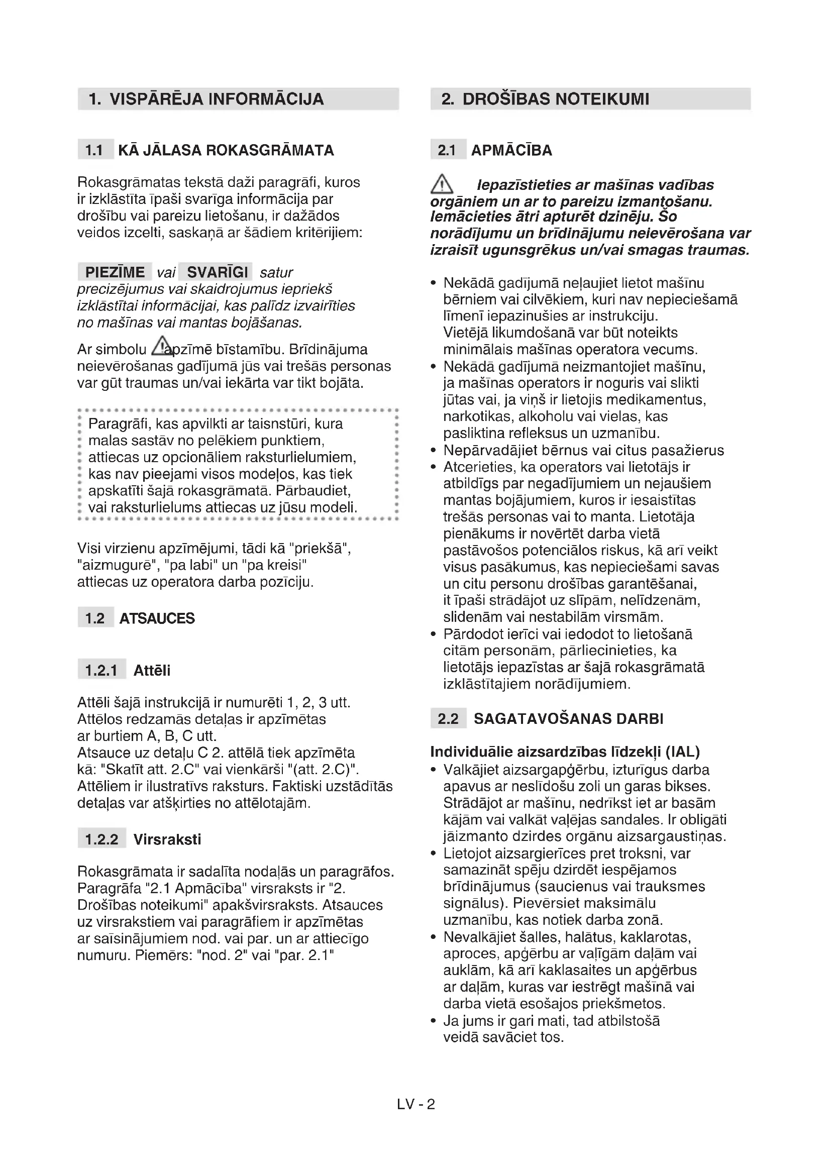 - Vienmēr turiet rokas un kājas tālu no pļaušanas ierīces, gan iedarbināšanas, gan darba laikā.LV - 4