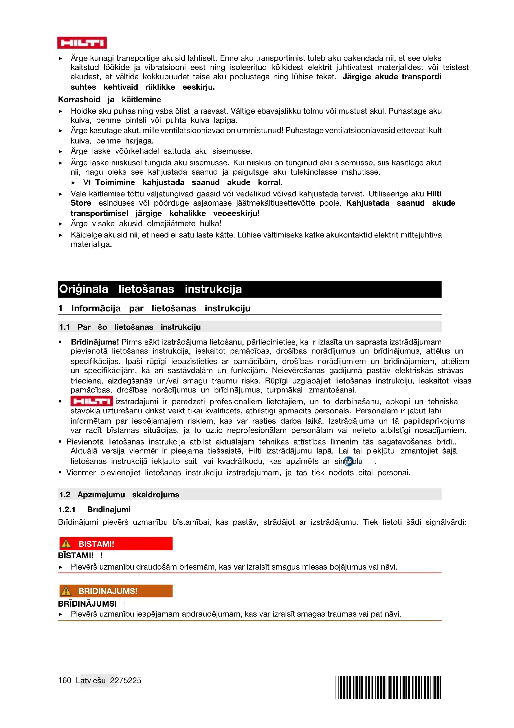 Akumulatorus nekādā gadījumā nedrīkst transportēt nenostiprinātā veidā, sabērtus kaudzēs. Transpor- tēšanas laikā akumulatori jāsargā no triecieniem un vibrācijas, kā arī jāizolē no jebkādiem materiāliem, kam piemīt elektriskā vadītspēja, un citiem akumulatoriem, lai nepieļautu to nonākšanu saskarē ar citu bateriju kontaktiem un īssavienojuma rašanos. Ievērojiet vietējos noteikumus par akumulatoru transportēšanu. Apkope un utilizācija ▶ Raugieties, lai akumulators ir tīrs, un nepieļaujiet tā savārtīšanu ar eļļu un smērvielām. Nepieļaujiet pārmērīgu putekļu un netīrumu uzkrāšanos uz akumulatora virsmām. Notīriet akumulatoru ar sausu, mīkstu otu vai tīru un sausu drāniņu. ▶ Nekādā gadījumā nelietojiet akumulatoru, ja ir nosprostotas tā ventilācijas atveres. Uzmanīgi iztīriet ventilācijas atveres ar sausu, mīkstu birstīti. ▶ Raugieties, lai akumulatora iekšienē neiekļūtu svešķermeņi. ▶ Nepieļaujiet mitruma iekļūšanu akumulatorā. Ja akumulatorā ir iekļuvis mitrums, tas jāuzskata par bojātu un jāizolē, ievietojot nedegoša materiāla tvertnē. ▶ Skat. nodaļu Rīcība akumulatoru bojājumu gadījumā. ▶ Ja utilizācija netiek veikta pareizā veidā, var izplūst kaitīgas gāzes un šķidrumi, kas apdraud veselību. Nododiet akumulatoru utilizācijai jūs apkalpojošajā Hilti Store vai vērsieties pie kompetentā atkritumu apsaimniekošanas uzņēmuma. Ievērojiet vietējos noteikumus par bojātu akumulatoru transportēša- nu! ▶ Neizmetiet akumulatorus sadzīves atkritumos. ▶ Utilizējiet akumulatorus tā, lai tiem nevarētu piekļūt bērni. Lai nepieļautu īssavienojumus, nosedziet pieslēguma kontaktus ar materiālu, kam nepiemīt elektriskā vadītspēja. Originali naudojimo instrukcija 1 Informacija apie naudojimo instrukciją