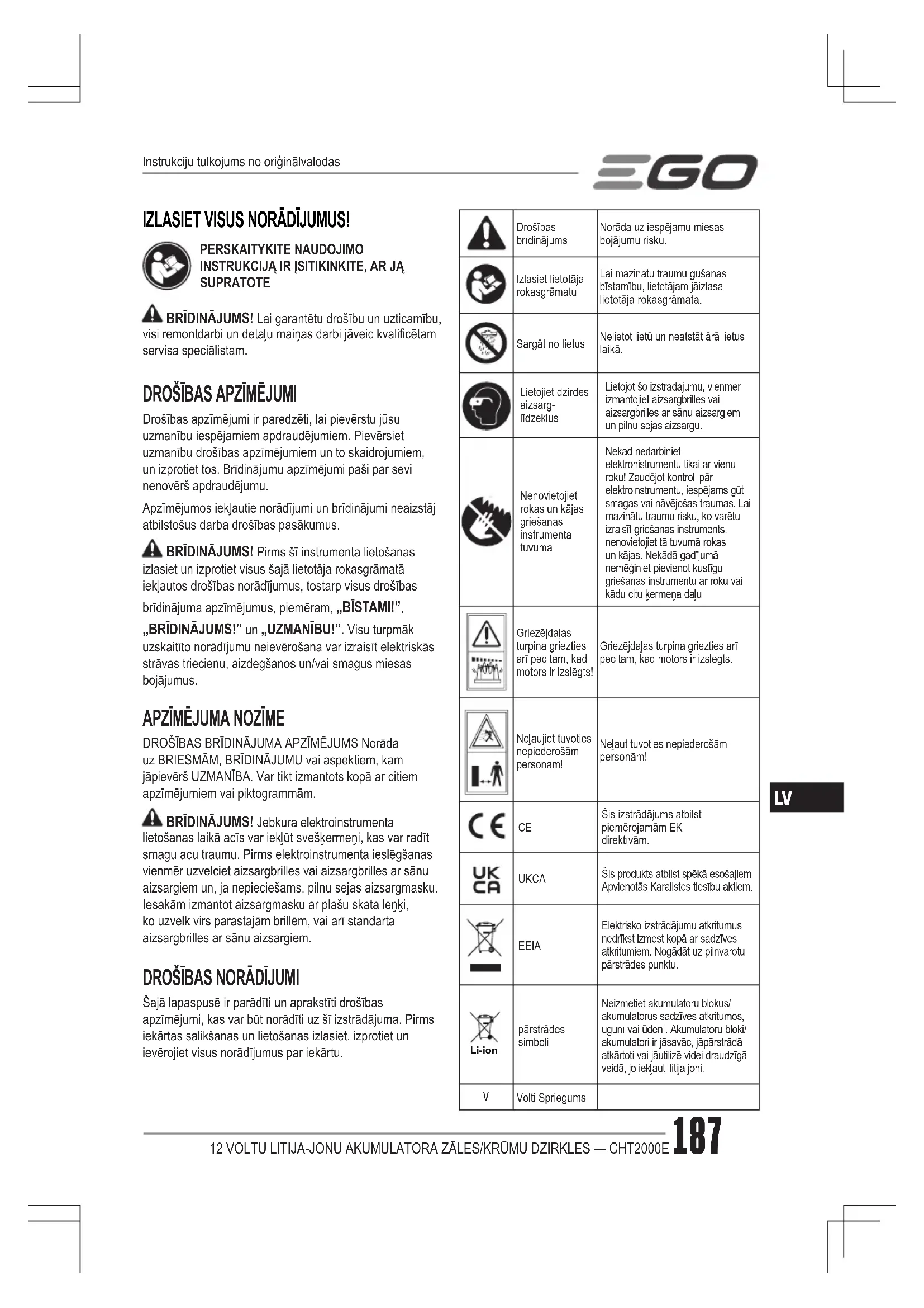 Šajā lapaspusē ir parādīti un aprakstīti drošības apzīmējumi, kas var būt norādīti uz šī izstrādājuma. Pirms iekārtas salikšanas un lietošanas izlasiet, izprotiet un ievērojiet visus norādījumus par iekārtu. Drošības brīdinājumsNorāda uz iespējamu miesas bojājumu risku.Izlasiet lietotāja rokasgrāmatuLai mazinātu traumu gūšanas bīstamību, lietotājam jāizlasa lietotāja rokasgrāmata.Sargāt no lietusNelietot lietū un neatstāt ārā lietus laikā.Lietojiet dzirdes aizsarg-līdzekļusLietojot šo izstrādājumu, vienmēr izmantojiet aizsargbrilles vai aizsargbrilles ar sānu aizsargiem un pilnu sejas aizsargu.Nenovietojiet rokas un kājas griešanas instrumenta tuvumāNekad nedarbiniet elektronistrumentu tikai ar vienu roku! Zaudējot kontroli pār elektroinstrumentu, iespējams gūt smagas vai nāvējošas traumas. Lai mazinātu traumu risku, ko varētu izraisīt griešanas instruments, nenovietojiet tā tuvumā rokas un kājas. Nekādā gadījumā nemēģiniet pievienot kustīgu griešanas instrumentu ar roku vai kādu citu ķermeņa daļuGriezējdaļas turpina griezties arī pēc tam, kad motors ir izslēgts!Griezējdaļas turpina griezties arī pēc tam, kad motors ir izslēgts.Neļaujiet tuvoties nepiederošām personām!Neļaut tuvoties nepiederošām personām! Šis izstrādājums atbilst piemērojamām EK direktīvām. UKCA Šis produkts atbilst spēkā esošajiem Apvienotās Karalistes tiesību aktiem. EEIA Elektrisko izstrādājumu atkritumus nedrīkst izmest kopā ar sadzīves atkritumiem. Nogādāt uz pilnvarotu pārstrādes punktu. Li-ion pārstrādes simboliNeizmetiet akumulatoru blokus/akumulatorus sadzīves atkritumos, ugunī vai ūdenī. Akumulatoru bloki/akumulatori ir jāsavāc, jāpārstrādā atkārtoti vai jāutilizē videi draudzīgā veidā, jo iekļauti litija joni. Volti Spriegums Instrukciju tulkojums no oriģinālvalodas12 VOLTU LITIJA-JONU AKUMULATORA ZĀLES/KRŪMU DZIRKLES — CHT2000E188