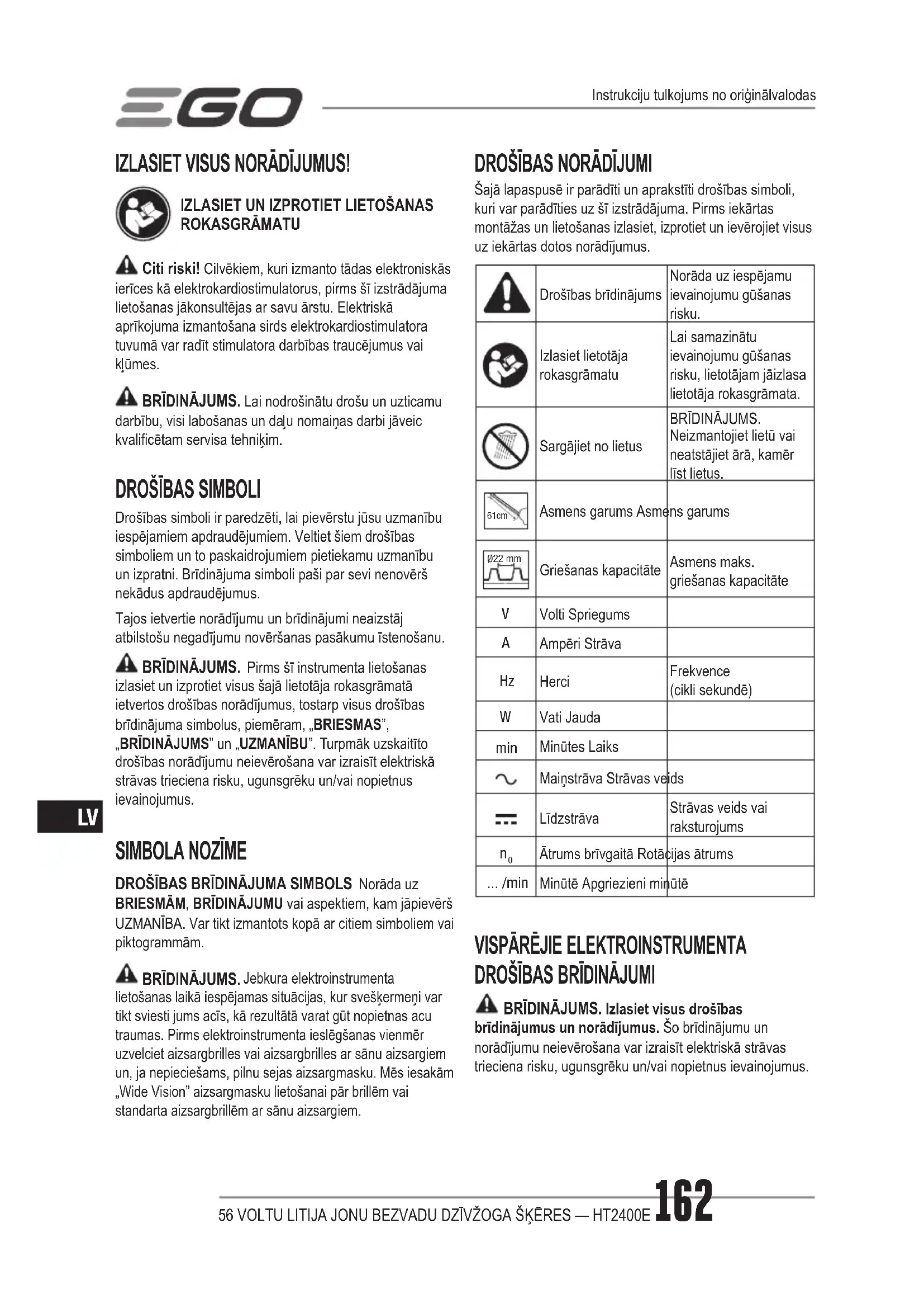 BRĪDINĀJUMS. Pirms darba pārbaudiet, vai dzīvžogā neslēpjas svešķermeņi, piemēram, drāšu žogs. Izmantojiet dzīvžogu trimmeri tikai ar pareizi uzstādītu aizsargu. Dzīvžogu trimmera izmantošana bez atbilstoša aizsarga var radīt nopietnus ievainojumus! SVARĪGI DROŠĪBAS NORĀDĪJUMI ◾ Nedarbiniet akumulatora dzīvžoga trimmeri lietū. ◾ Neuzlādējiet akumulatoru lietū vai mitrās vietās. ◾ Izmantojiet tikai A attēlā uzskaitītos akumulatora blokus un lādētājus. ◾ Paceļot vai turot dzīvžogu trimmeri, nesatveriet tā atklātos griešanas asmeņus vai griezējmalas. ◾ Nedarbiniet to, kamēr atrodaties uz kāpnēm, jumta, kokā vai uz citām nestabilām pamatnēm. Stabila stāja uz stingras pamatnes ļauj labāk kontrolēt dzīvžogu trimmeri negaidītās situācijās. ◾ Nekad neļaujiet bērniem darbināt dzīvžogu trimmeri. ◾ Nekad nenoņemiet drošības ierīces un neiejaucieties to darbībā. Regulāri pārbaudiet, vai tās atbilstoši darbojas. Nekad neveiciet darbības, kas iejaucas drošības ierīču paredzētajās funkcijās vai samazina to sniegto aizsardzību. ◾ Nekad nedarbiniet dzīvžoga trimmeri, ja nav uzstādīti atbilstoši aizsargi, plāksnes un citas aizsargierīces. ◾ Konstatējot bojājumus, pirms dzīvžogu trimmera turpmākas lietošanas pārbaudiet bojātās daļas. Aizsargs vai jebkura cita bojāta daļa ir rūpīgi jāpārbauda, lai noteiktu, vai tā darbosies pareizi un spēs pildīt savu funkciju. Pārbaudiet kustīgo daļu novietojumu un savienojumus, daļu bojājumus, montāžu un citus apstākļus, kas var ietekmēt instrumenta darbību. Aizsargu vai jebkuru citu bojātu daļu drīkst labot vai nomainīt tikai pilnvarots servisa centrs, ja vien šajā rokasgrāmatā nav norādīts citādāk. ◾ Regulāros intervālos pārbaudiet, vai asmens un dzinēja uzstādīšanas bultskrūves nav kļuvušas vaļīgas. Tāpat vizuāli pārbaudiet, vai asmens nav bojāts (piemēram, saliekts, ieplaisājis vai nodilis). Nomainiet asmeni tikai pret EGO asmeni. ◾ Nomainiet asmeni, ja tas ir saliekts vai ieplaisājis. Nelīdzsvarots asmens var radīt vibrācijas, kas var izraisīt dzinēja piedziņas mehānisma bojājumus vai ievainojumus. ◾ Ja aprīkojums sāk neierasti vibrēt, apturiet dzinēju un nekavējoties nosakiet cēloni. Vibrēšana parasti brīdina par briesmām. ◾ Trimmers ir paredzēts zaru, kuri nav biezāki par (22 m), apgriešanai. ◾ Strādājiet tikai dienas laikā vai labā mākslīgajā apgaismojumā. ◾ Pirms apkopes un uzturēšanas darbu veikšanas, tīrīšanas vai dzīvžogu trimmerī iestrēguša materiāla iztīrīšanas izņemiet vai atvienojiet akumulatoru. ◾ Nemazgājiet trimmeri ar šļūteni, sargājiet no ūdens iekļūšanas dzinējā un elektriskajos savienojumos. ◾ Veicot iekārtas apkopes un uzturēšanas darbus, izmantojiet tikai identiskas rezerves daļas, kas norādītas šajā rokasgrāmatā. Daļu, kas neatbilst oriģinālā aprīkojuma specikācijām, izmantošana var radīt neatbilstošu instrumenta veiktspēju un apdraudēt tā drošību. ◾ Ievērojiet eļļošanas un piederumu maiņas norādījumus. ◾ Nodrošiniet, ka rokturi ir sausi, tīri un uz tiem nav eļļas vai tauku. ◾ Saglabājiet šos norādījumus. Regulāri pārlasiet tos un izmantojiet tos, lai instruētu citas personas, kuras izmantos šo instrumentu. Ja aizdodat šo instrumentu kādam citam, līdzi dodiet arī šos norādījumus, lai palīdzētu novērst izstrādājuma neatbilstošu izmantošanu un iespējamus ievainojumus. SAGLABĀJIET ŠOS NORĀDĪJUMUS! SPECIFIKĀCIJAS Spriegums56 V Ātrums, strādājot bez slodzes 1300 /minAsmens garums 61 cmGriešanas kapacitāte 22 mmIeteicamā darba temperatūra 0°C–40°CIeteicamā uzglabāšanas temperatūra -20°C-70°CSvars (bez akumulatoru komplekta) 2,79 kgIzmērītais trokšņa jaudas līmenis L 90,65 dB(A)