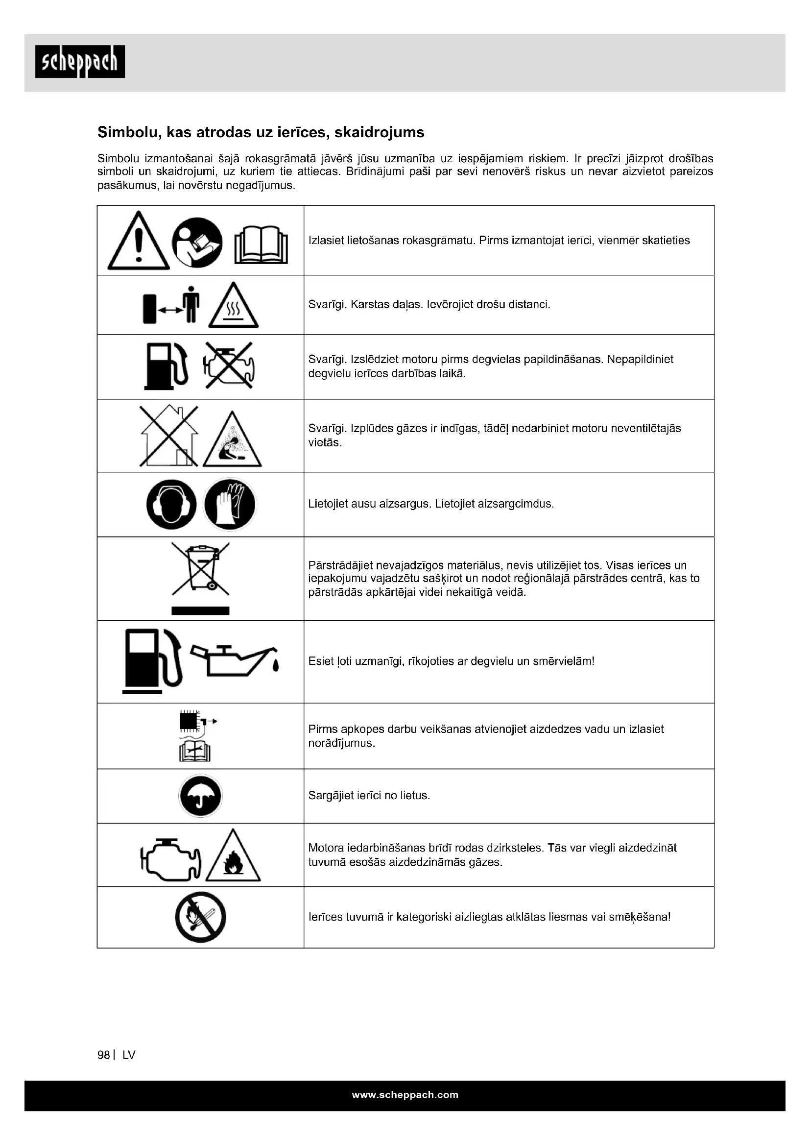 Simbolu, kas atrodas uz ierīces, skaidrojums Simbolu izmantošanai šajā rokasgrāmatā jāvērš jūsu uzmanība uz iespējamiem riskiem. Ir precīzi jāizprot drošības simboli un skaidrojumi, uz kuriem tie attiecas. Brīdinājumi paši par sevi nenovērš riskus un nevar aizvietot pareizos pasākumus, lai novērstu negadījumus. Izlasiet lietošanas rokasgrāmatu. Pirms izmantojat ierīci, vienmēr skatieties Svarīgi. Karstas daļas. Ievērojiet drošu distanci. Svarīgi. Izslēdziet motoru pirms degvielas papildināšanas. Nepapildiniet degvielu ierīces darbības laikā. Svarīgi. Izplūdes gāzes ir indīgas, tādēļ nedarbiniet motoru neventilētajās vietās. Lietojiet ausu aizsargus. Lietojiet aizsargcimdus. Pārstrādājiet nevajadzīgos materiālus, nevis utilizējiet tos. Visas ierīces un iepakojumu vajadzētu sašķirot un nodot reģionālajā pārstrādes centrā, kas to pārstrādās apkārtējai videi nekaitīgā veidā. Esiet ļoti uzmanīgi, rīkojoties ar degvielu un smērvielām! Pirms apkopes darbu veikšanas atvienojiet aizdedzes vadu un izlasiet norādījumus. Sargājiet ierīci no lietus. Motora iedarbināšanas brīdī rodas dzirksteles. Tās var viegli aizdedzināt tuvumā esošās aizdedzināmās gāzes. Ierīces tuvumā ir kategoriski aizliegtas atklātas liesmas vai smēķēšana!www.scheppach.com
