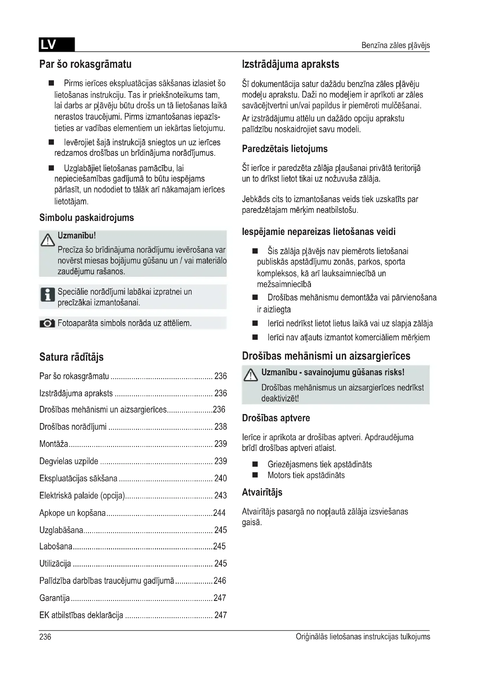 - EKatbilstībasdeklarācija Par šo rokasgrāmatu Pirmsierīcesekspluatācijassākšanasizlasietšo lietošanas instrukciju. Tas ir priekšnoteikums tam, laidarbsarpļāvējubūtudrošsuntālietošanaslaikā nerastostraucējumi.Pirmsizmantošanasiepazīs- tietiesarvadībaselementiemuniekārtaslietojumu. Ievērojietšajāinstrukcijāsniegtosunuzierīces redzamosdrošībasunbrīdinājumanorādījumus. Uzglabājietlietošanaspamācību,lai nepieciešamībasgadījumātobūtuiespējams pārlasīt,unnododiettotālākarīnākamajamierīces lietotājam. Simbolu paskaidrojums Uzmanību! Precīzašobrīdinājumanorādījumuievērošanavar novērstmiesasbojājumugūšanuun/vaimateriālo zaudējumurašanos. Speciālienorādījumilabākaiizpratneiun precīzākaiizmantošanai. Fotoaparātasimbolsnorādauzattēliem. Izstrādājuma apraksts Šīdokumentācijasaturdažādubenzīnazālespļāvēju modeļuaprakstu.Dažinomodeļiemiraprīkotiarzāles savācējtvertniun/vaipapildusirpiemērotimulčēšanai. Arizstrādājumuattēluundažādoopcijuaprakstu palīdzībunoskaidrojietsavumodeli. Paredzētais lietojums Šīierīceirparedzētazālājapļaušanaiprivātāteritorijā untodrīkstlietottikaiuznožuvušazālāja. Jebkādscitstoizmantošanasveidstiekuzskatītspar paredzētajammērķimneatbilstošu. Iespējamie nepareizas lietošanas veidi Šiszālājapļāvējsnavpiemērotslietošanai publiskāsapstādījumuzonās,parkos,sporta kompleksos,kāarīlauksaimniecībāun mežsaimniecībā Drošībasmehānismudemontāžavaipārvienošana ir aizliegta Ierīcinedrīkstlietotlietuslaikāvaiuzslapjazālāja Ierīcinavatļautsizmantotkomerciāliemmērķiem Drošības mehānismi un aizsargierīces Uzmanību - savainojumu gūšanas risks! Drošībasmehānismusunaizsargierīcesnedrīkst deaktivizēt! Drošības aptvere Ierīceiraprīkotaardrošībasaptveri.Apdraudējuma brīdīdrošībasaptveriatlaist. Griezējasmenstiekapstādināts Motorstiekapstādināts Atvairītājs Atvairītājspasargānonopļautāzālājaizsviešanas gaisā.LV p. 247