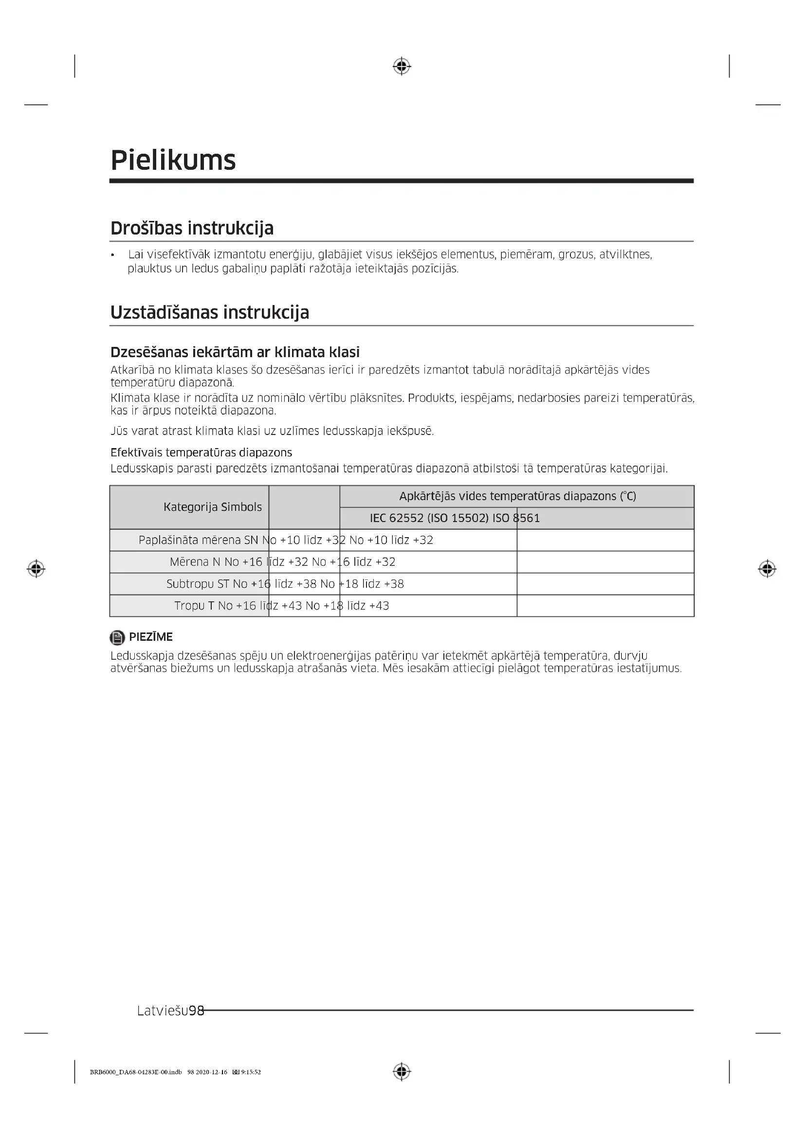 Paplašināta mērena SN No +10 līdz +32 No +10 līdz +32 Mērena N No +16 līdz +32 No +16 līdz +32 Subtropu ST No +16 līdz +38 No +18 līdz +38 Tropu T No +16 līdz +43 No +18 līdz +43 PIEZĪME Ledusskapja dzesēšanas spēju un elektroenerģijas patēriņu var ietekmēt apkārtējā temperatūra, durvju atvēršanas biežums un ledusskapja atrašanās vieta. Mēs iesakām attiecīgi pielāgot temperatūras iestatījumus. BRB6000_DA68-04283E-00.indb 98 2020-12-16 9:15:52Latviešu 99 Temperatūras instrukcija Ieteicamā temperatūra Optimālais temperatūras iestatījums pārtikas glabāšanai:
