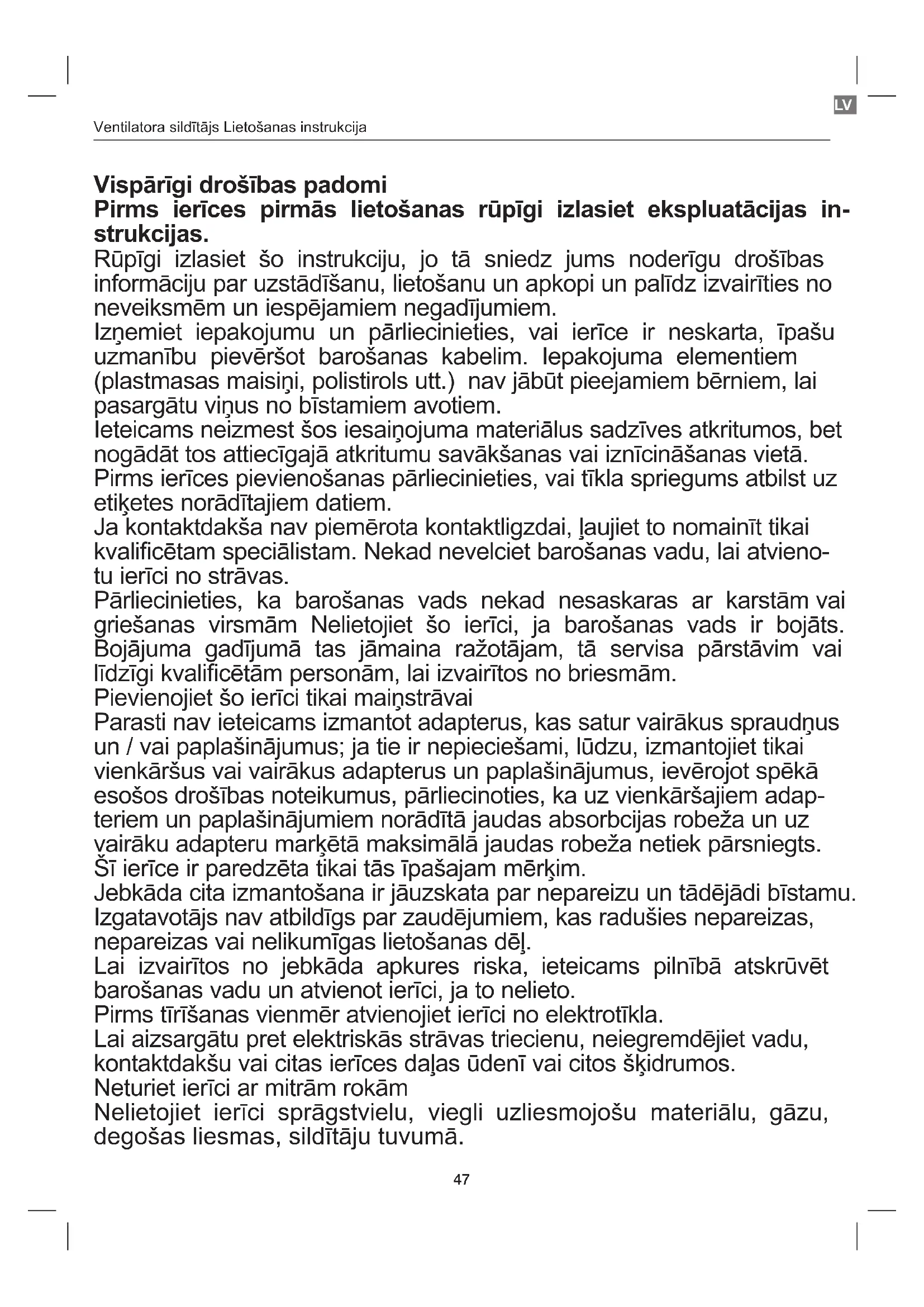 Vispārīgi drošības padomi Pirms ierīces pirmās lietošanas rūpīgi izlasiet ekspluatācijas in- strukcijas. Rūpīgi izlasiet šo instrukciju, jo tā sniedz jums noderīgu drošības informāciju par uzstādīšanu, lietošanu un apkopi un palīdz izvairīties no neveiksmēm un iespējamiem negadījumiem. Izņemiet iepakojumu un pārliecinieties, vai ierīce ir neskarta, īpašu uzmanību pievēršot barošanas kabelim. Iepakojuma elementiem (plastmasas maisiņi, polistirols utt.) nav jābūt pieejamiem bērniem, lai pasargātu viņus no bīstamiem avotiem. Ieteicams neizmest šos iesaiņojuma materiālus sadzīves atkritumos, bet nogādāt tos attiecīgajā atkritumu savākšanas vai iznīcināšanas vietā. Pirms ierīces pievienošanas pārliecinieties, vai tīkla spriegums atbilst uz etiķetes norādītajiem datiem. Ja kontaktdakša nav piemērota kontaktligzdai, ļaujiet to nomainīt tikai kvalicētam speciālistam. Nekad nevelciet barošanas vadu, lai atvieno- tu ierīci no strāvas. Pārliecinieties, ka barošanas vads nekad nesaskaras ar karstām vai griešanas virsmām Nelietojiet šo ierīci, ja barošanas vads ir bojāts. Bojājuma gadījumā tas jāmaina ražotājam, tā servisa pārstāvim vai līdzīgi kvalicētām personām, lai izvairītos no briesmām. Pievienojiet šo ierīci tikai maiņstrāvai Parasti nav ieteicams izmantot adapterus, kas satur vairākus spraudņus un / vai paplašinājumus; ja tie ir nepieciešami, lūdzu, izmantojiet tikai vienkāršus vai vairākus adapterus un paplašinājumus, ievērojot spēkā esošos drošības noteikumus, pārliecinoties, ka uz vienkāršajiem adap- teriem un paplašinājumiem norādītā jaudas absorbcijas robeža un uz vairāku adapteru marķētā maksimālā jaudas robeža netiek pārsniegts. Šī ierīce ir paredzēta tikai tās īpašajam mērķim. Jebkāda cita izmantošana ir jāuzskata par nepareizu un tādējādi bīstamu. Izgatavotājs nav atbildīgs par zaudējumiem, kas radušies nepareizas, nepareizas vai nelikumīgas lietošanas dēļ. Lai izvairītos no jebkāda apkures riska, ieteicams pilnībā atskrūvēt barošanas vadu un atvienot ierīci, ja to nelieto. Pirms tīrīšanas vienmēr atvienojiet ierīci no elektrotīkla. Lai aizsargātu pret elektriskās strāvas triecienu, neiegremdējiet vadu, kontaktdakšu vai citas ierīces daļas ūdenī vai citos šķidrumos. Neturiet ierīci ar mitrām rokām Nelietojiet ierīci sprāgstvielu, viegli uzliesmojošu materiālu, gāzu, degošas liesmas, sildītāju tuvumā.Ventilatora sildītājs Lietošanas instrukcija